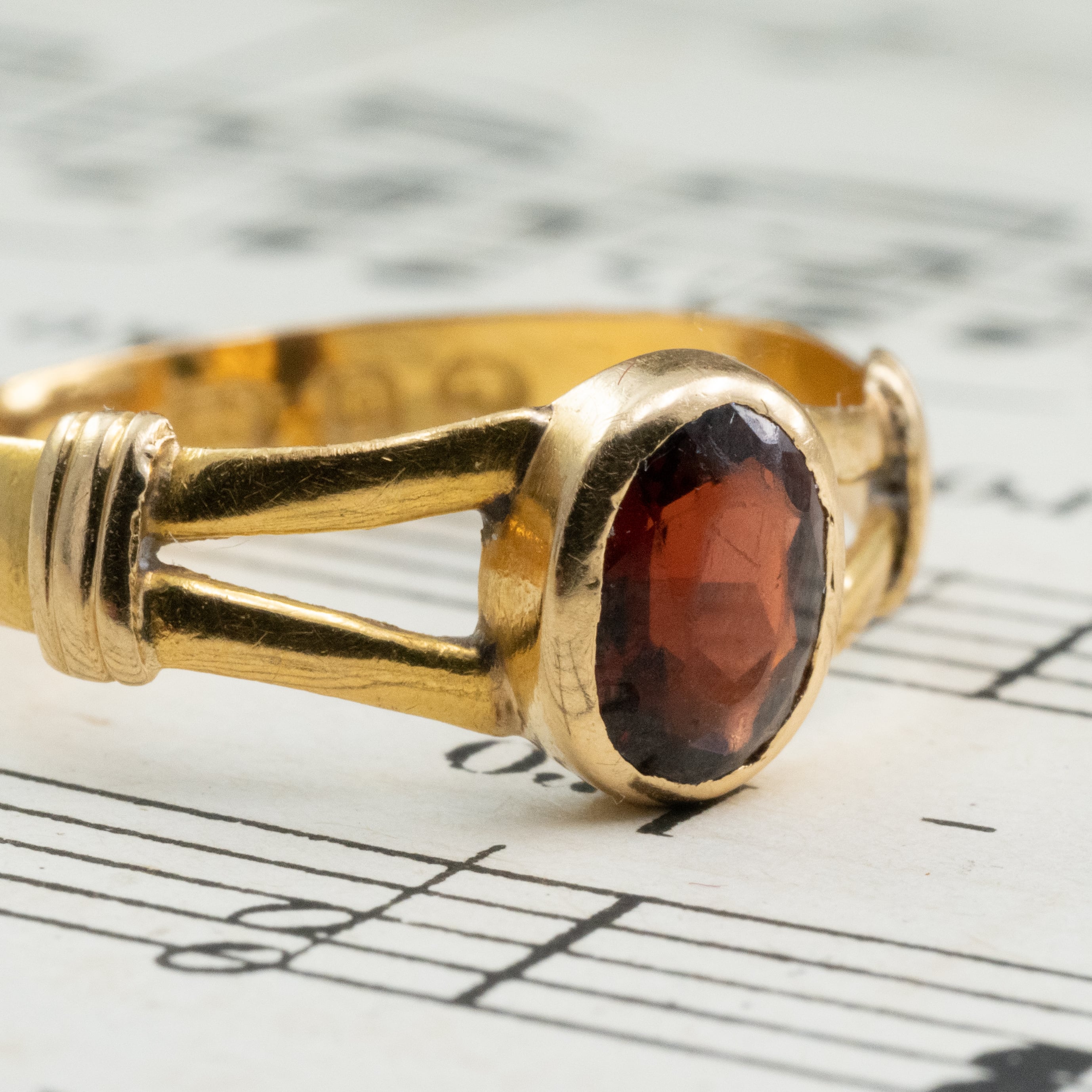 温かみのあるゴールドに包まれた、オーバルカットのガーネットが印象的なリング。