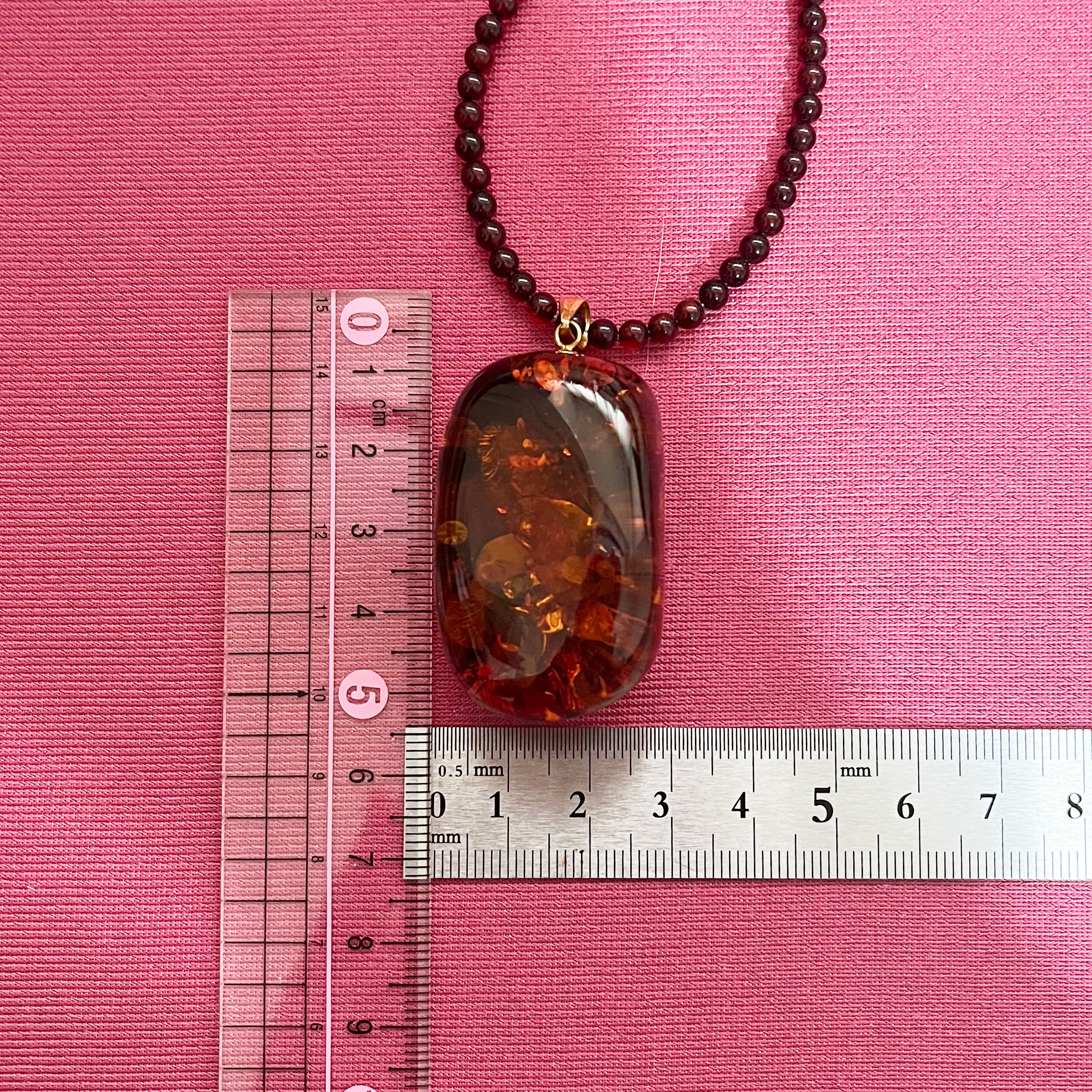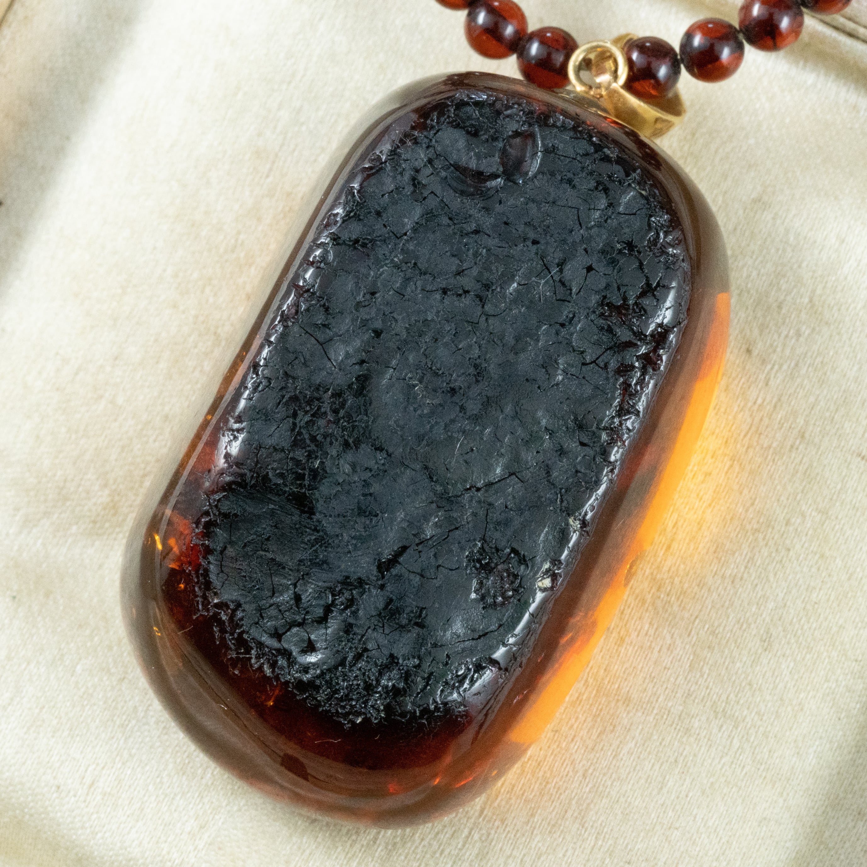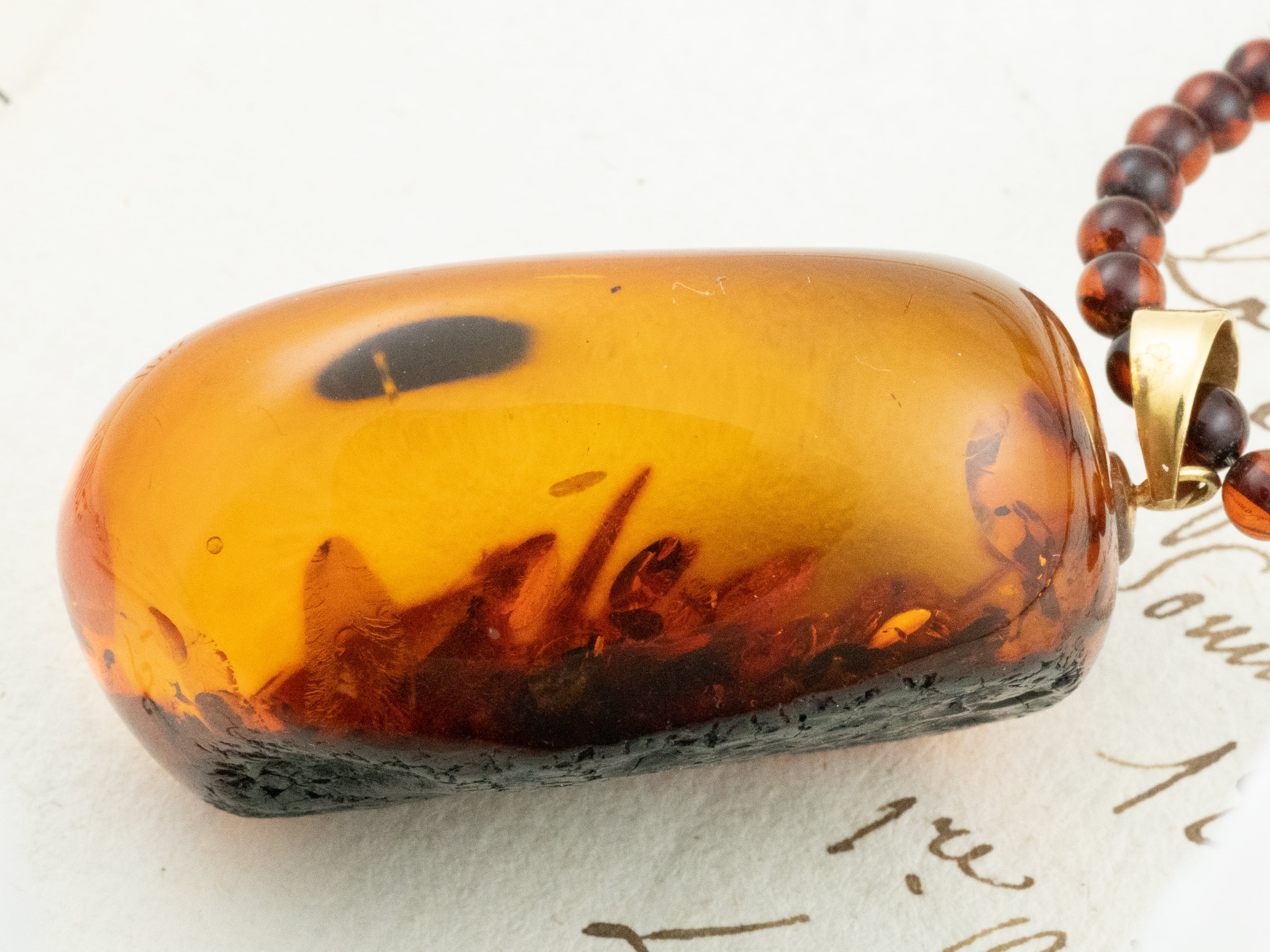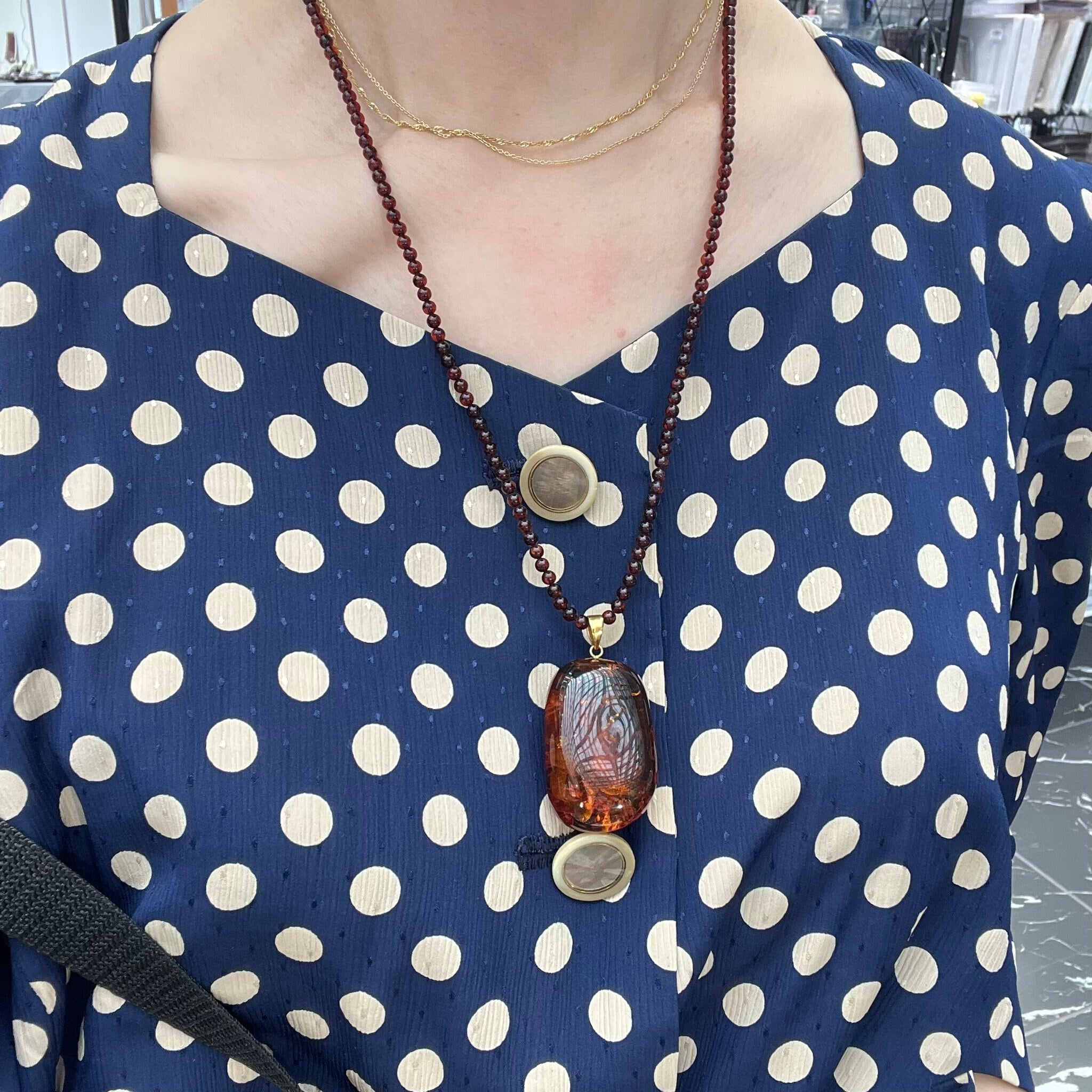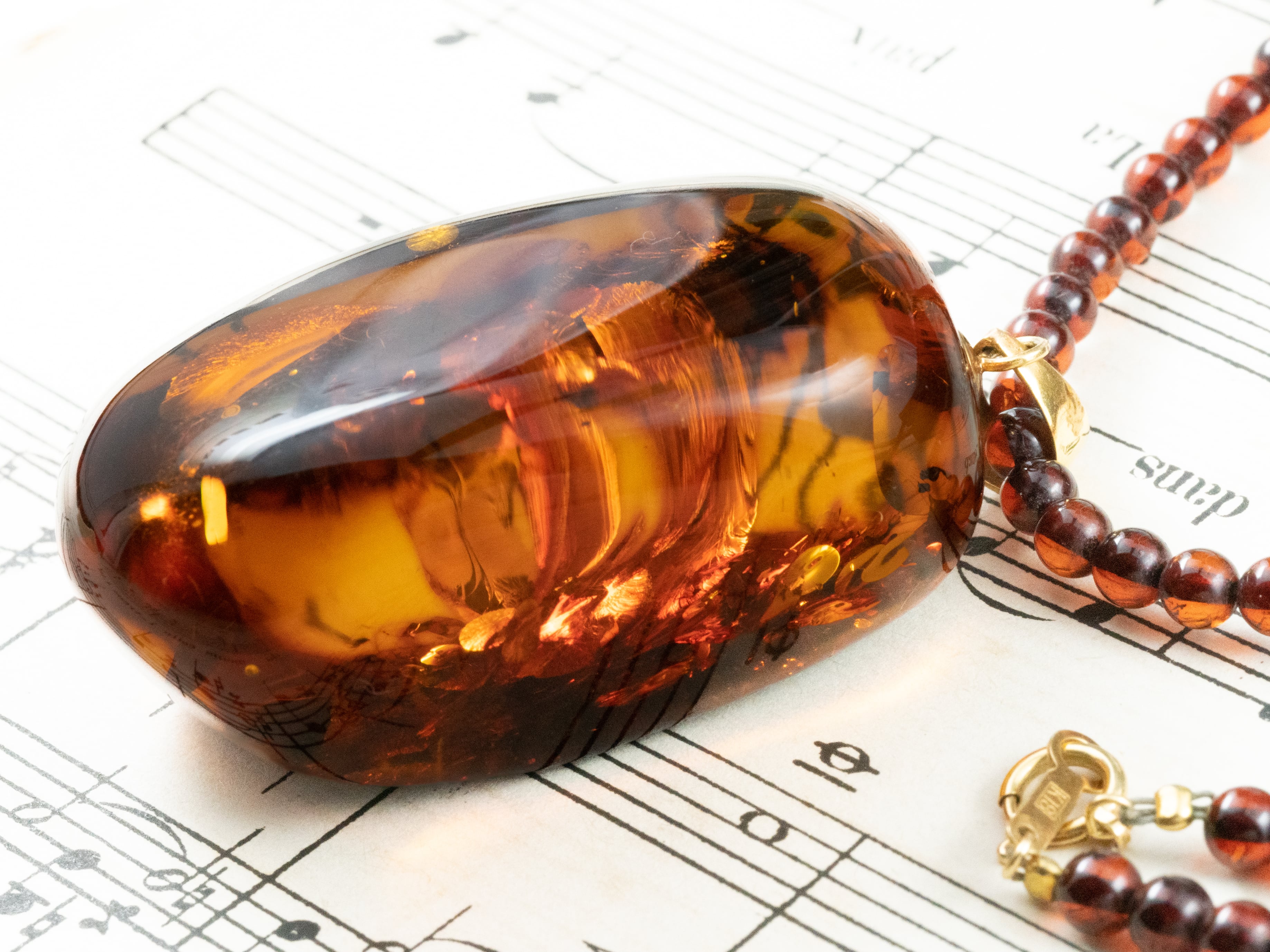 さらに、ペンダントトップだけでなく、ネックレス部分にも琥珀ビーズを使用。