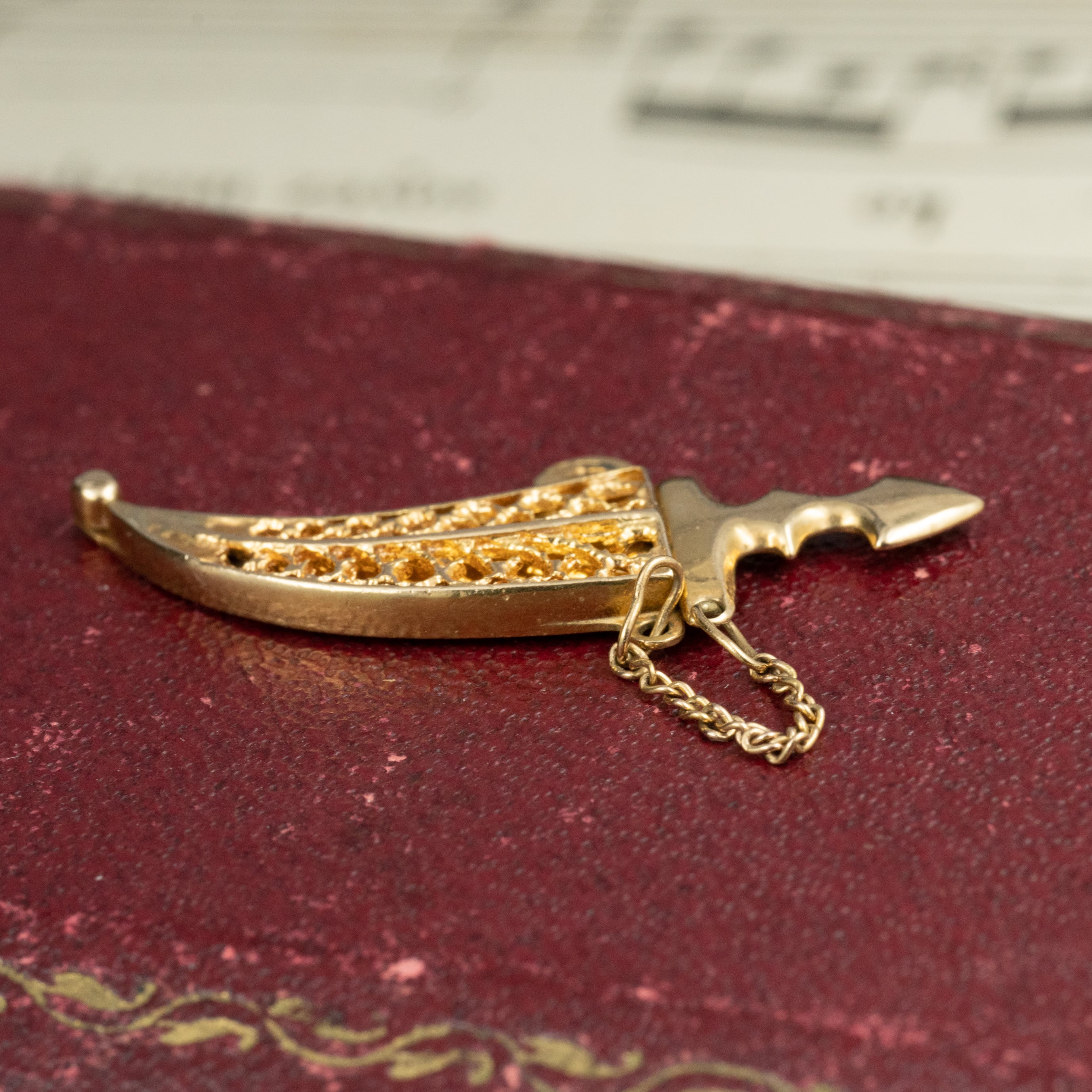 鞘(さや)部分には、極細の金線を編み込んだフィリグリーが施されており、まるで金のレースをまとったかのような美しさです。