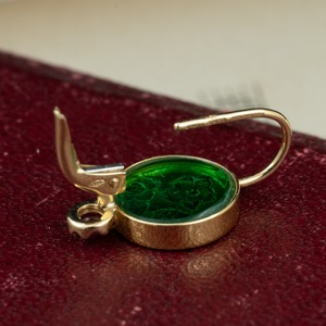 こちらのピアスも緑のガラスインタリオに花が彫られ、ルビーがあしらわれたクラシカルながらも個性がきらりと光る作品♪