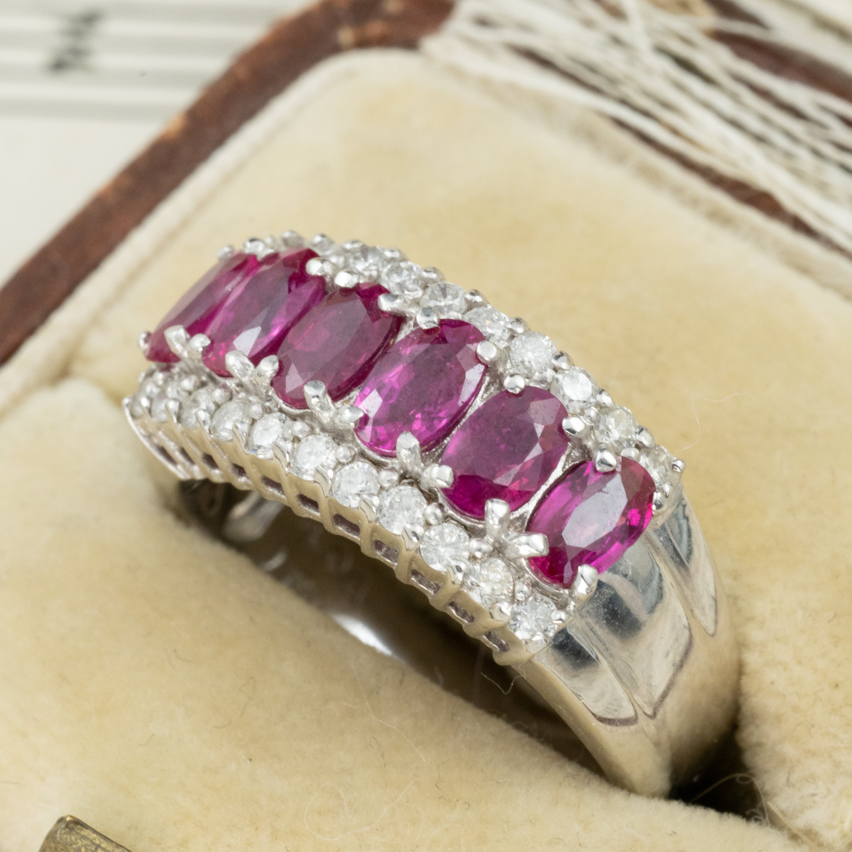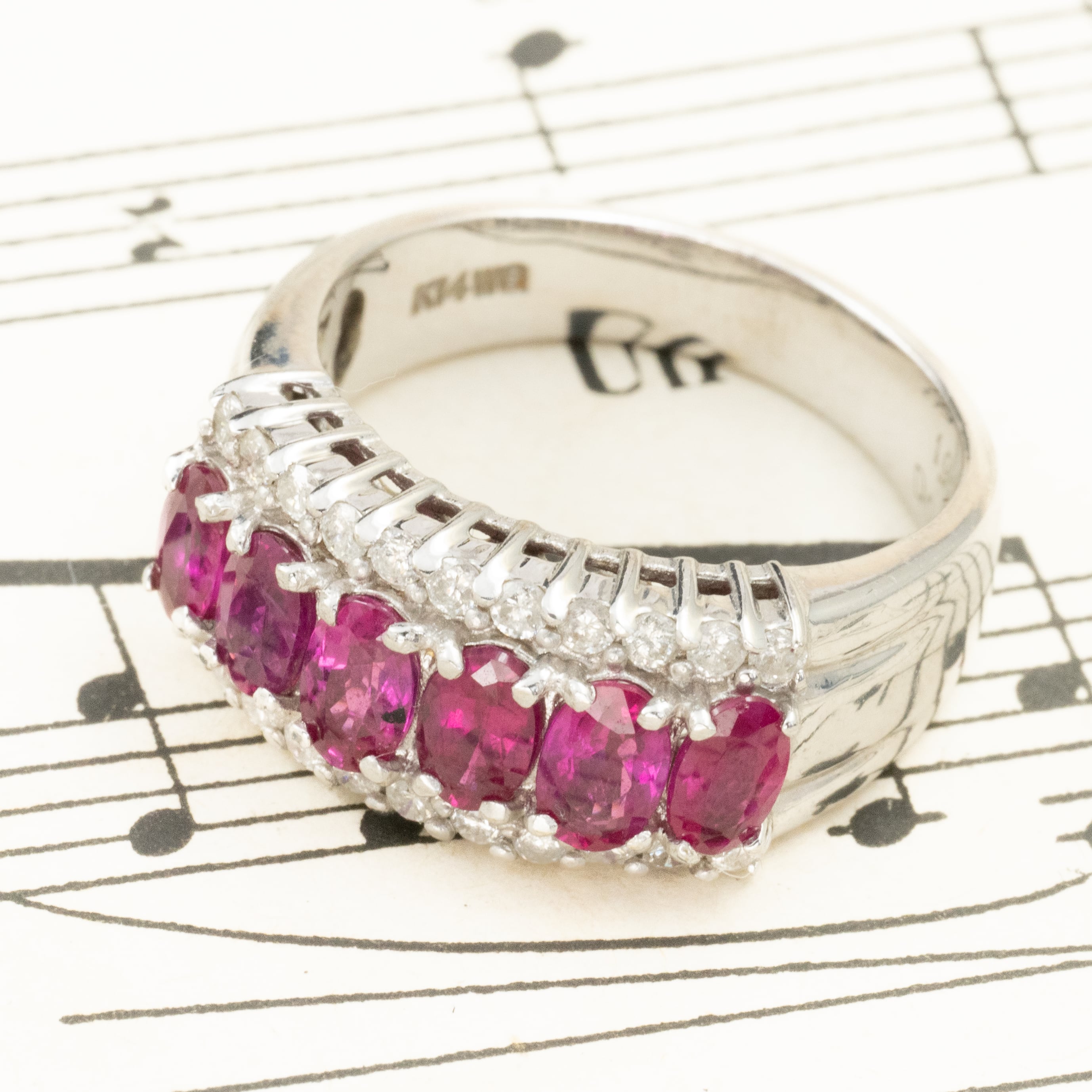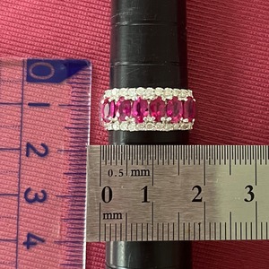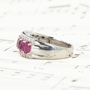 ルビーはおよそ5.2×3.2mm×6石が一文字にセットされその上下をメレダイヤが囲っています。