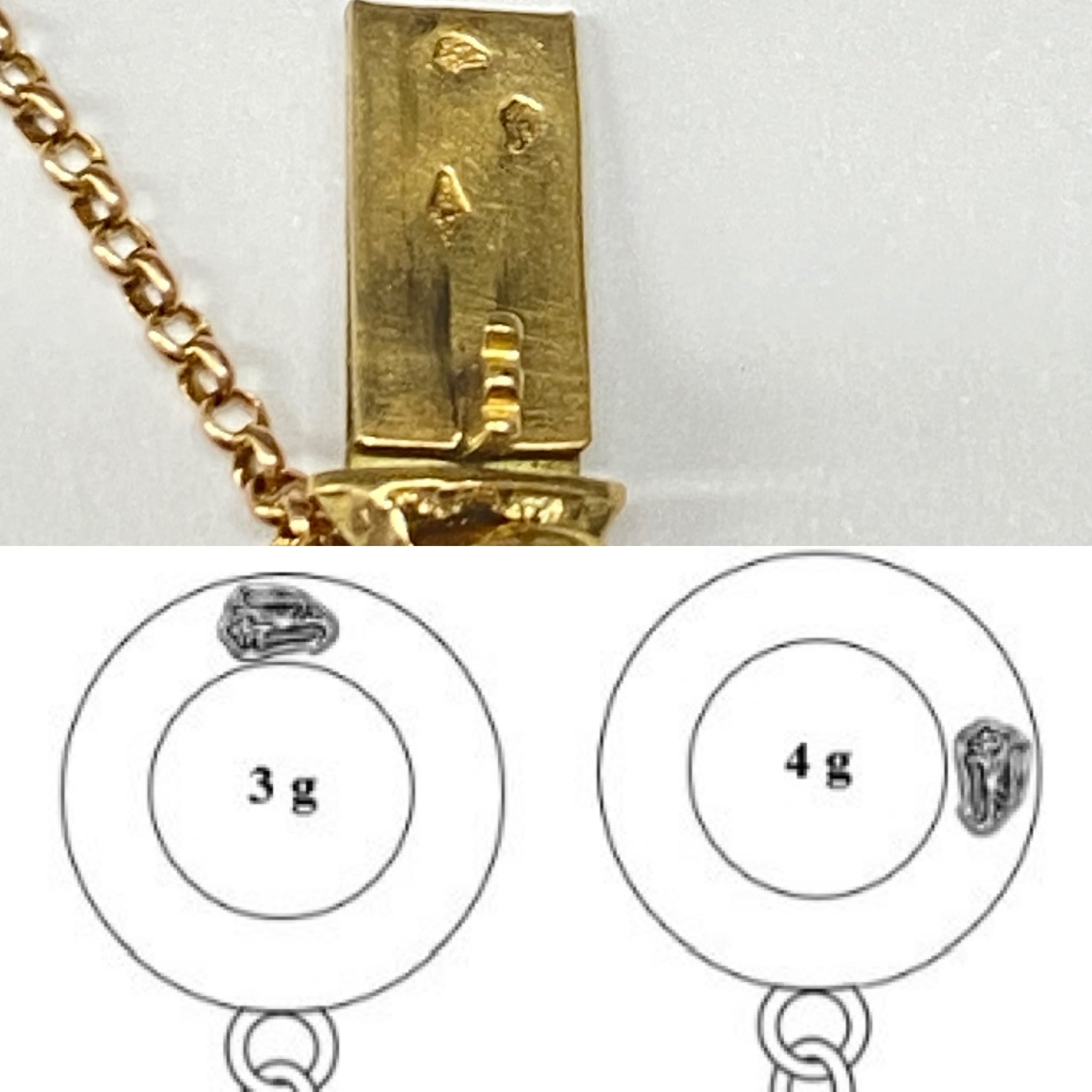マーユと完璧に調和する受金具には、フランス18金以上を示すイーグルヘッド刻印が直角に二つ並んで打たれており、これは「3g」と「4g」を合計した 7g の重量刻印を意味するものと考えられます。