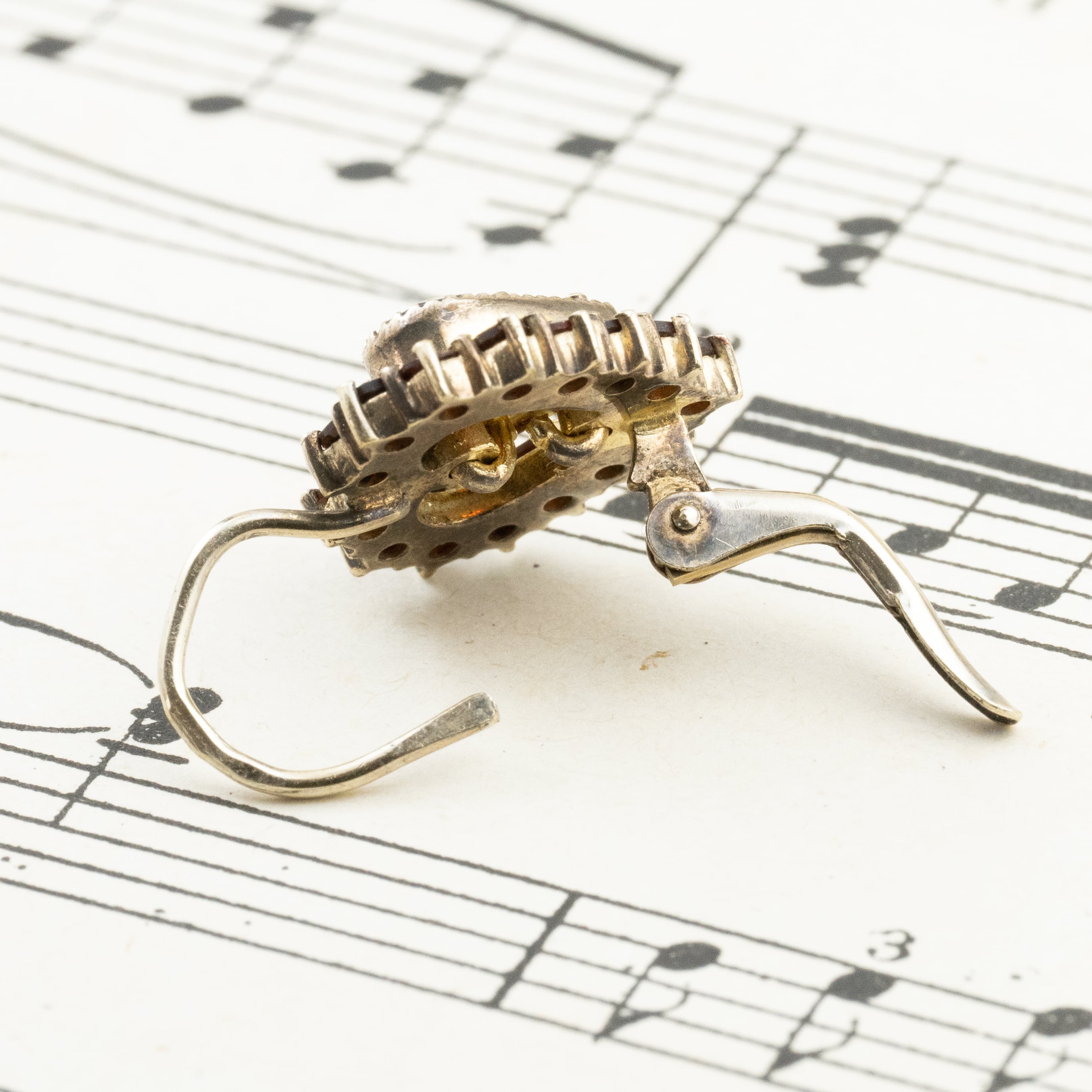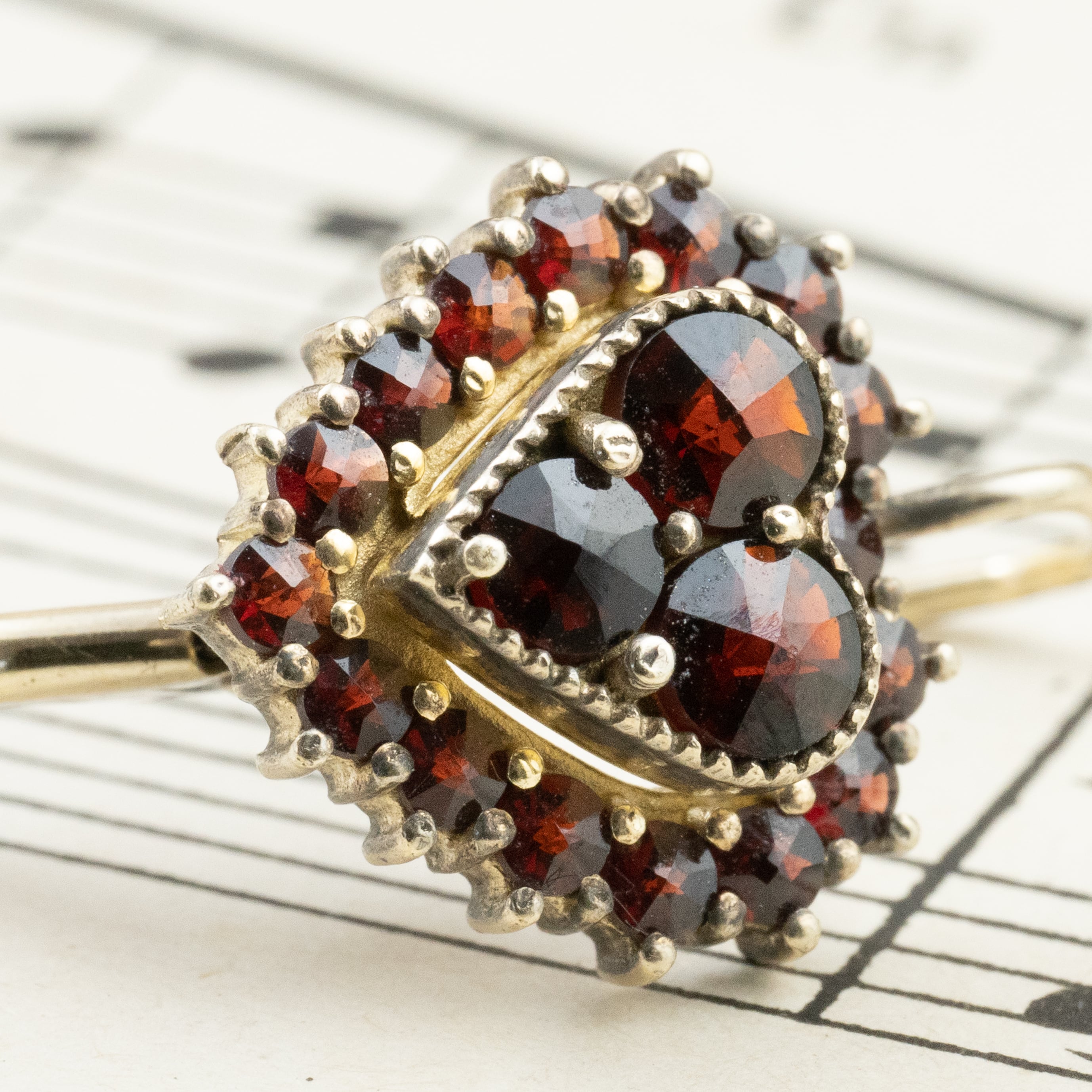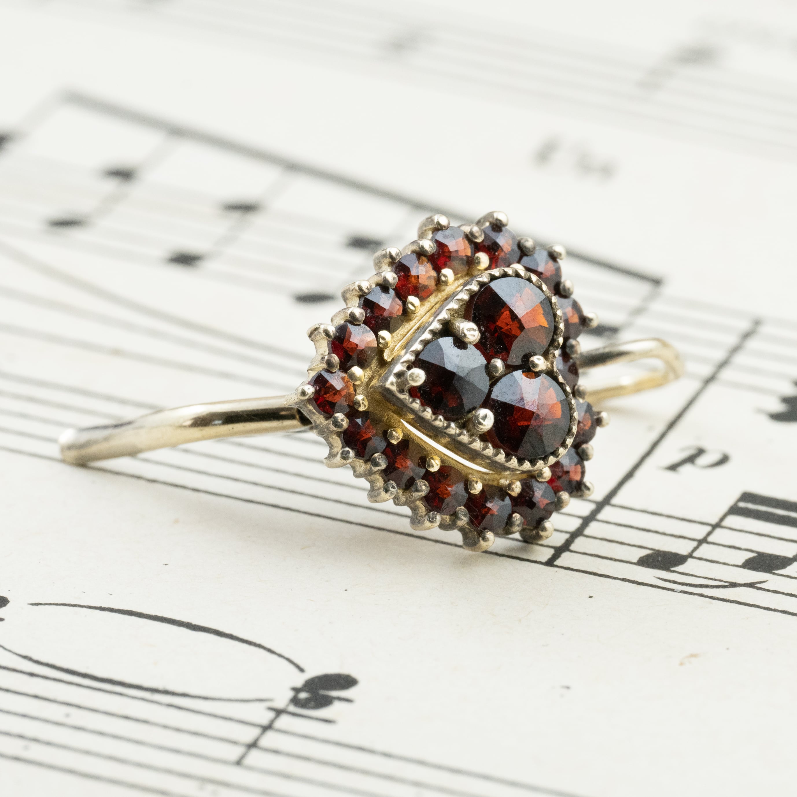 中央の?部分には大き目のガーネットが3粒留められており、周囲の?には小粒のガーネットが取り囲んでいて、思わず見てしまうような印象的で目を惹く可憐なデザインがポイント♪