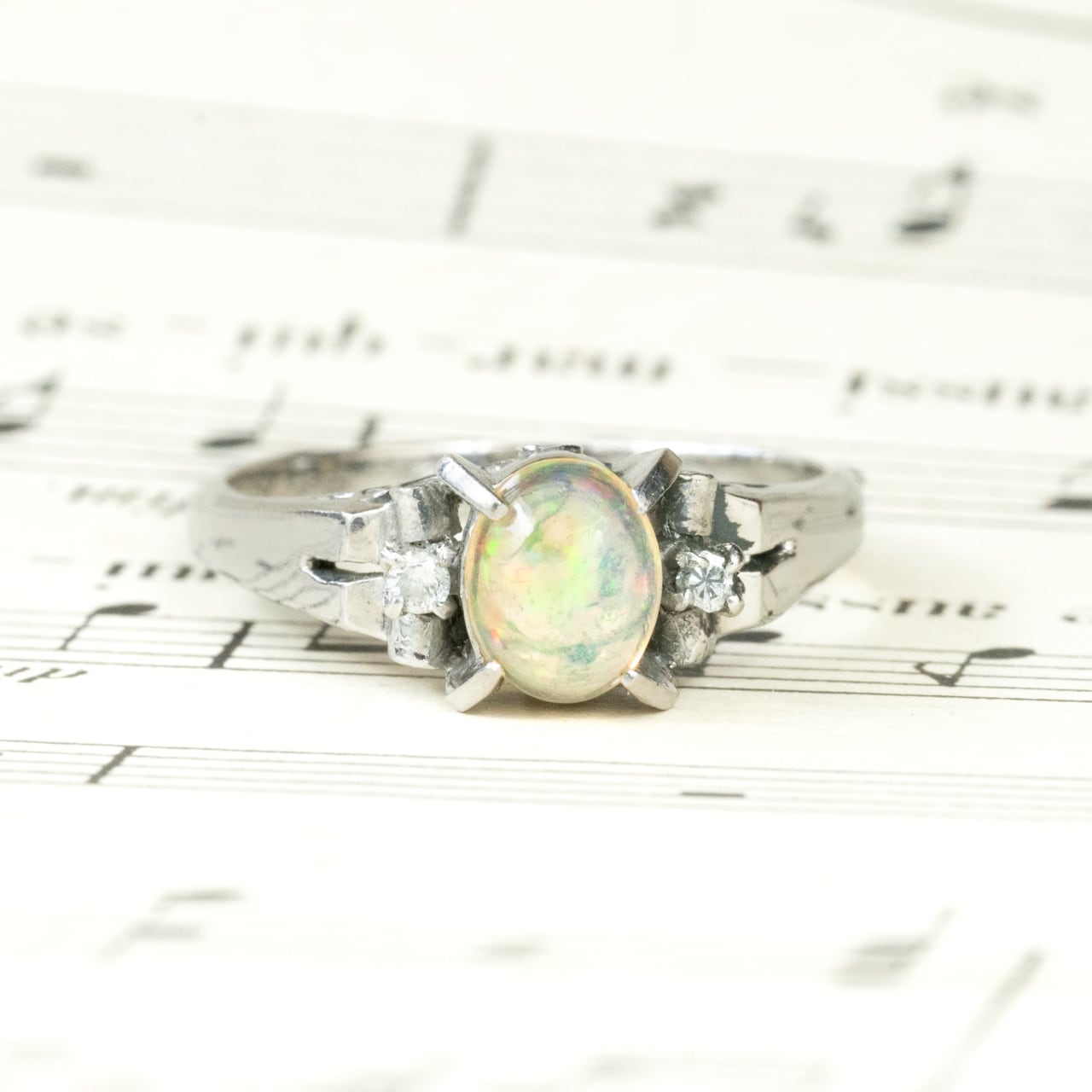 【日本の作品】昭和レトロ 透かし デザイン ヴィンテージ リング Pt900 オパール 0.57 ダイヤ 0.04 ~オパールの遊色と透かしデザインのレトロデザインの持つ魅力~ OKR00217