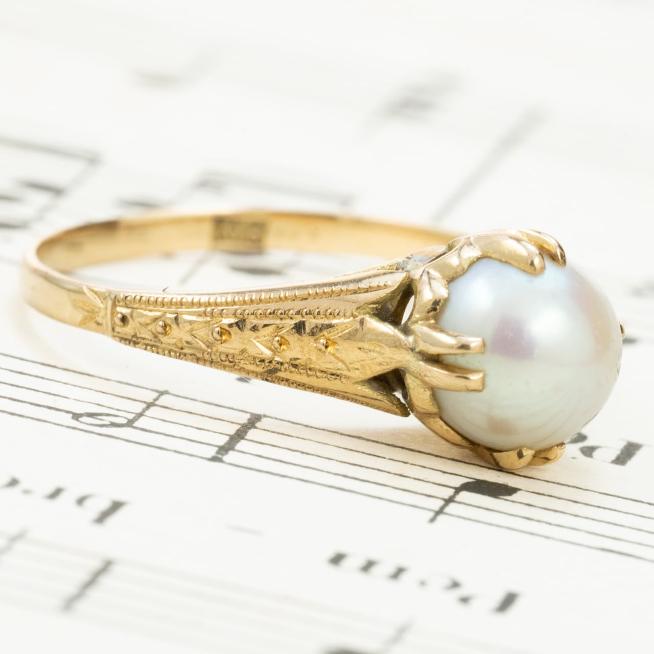 【日本の作品】昭和レトロ 和彫り ミル打ちデザイン ヴィンテージ リング  K18 手彫り 真珠 パール 7mm程 ~時を纏うような美しいレトロジュエリー~ MR00786