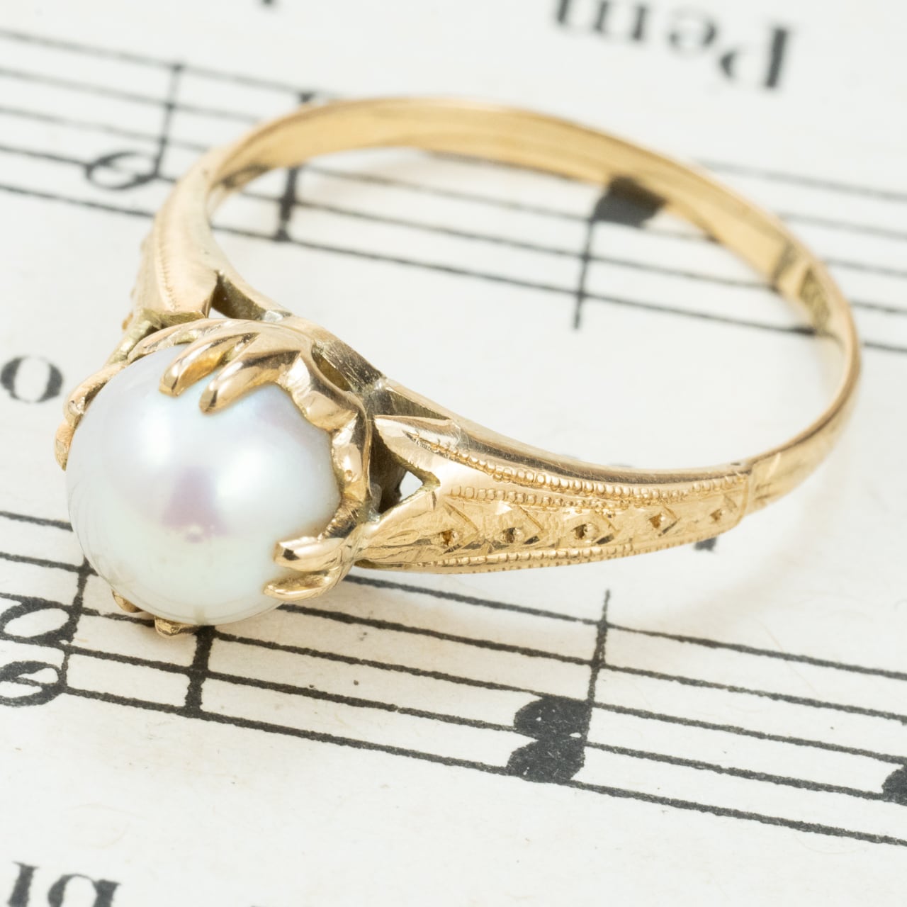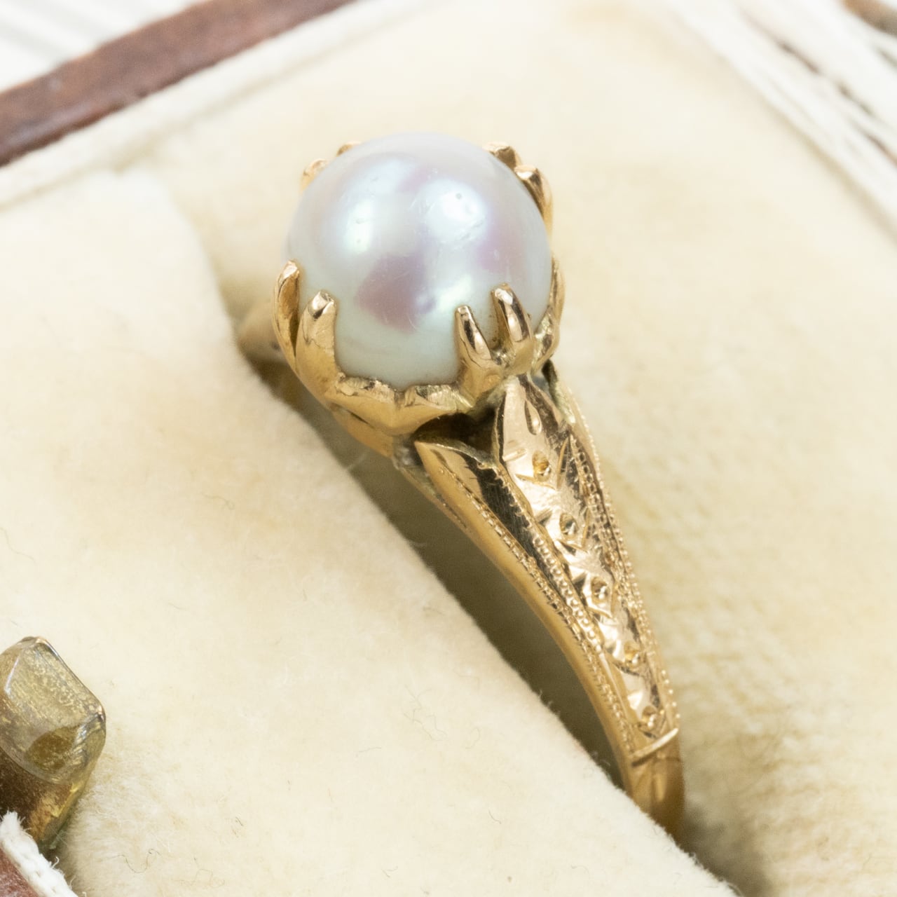 柔らかな光沢を湛えたアコヤパールが、優しく輝く昭和レトロのリングのご紹介です。
