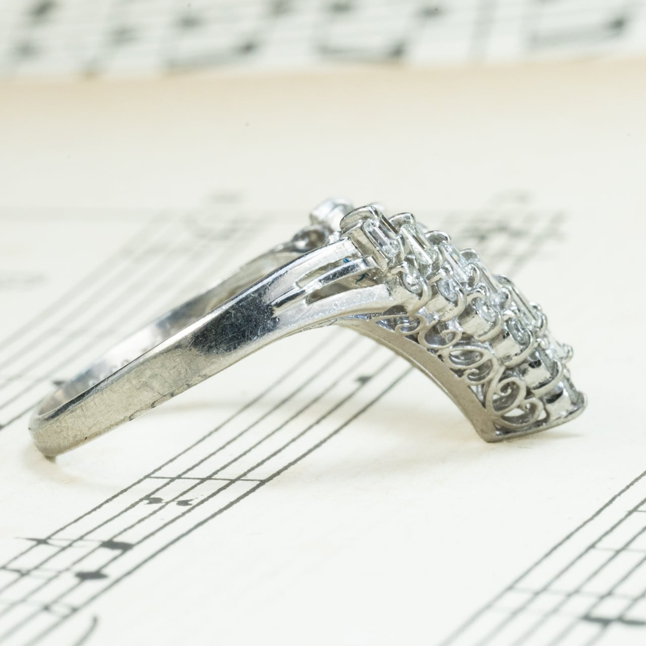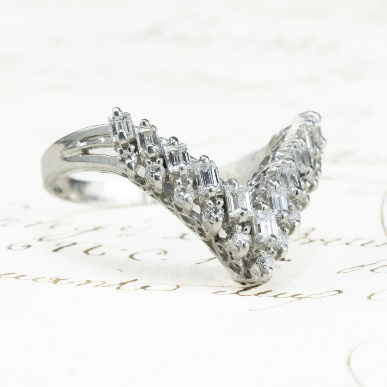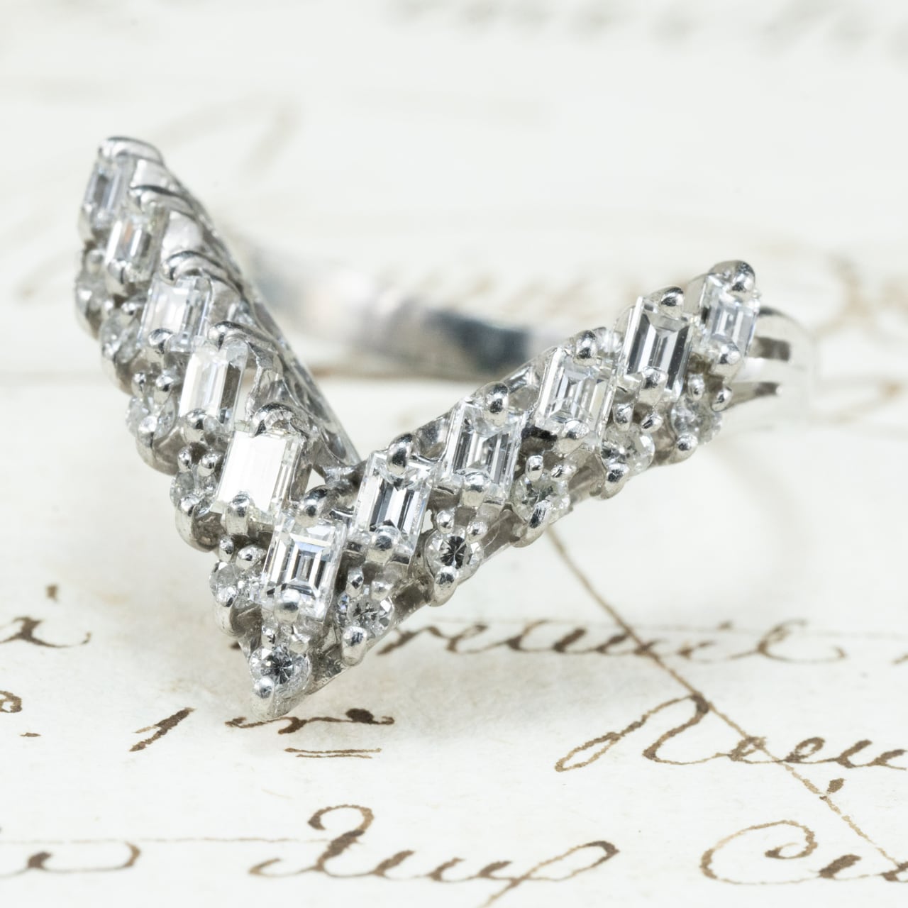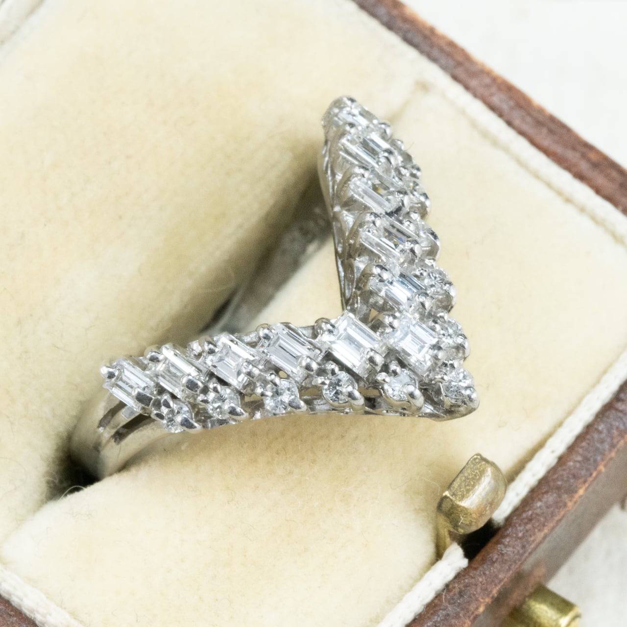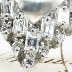 昭和レトロなダイヤモンドの輝きが美しいヴィンテージリングのご紹介♪シャープなV字シェイプが、指をすっきりと美しく見せるデザイン。よく見ると、V字の中は2列構造。