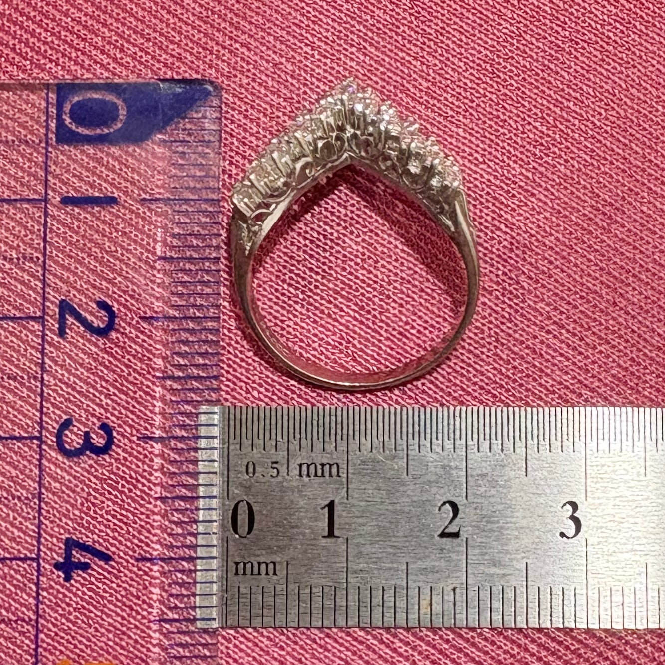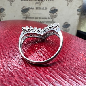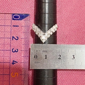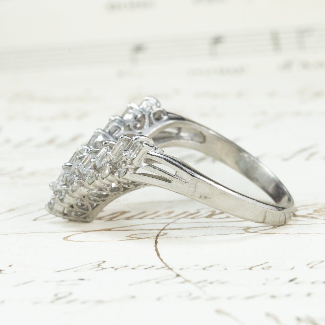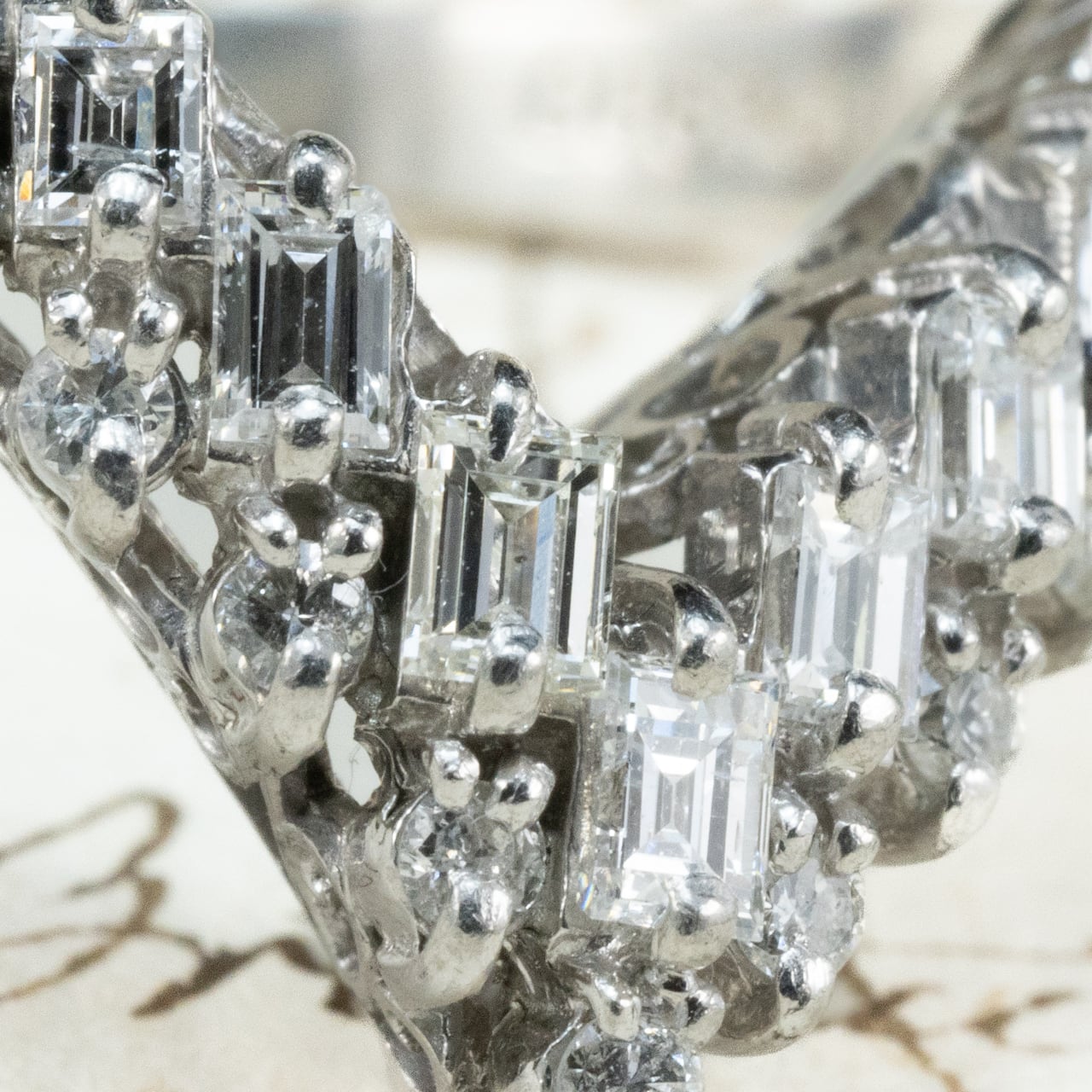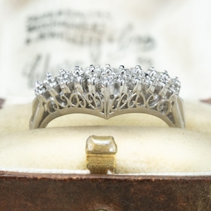 昭和レトロなダイヤモンドの輝きが美しいヴィンテージリングのご紹介♪シャープなV字シェイプが、指をすっきりと美しく見せるデザイン。よく見ると、V字の中は2列構造。