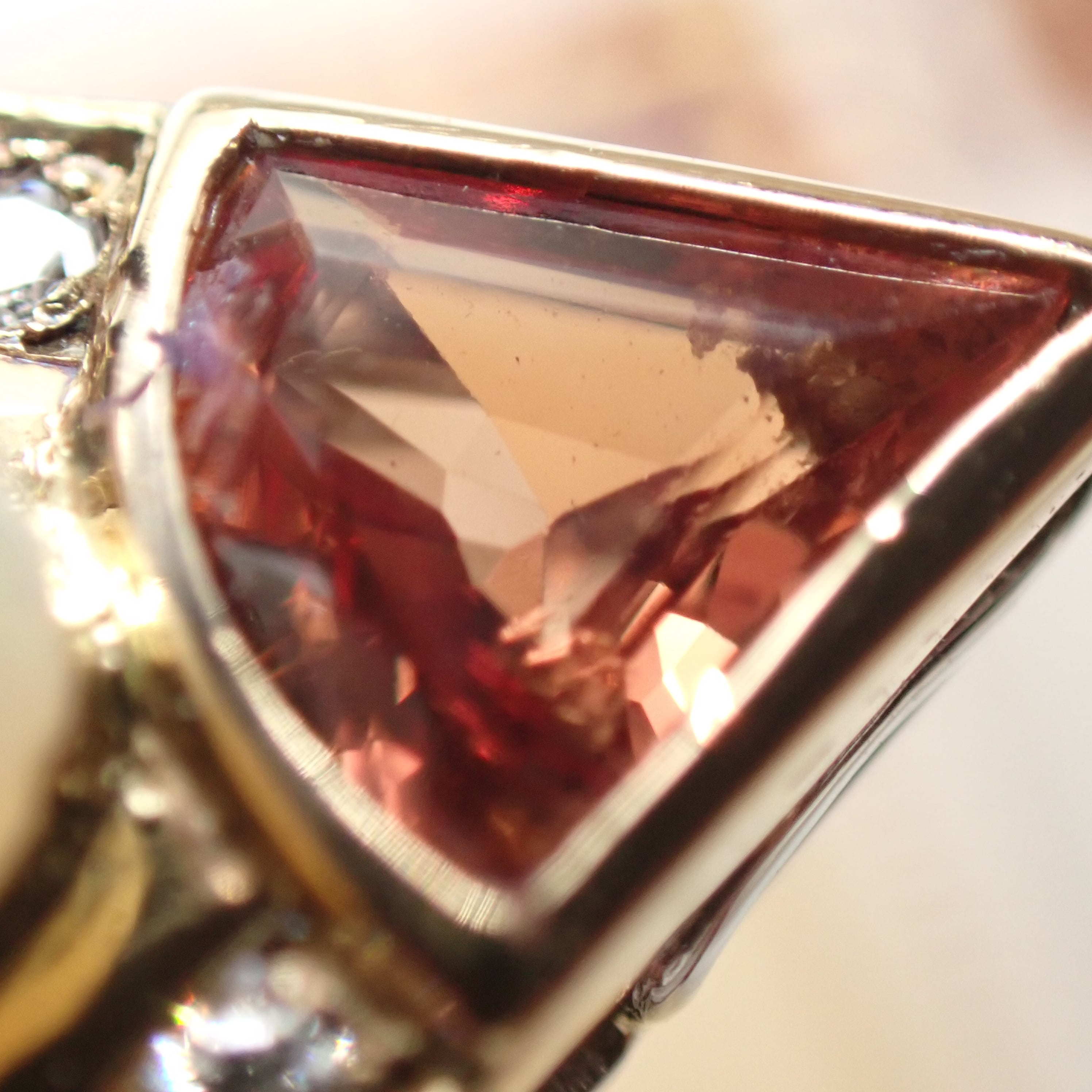 上部のサファイアはオレンジカラーで、扇形のカットに合わせて三角の台座が施され、シャープな印象に。