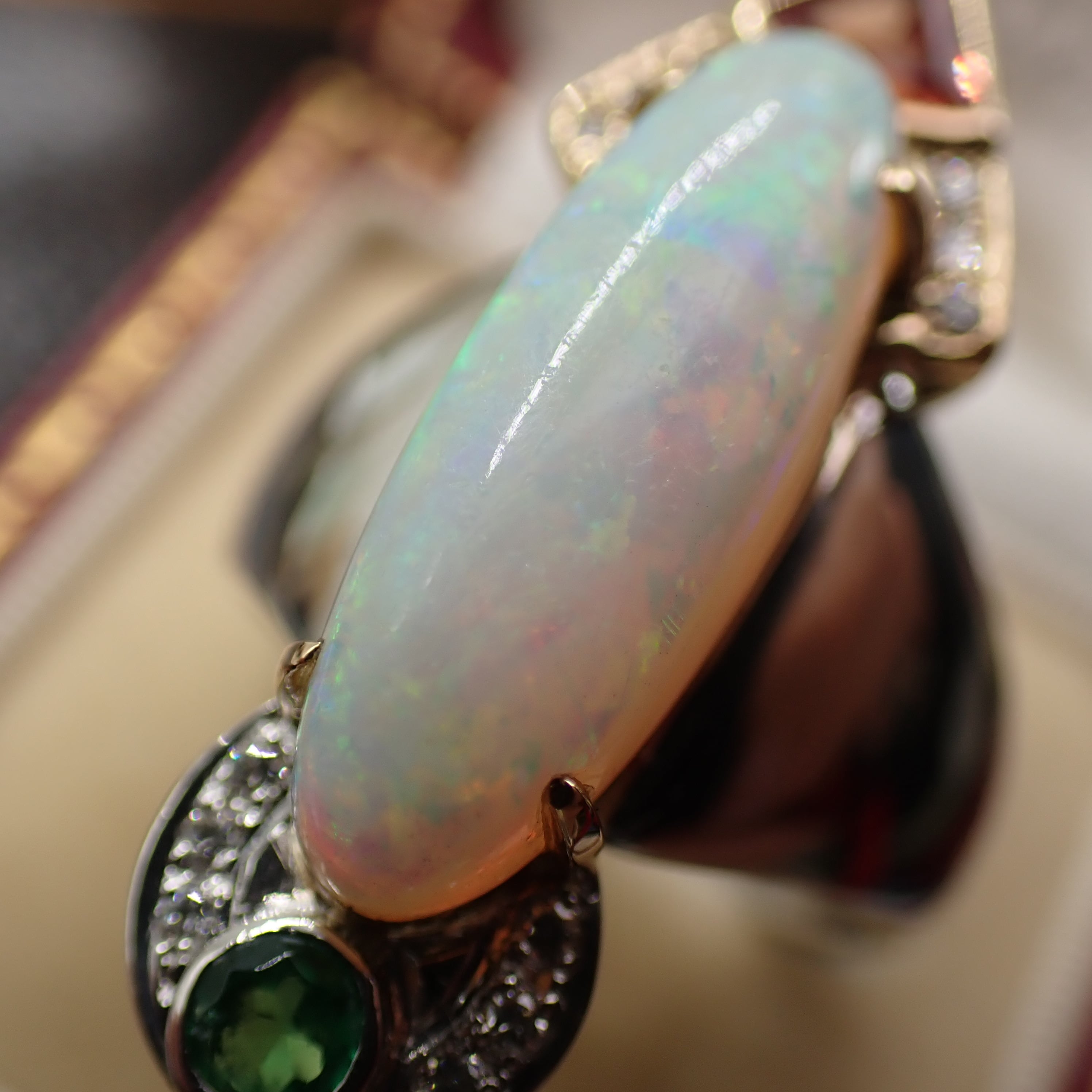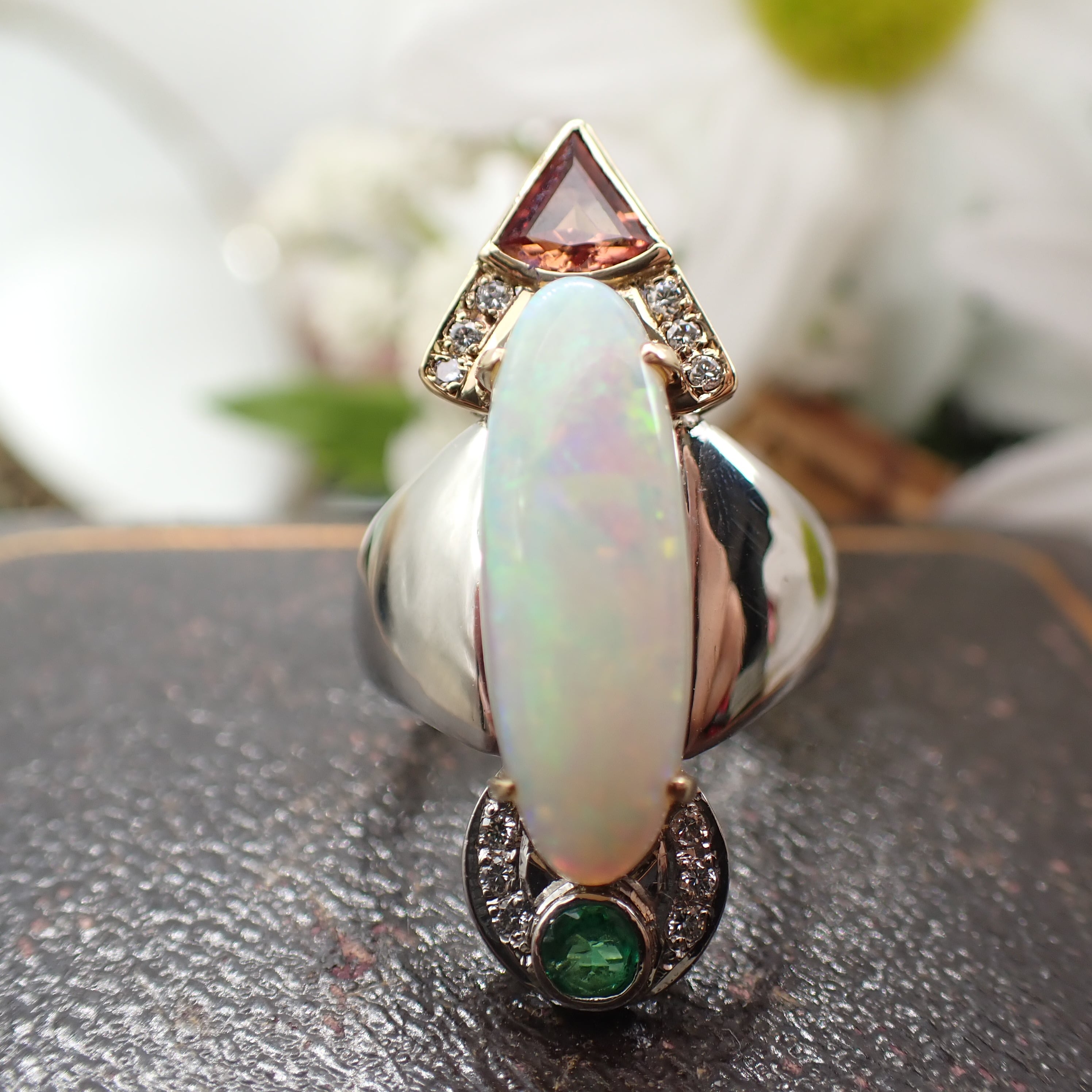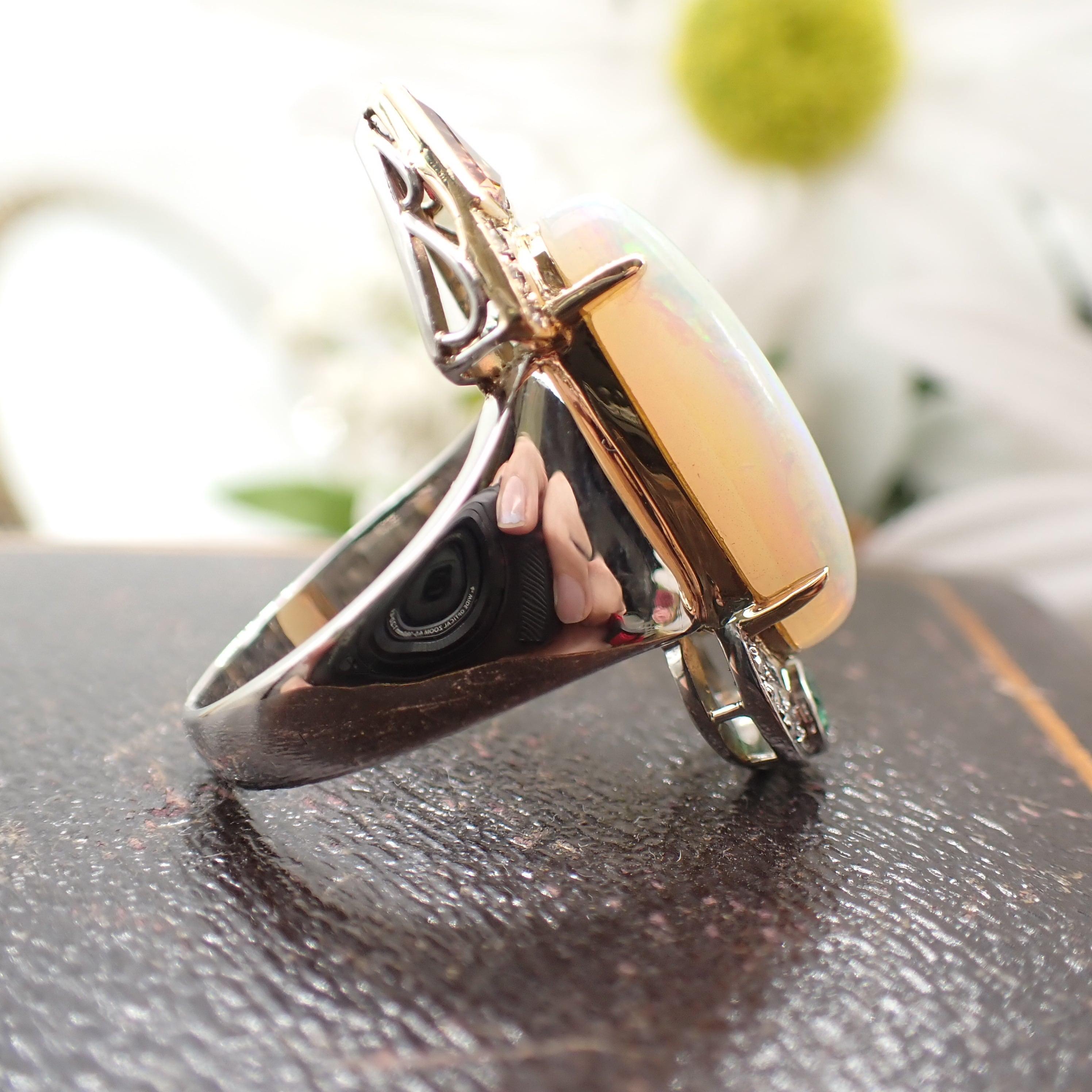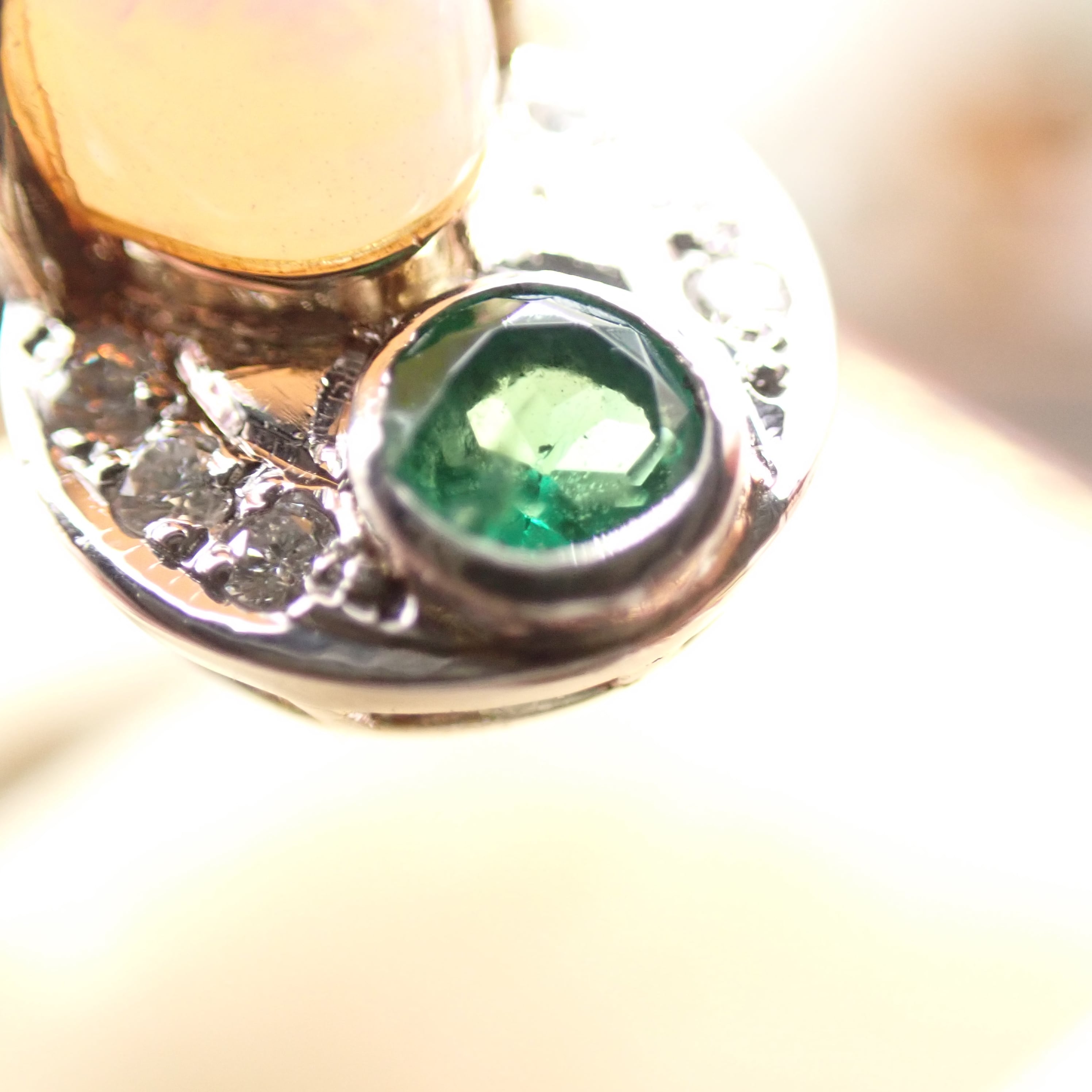 まず目を引くのは、存在感抜群の大ぶりオパール。その迫力に思わず目を奪われますが、上下にセットされたサファイアとエメラルドにもぜひご注目ください。