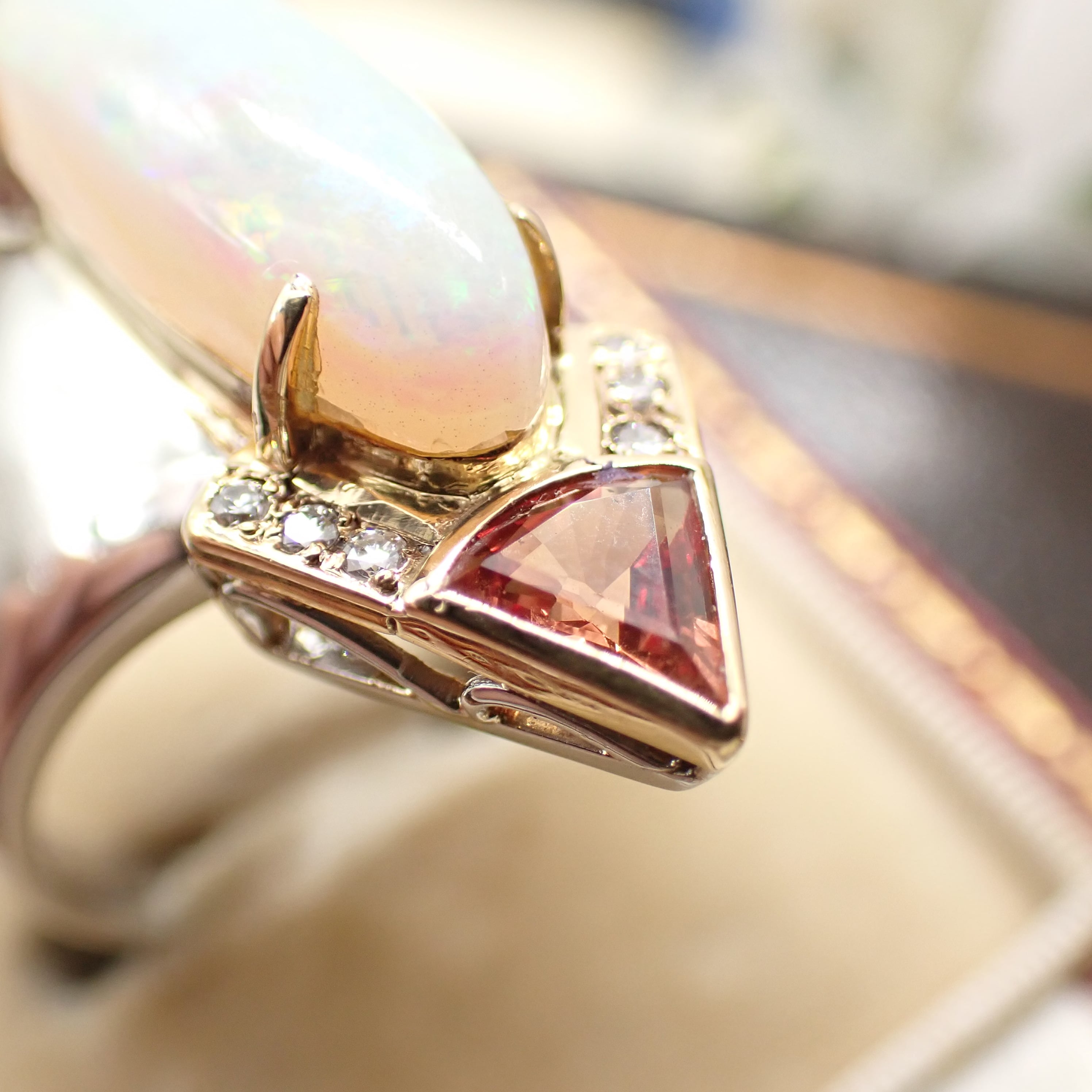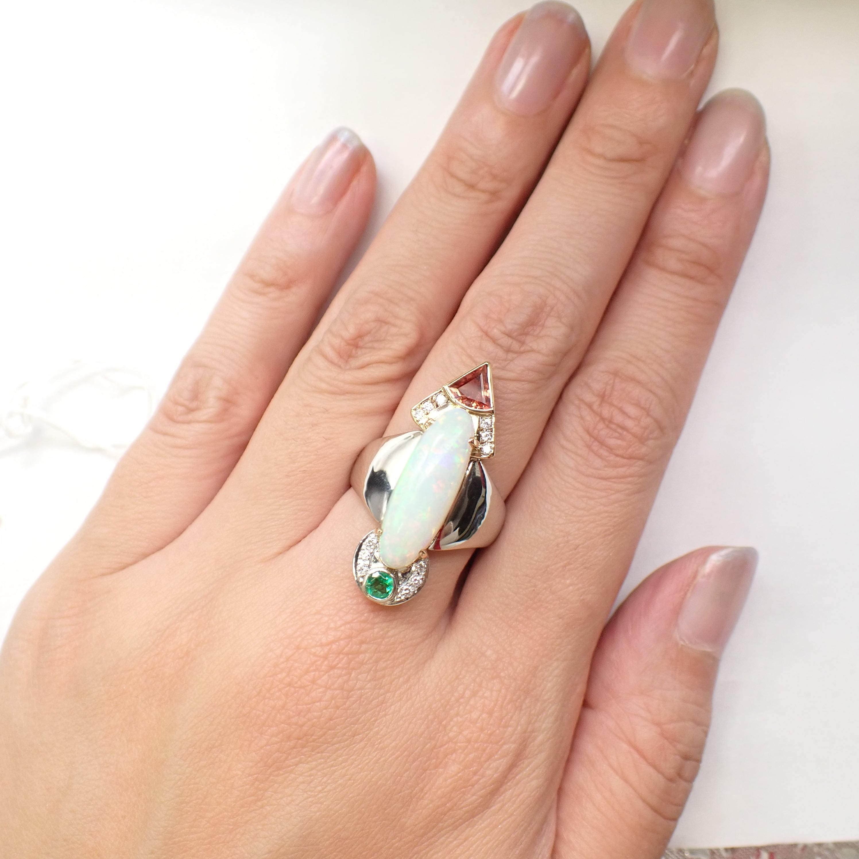 センターストーンのオパールは縦長フォルムながら、腕部分を太めにデザインすることで全体にふっくらとした丸みを持たせ、直線と曲線のコントラストが際立つモダンで芸術的な仕上がりに。
