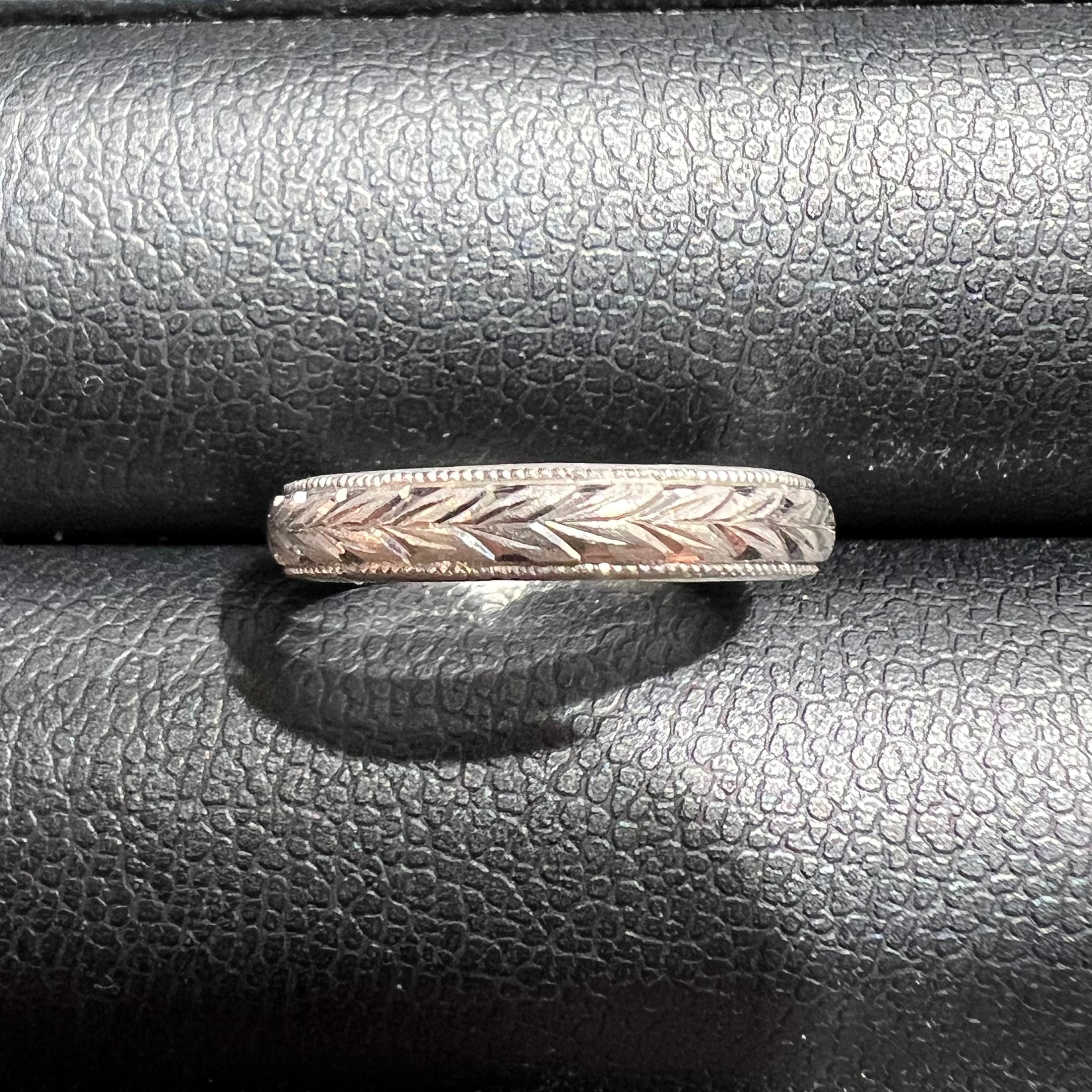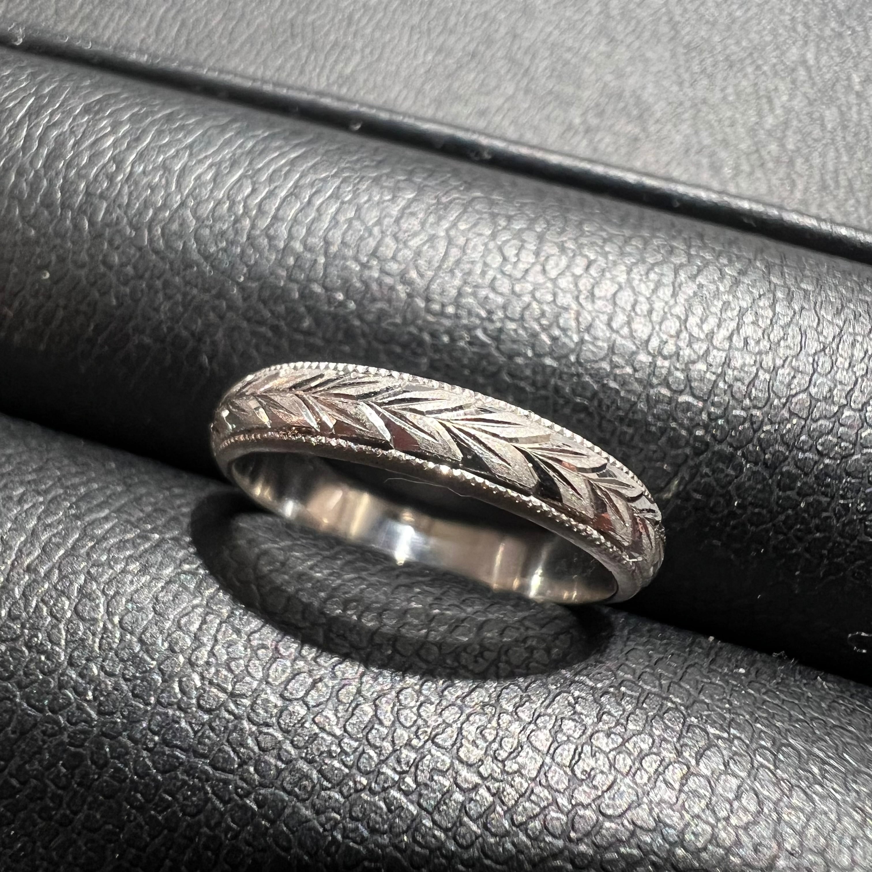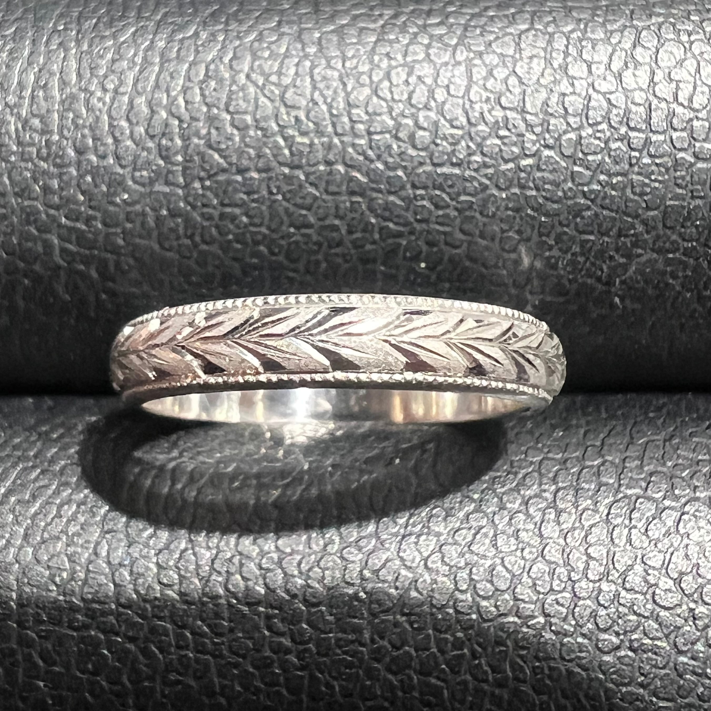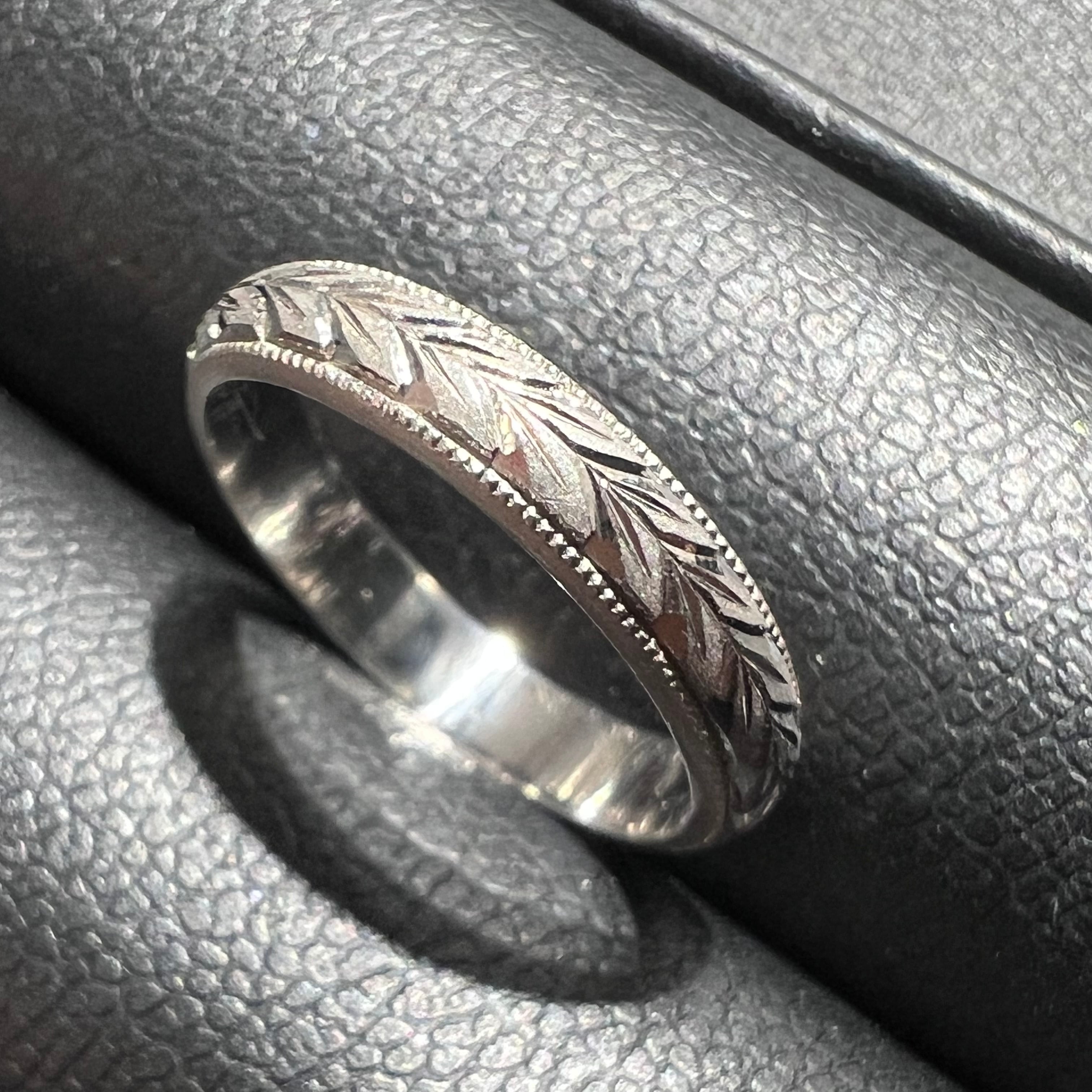 【日本の作品】昭和レトロ 月桂樹 和彫 手彫り 彫刻 デザイン ヴィンテージ リング Pt900 〜ミル打ちと和彫りの細やかな仕事〜 MOR00647