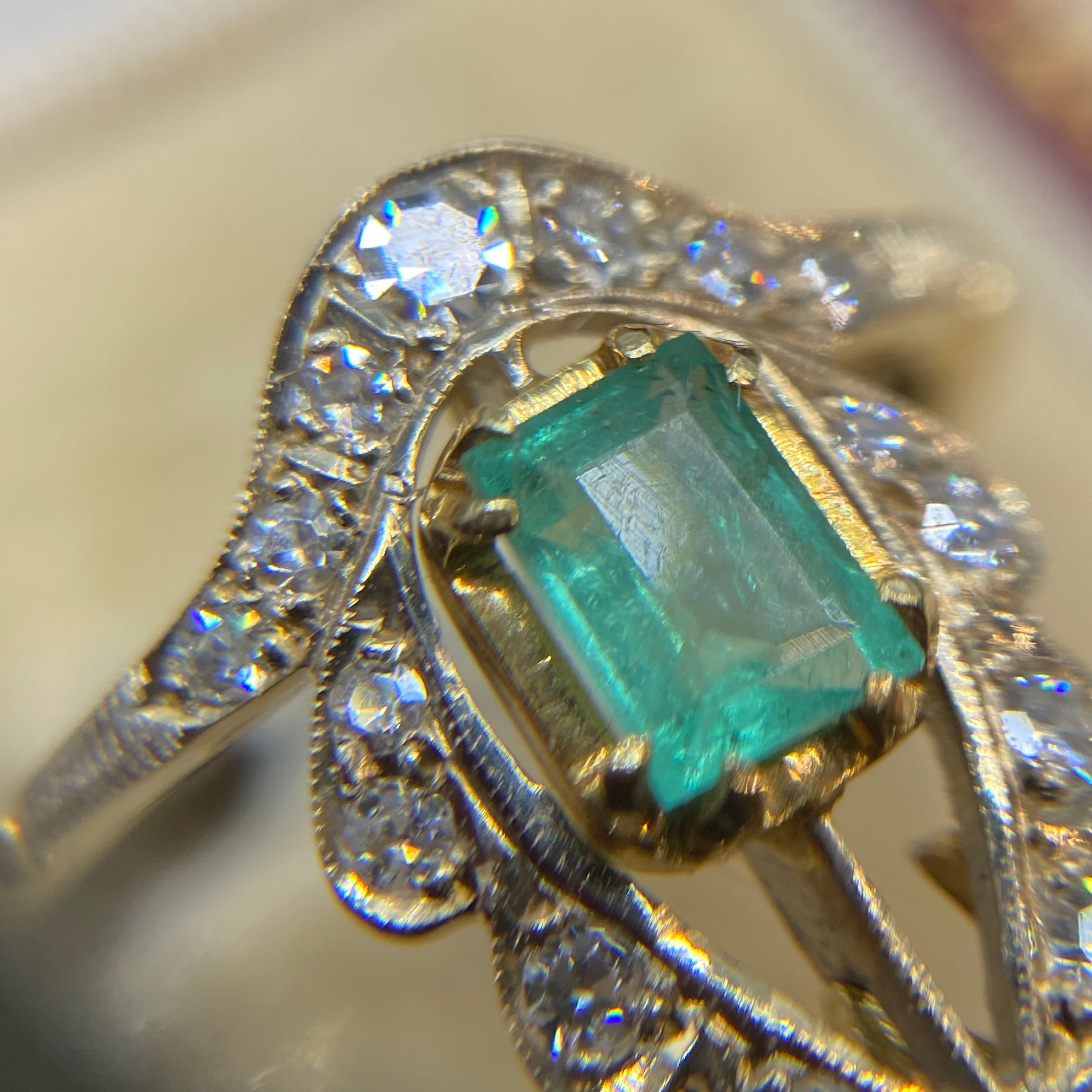 エメラルドとダイヤモンドが互いの美しさを最大限に引き立てあい、なんとも神秘的な空気感のリングです✨