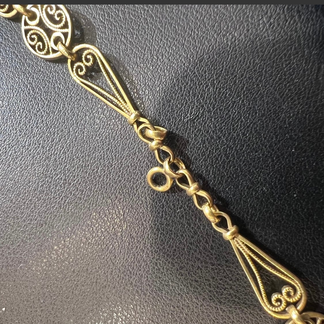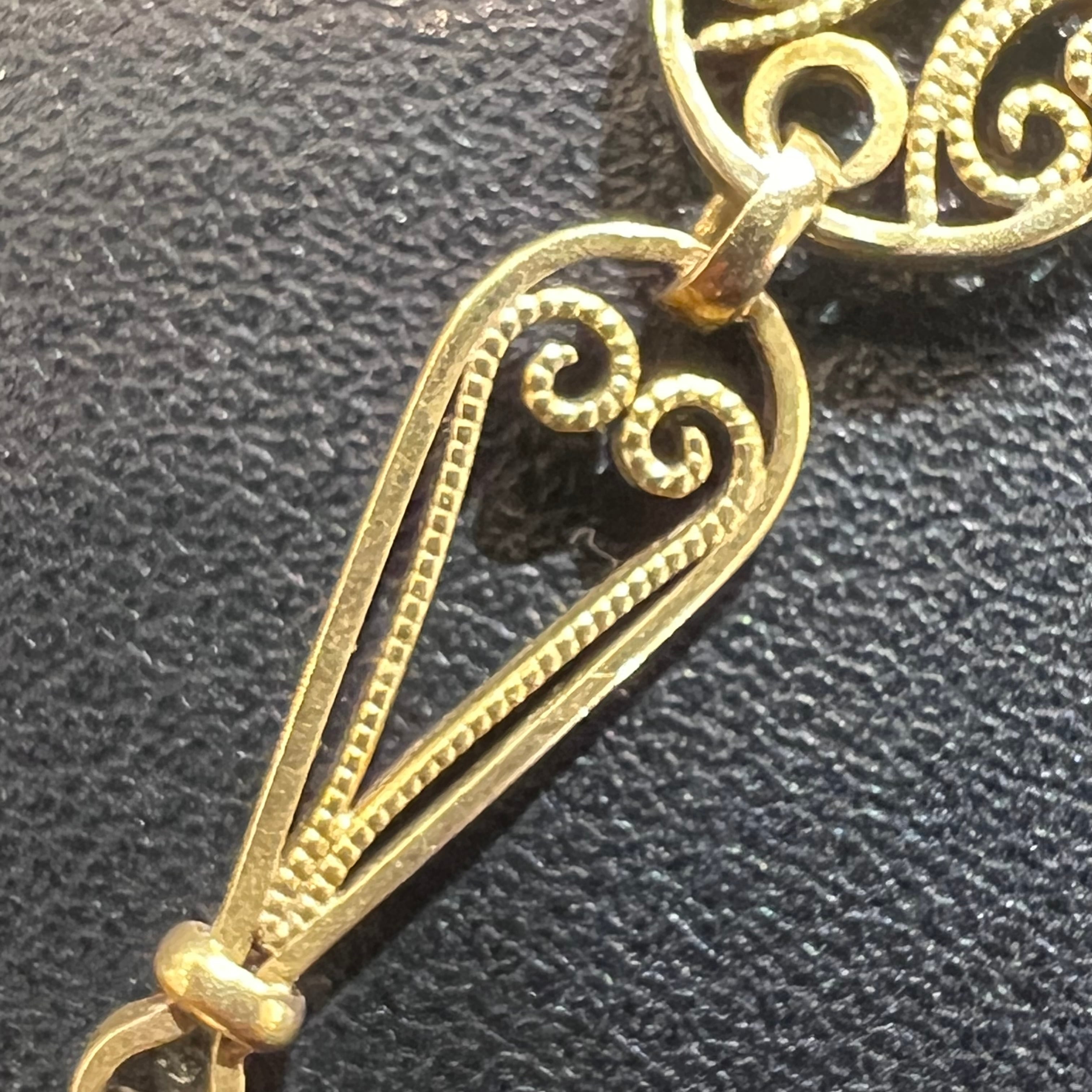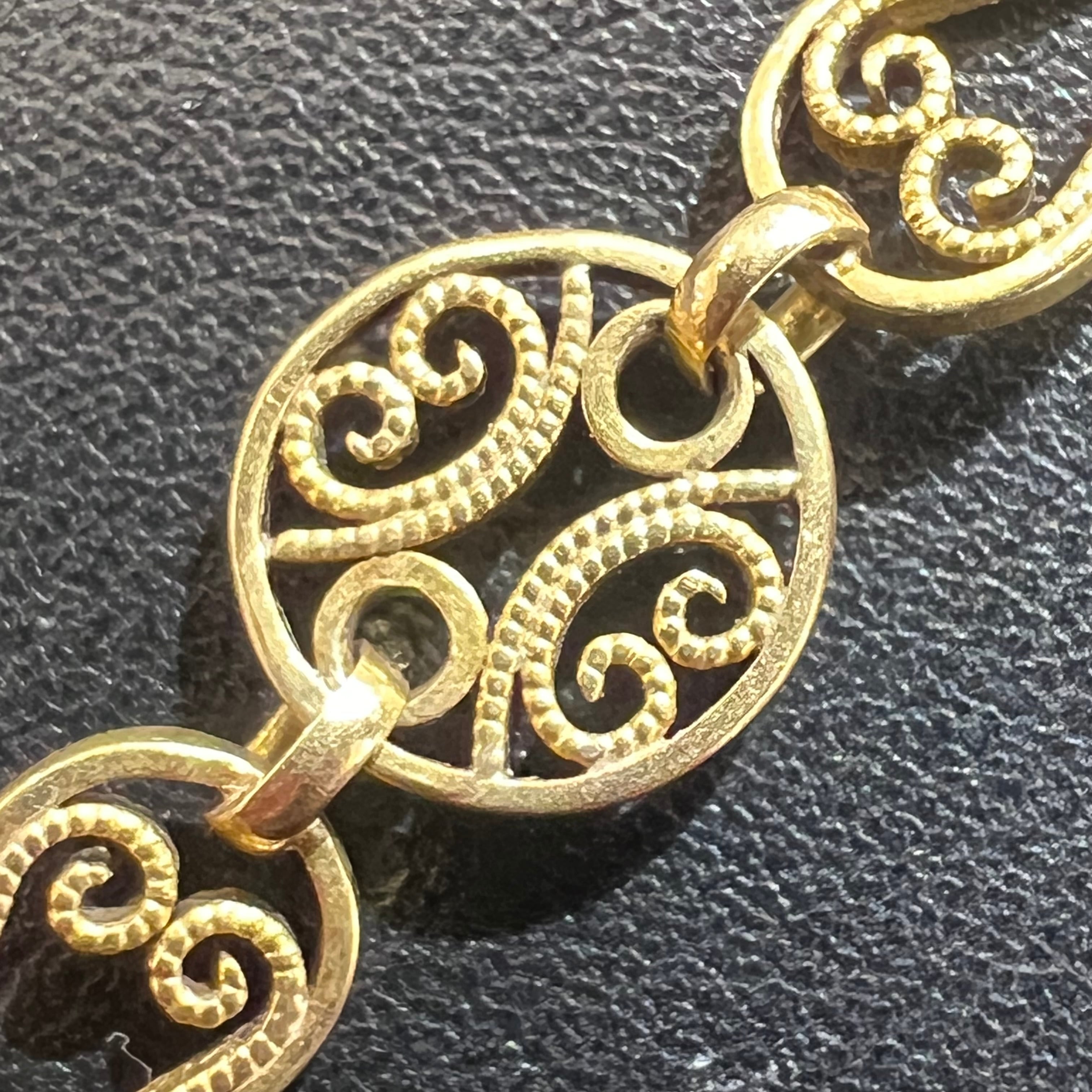 マーユ(オリーブメッシュ) と呼ばれる細かなパーツが、ペアシェイプ型と丸型を交互に結びながら連なる貴重なデザインのアンティークフィリグリーチェーンをご紹介します✨