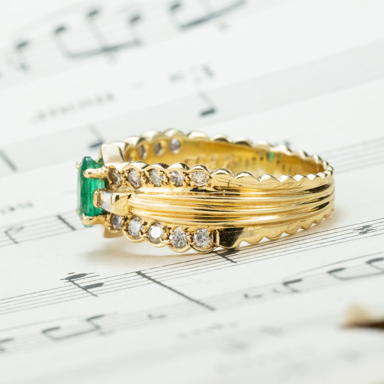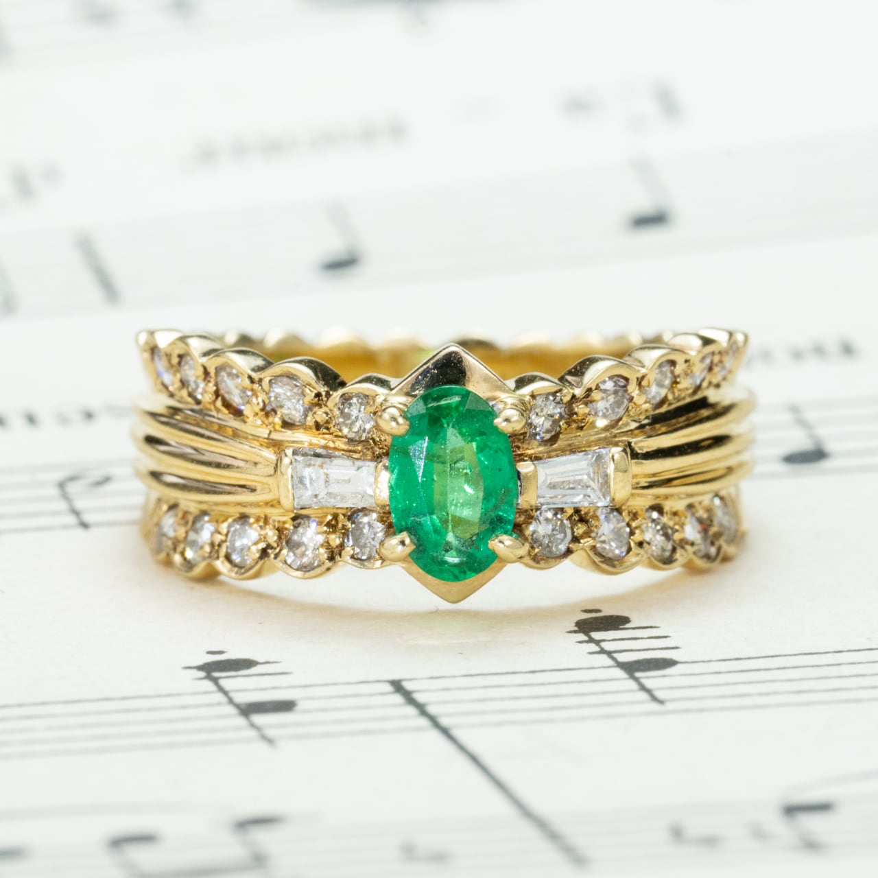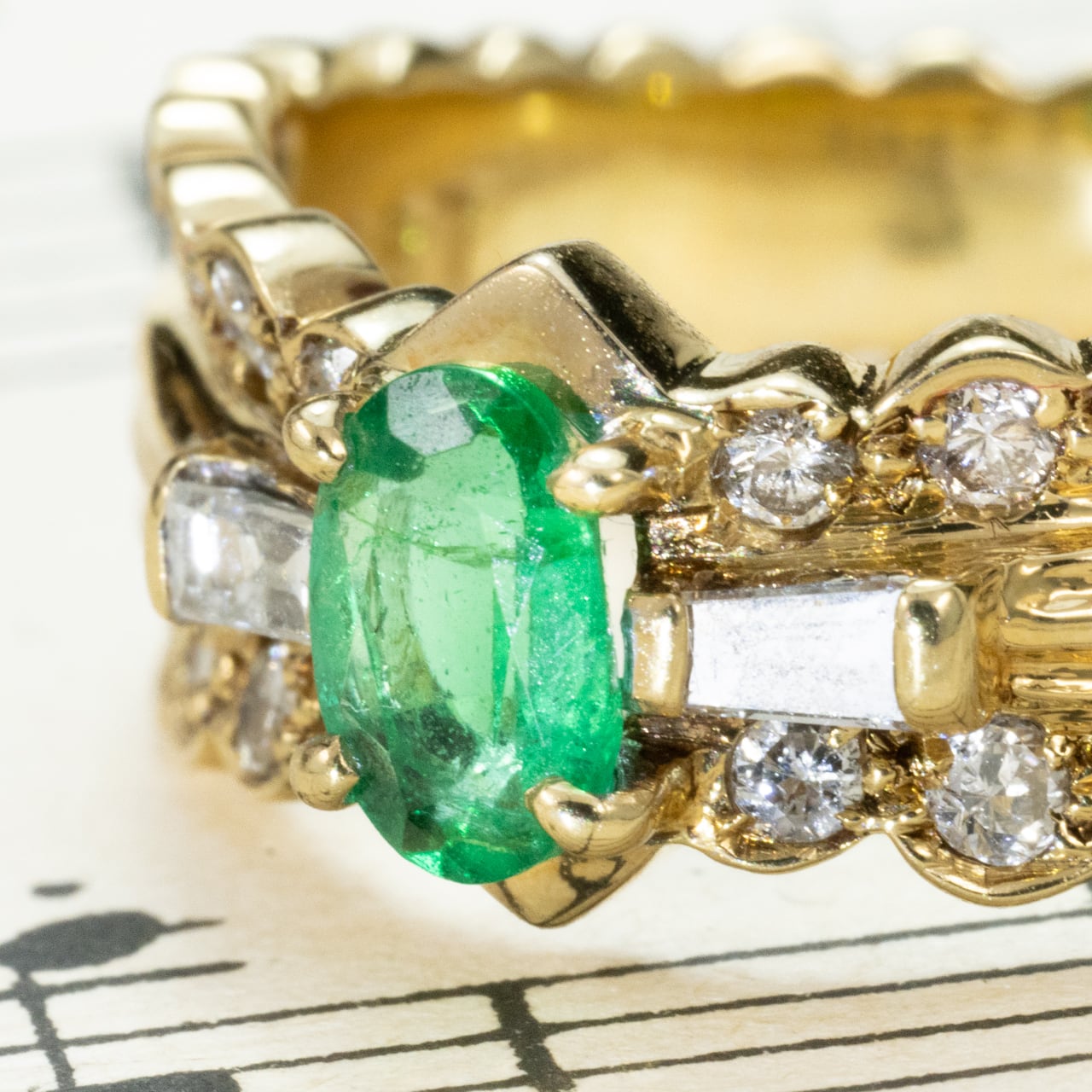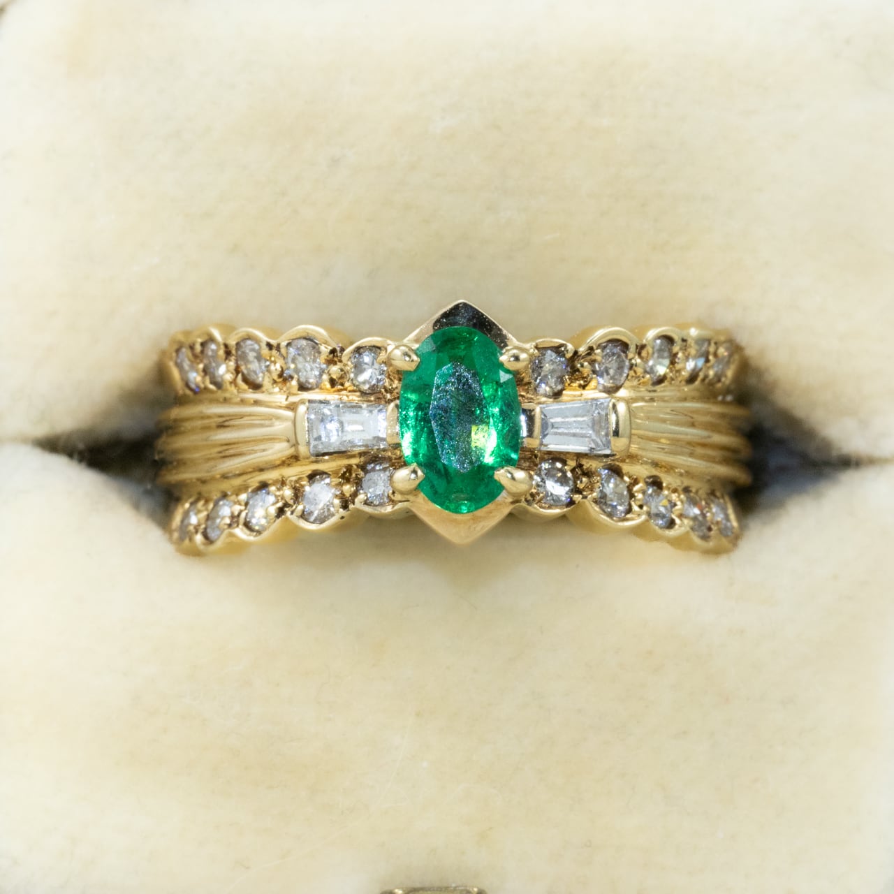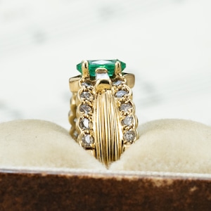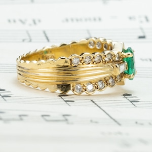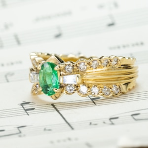 K18ゴールドにエメラルド0.37ct、ダイヤモンド0.44ctをあしらったヴィンテージリングです。