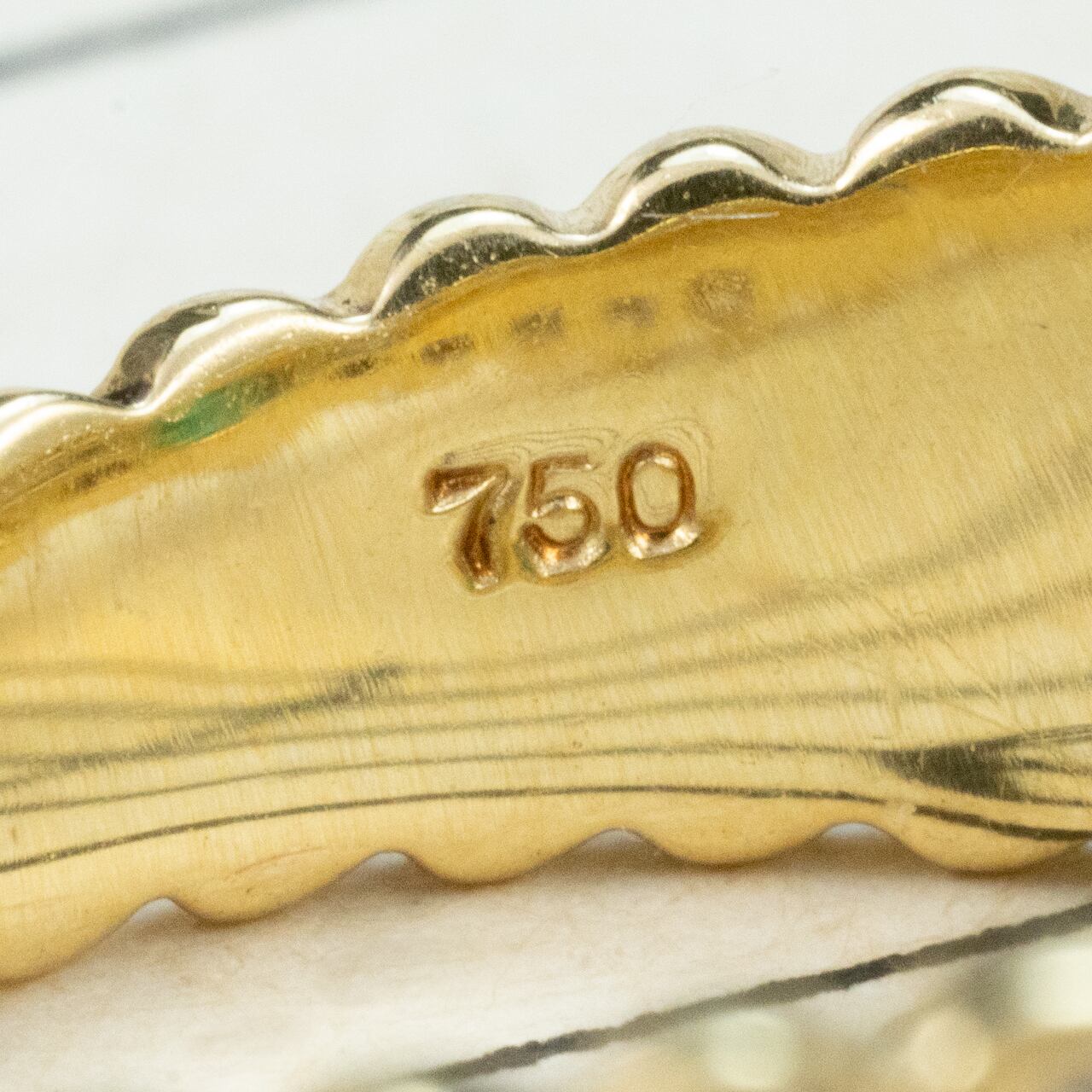センターへ向かって緩やかに絞られるアームラインと、半円状のスカラップ装飾が幾何学的なリズムを生み、甘さを抑えた大人のリボンモチーフのような印象に仕上がっています。
