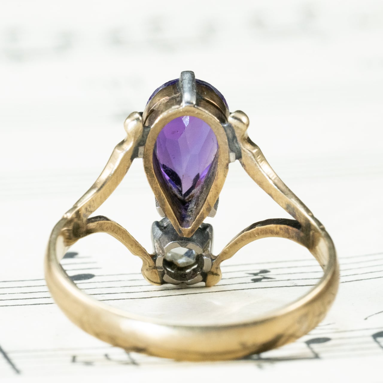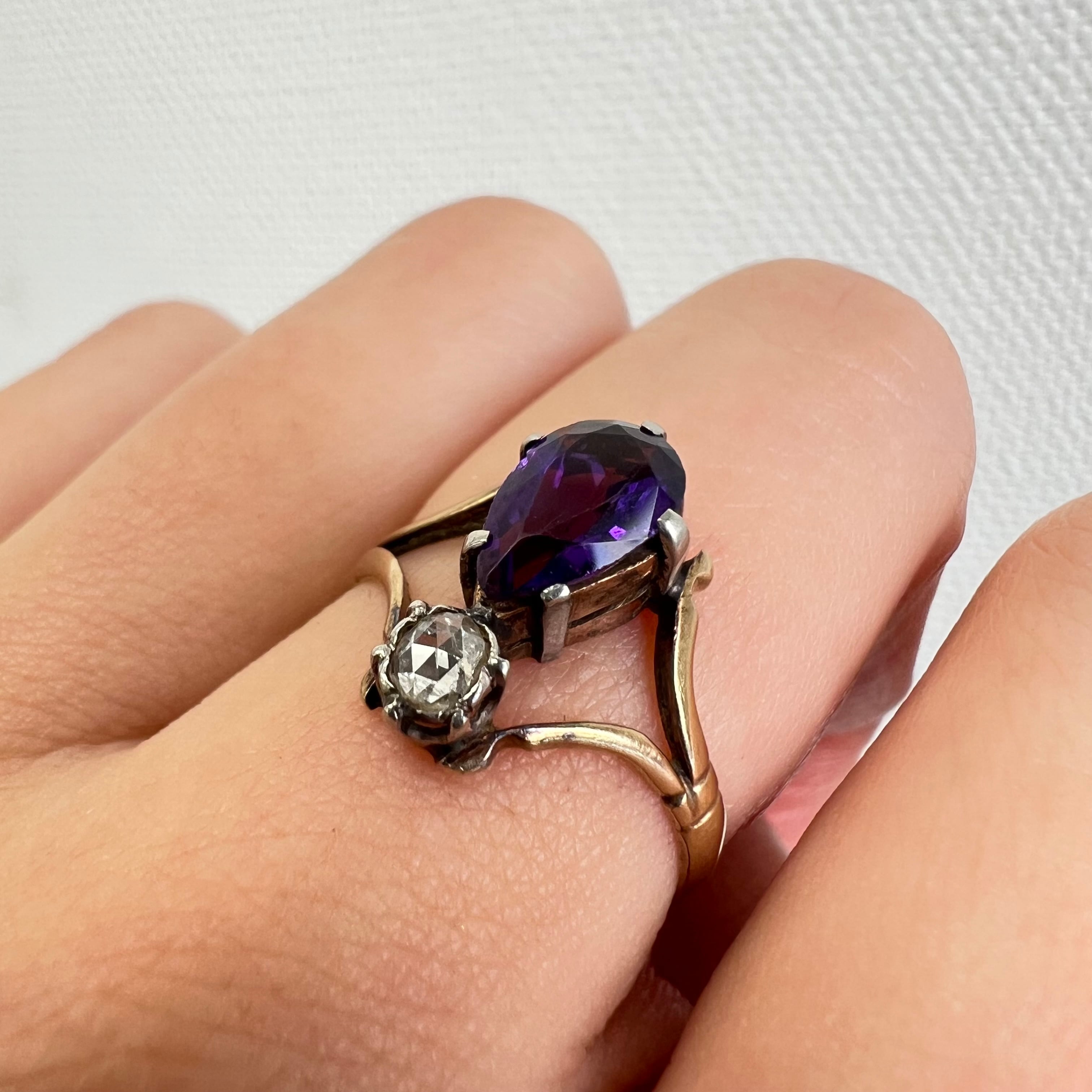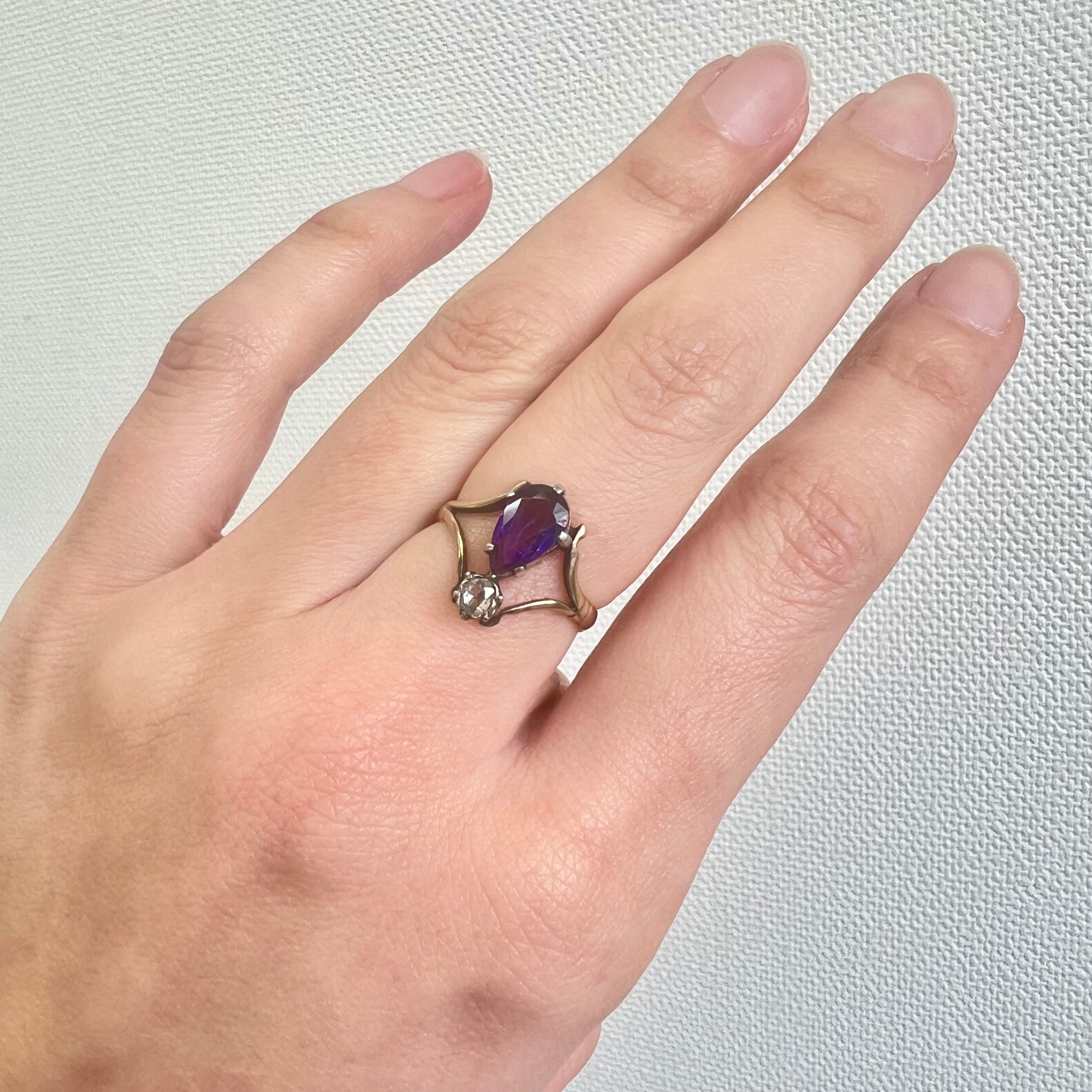 ティアドロップ型のアメジストにローズカットのダイヤが上下にセットされ、透かしが施されたように腕がセットされた、まさに曲線美。