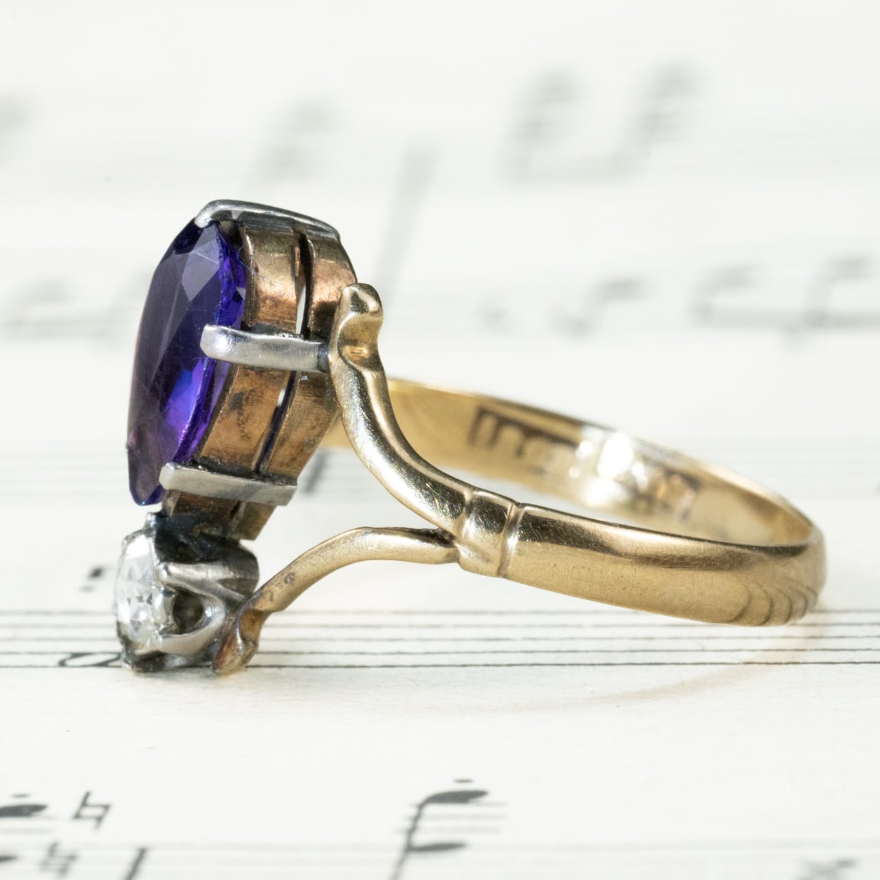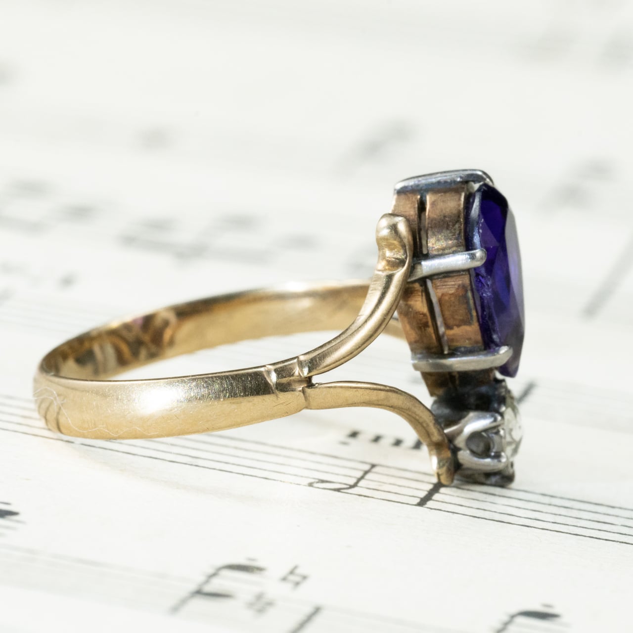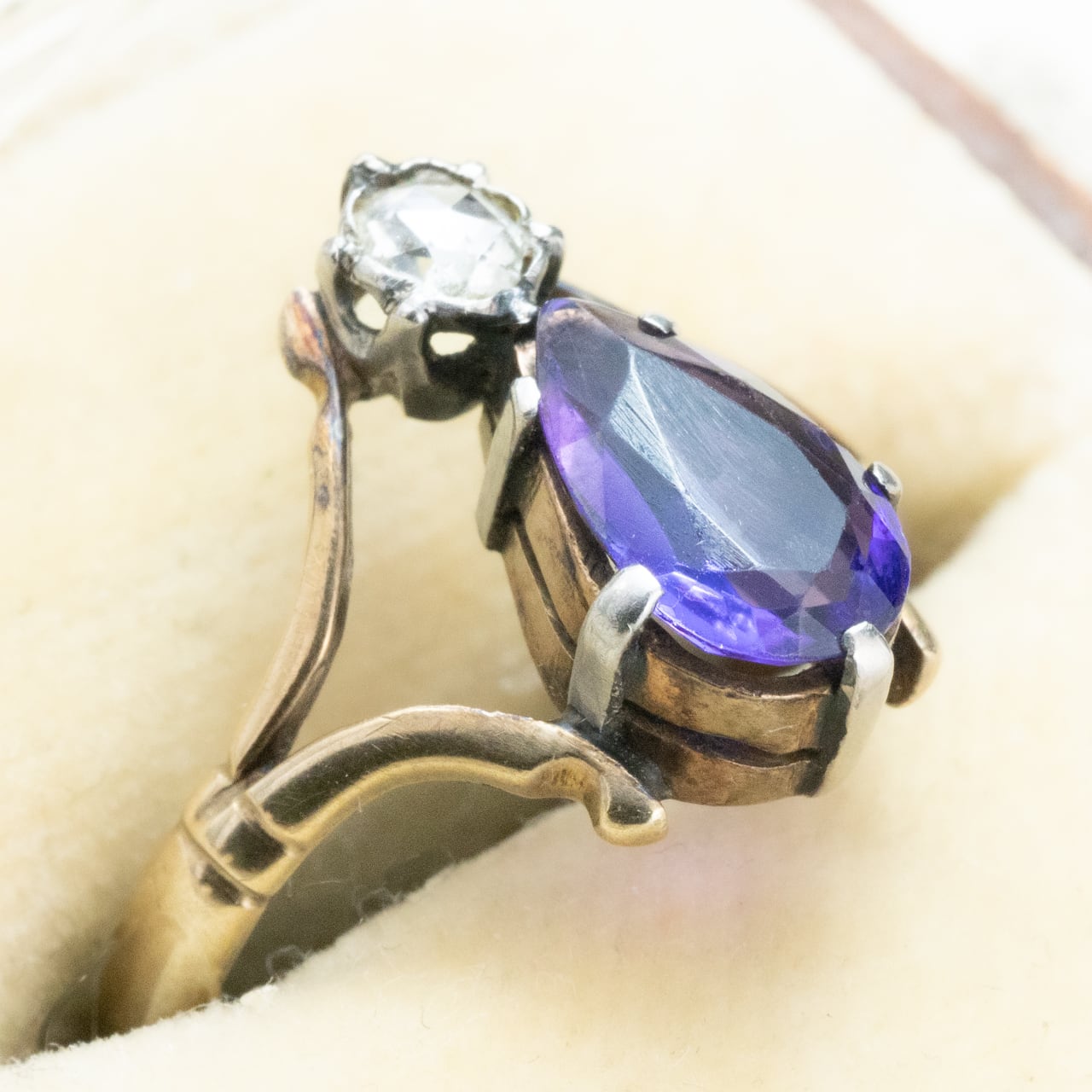 ティアドロップ型のアメジストにローズカットのダイヤが上下にセットされ、透かしが施されたように腕がセットされた、まさに曲線美。