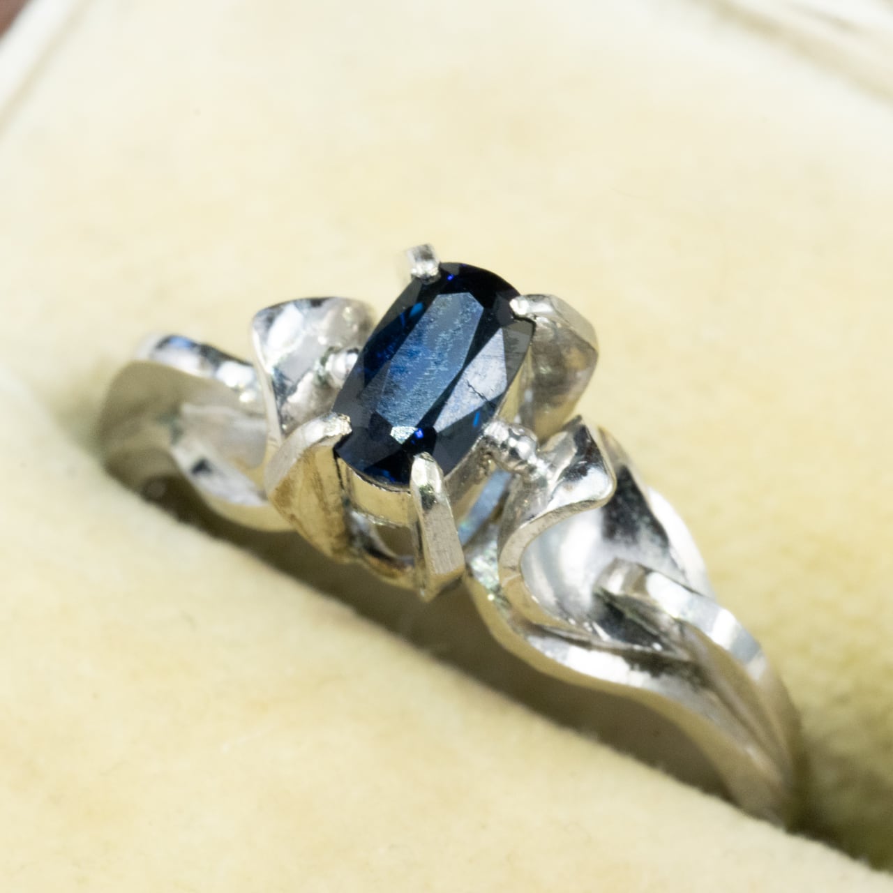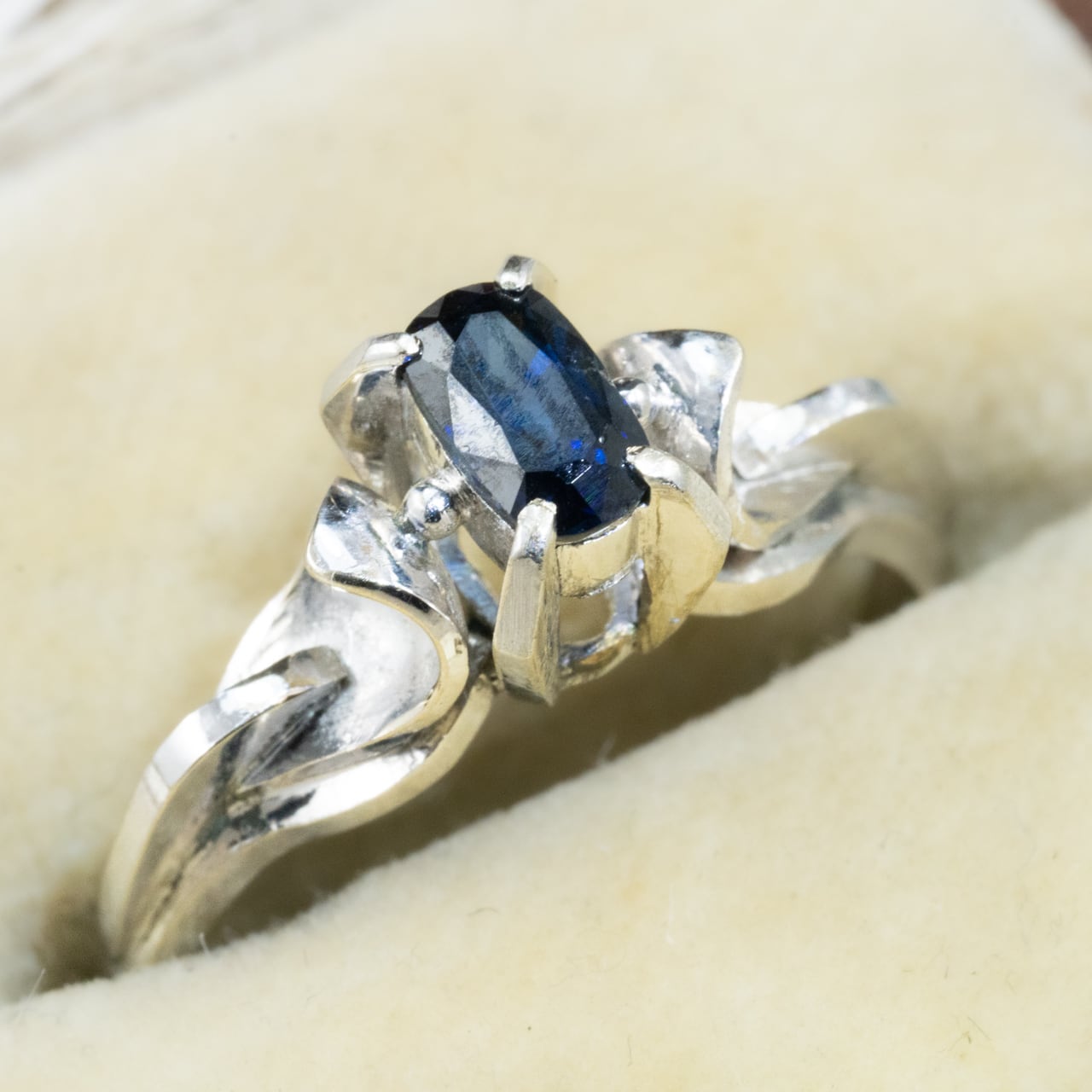 深みのあるブルーのサファイアに、シルバーカラーの地金。