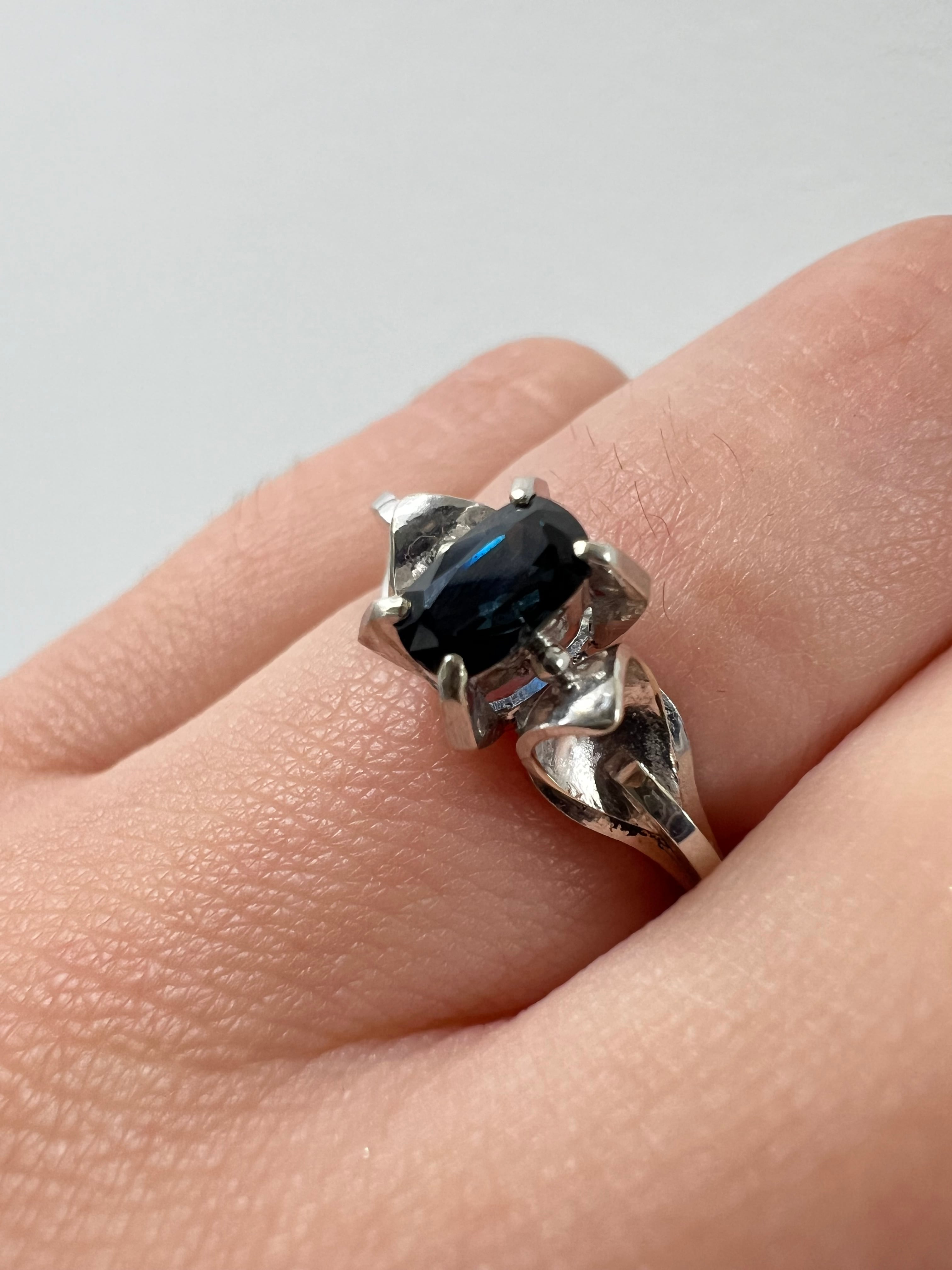 深みのあるブルーのサファイアに、シルバーカラーの地金。