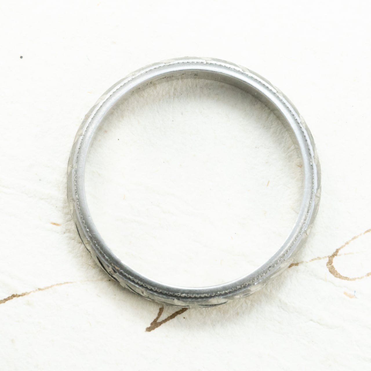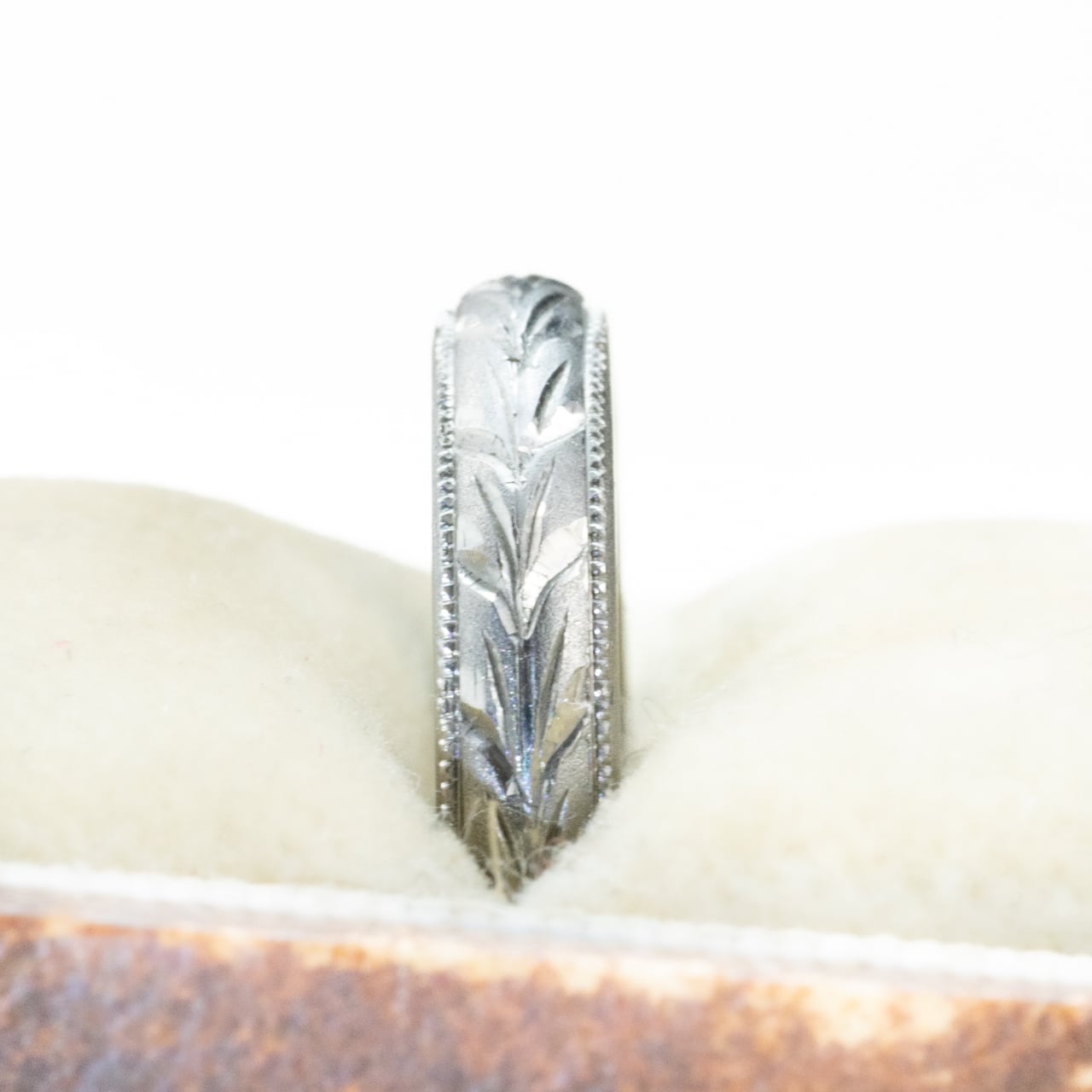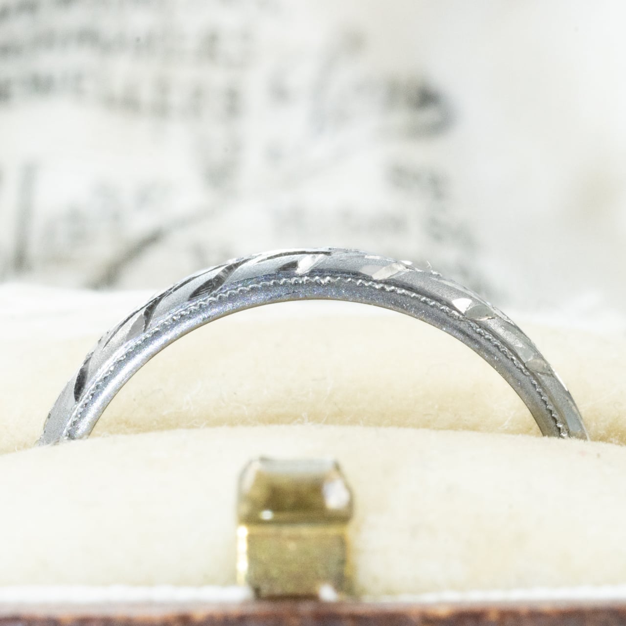 リングの縁にはミル打ちが施され、レースのような繊細な装飾がクラシカルな雰囲気を添えています。