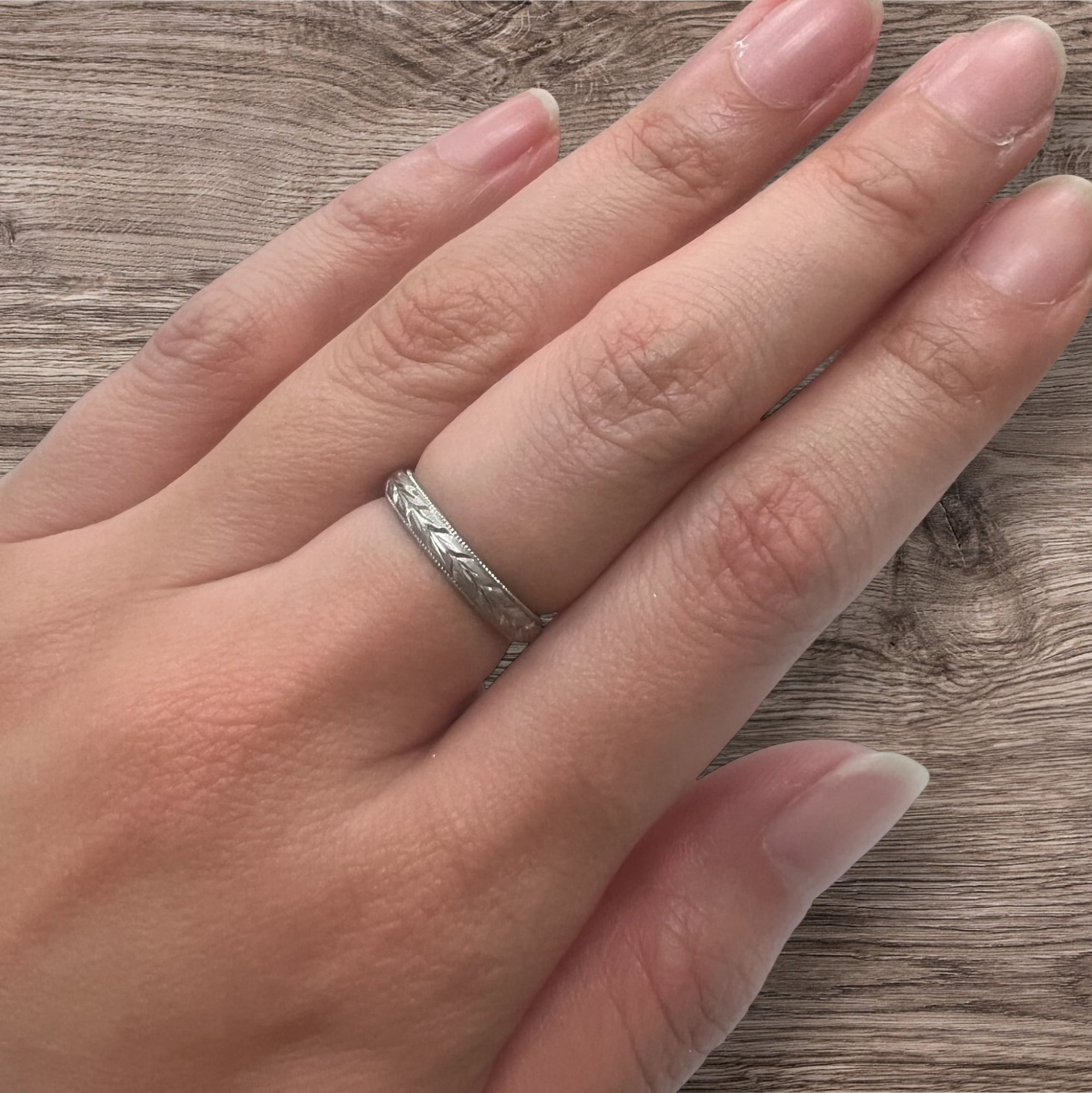 和彫りリングの中では幅広すぎず、かといって華奢すぎない程よいバランスのため、日常でも使いやすい一本。
