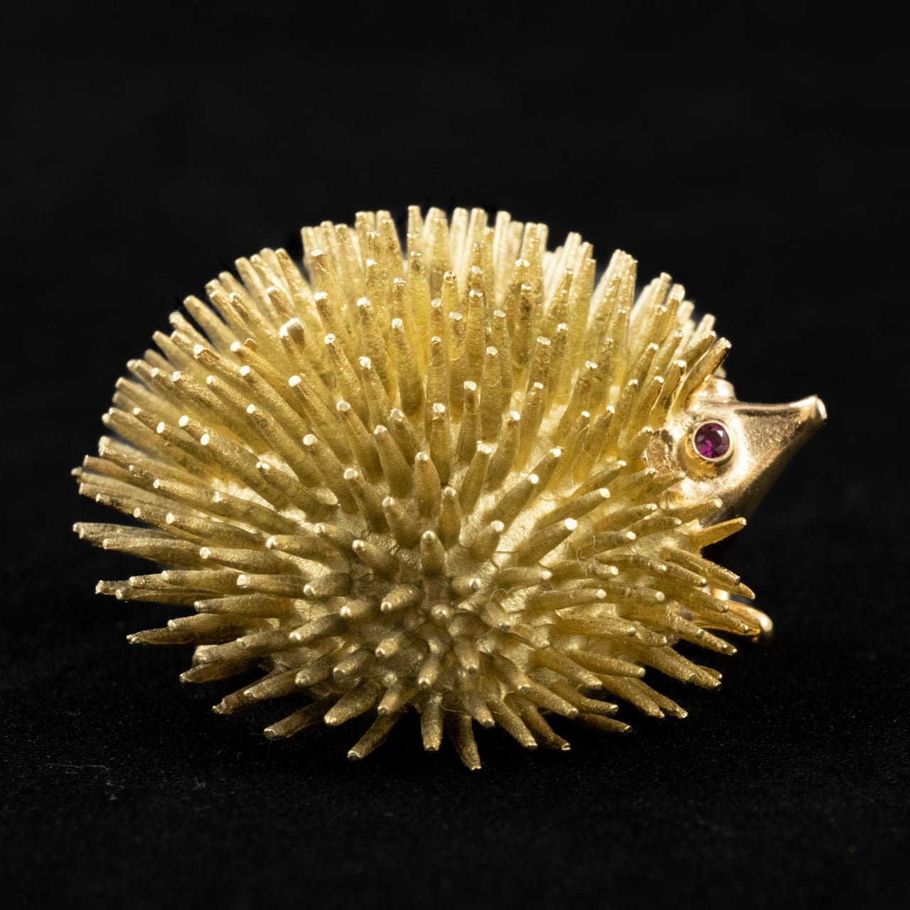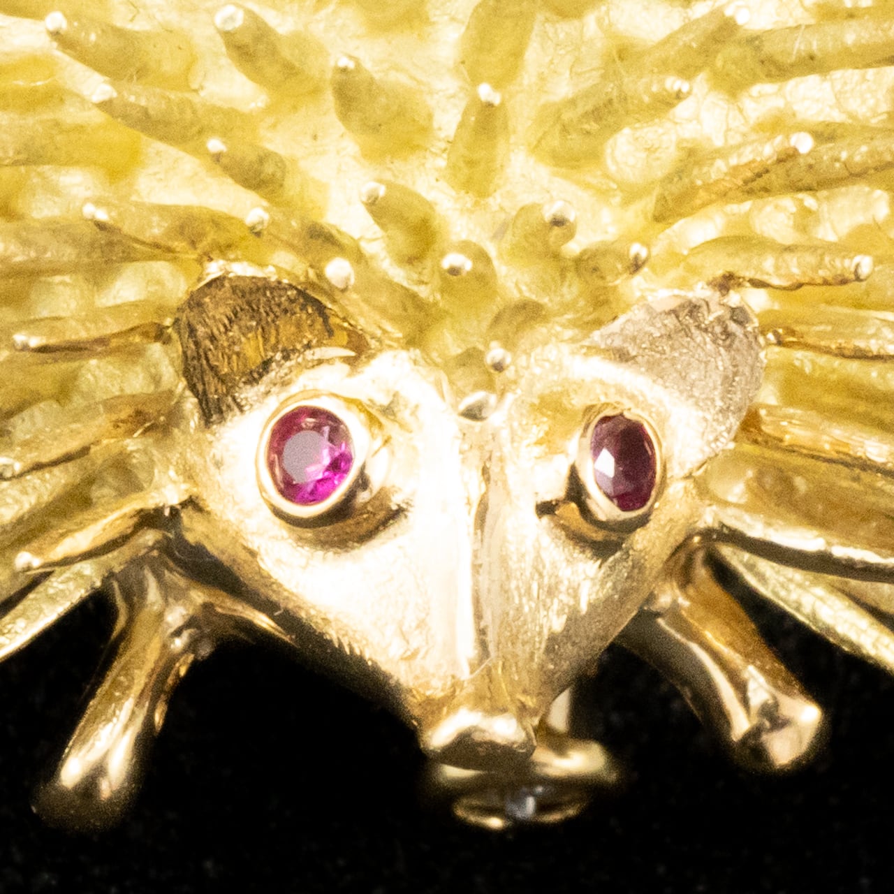 細やかに表現されたトゲの一本一本までK18で仕立てられ、つぶらな瞳にはルビーがあしらわれています★