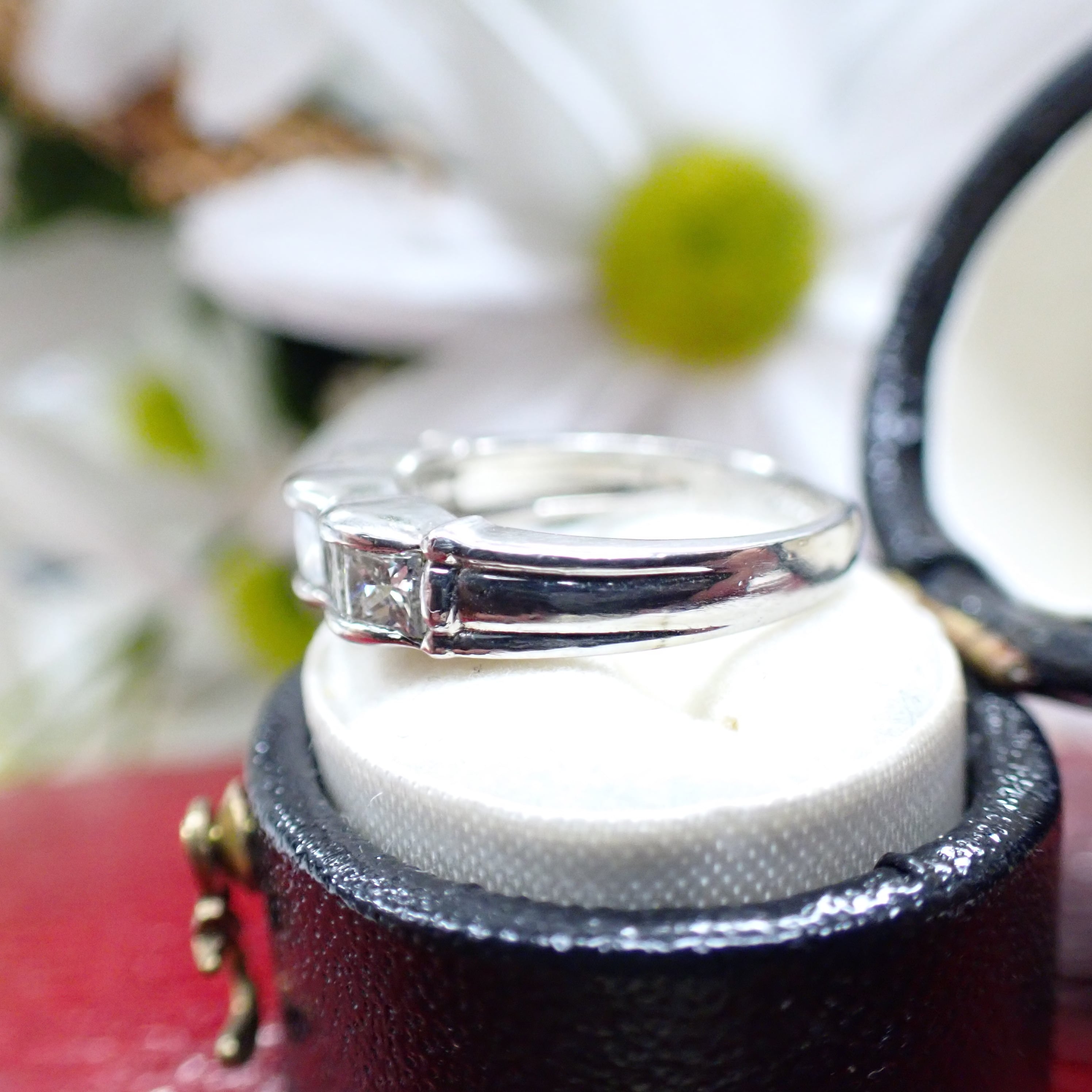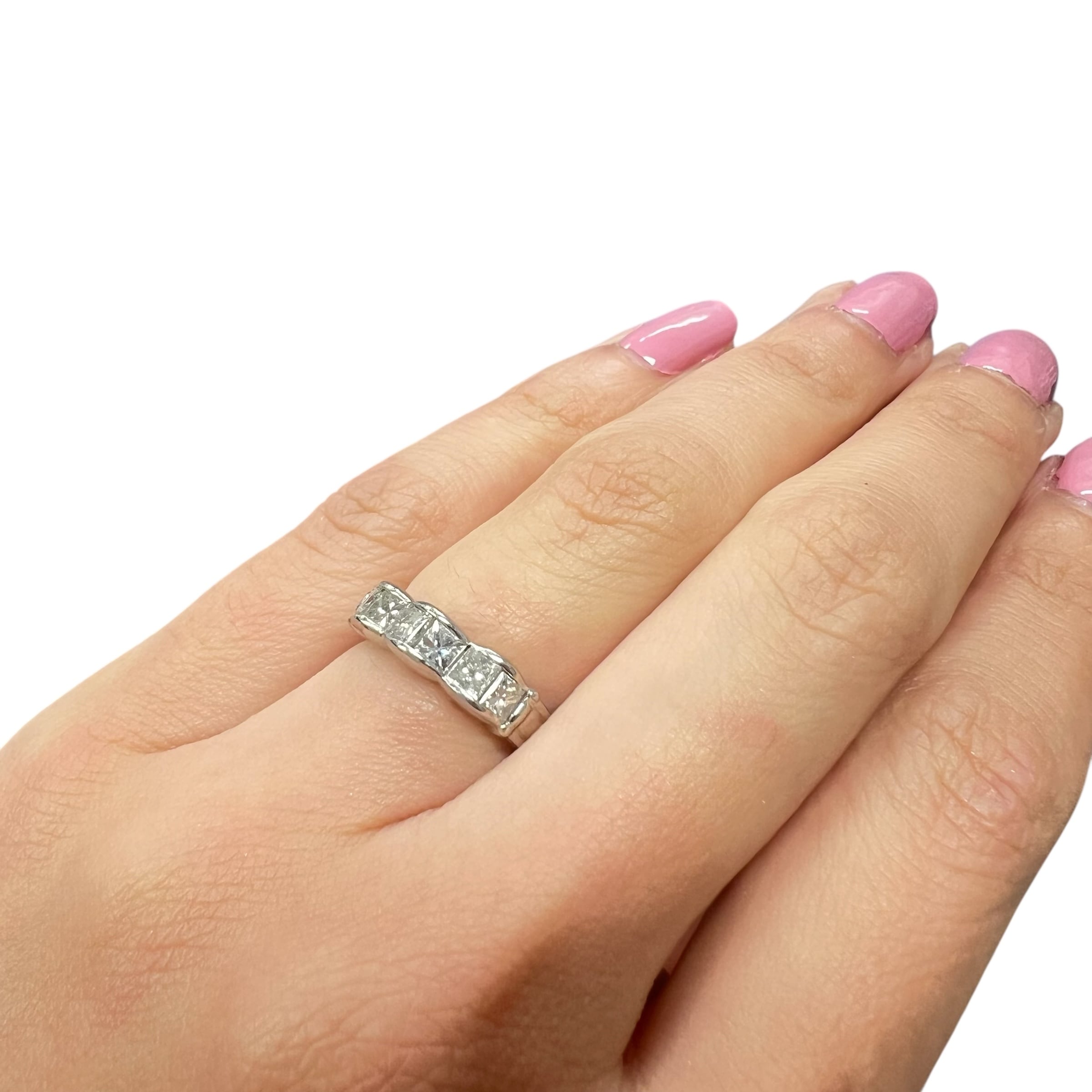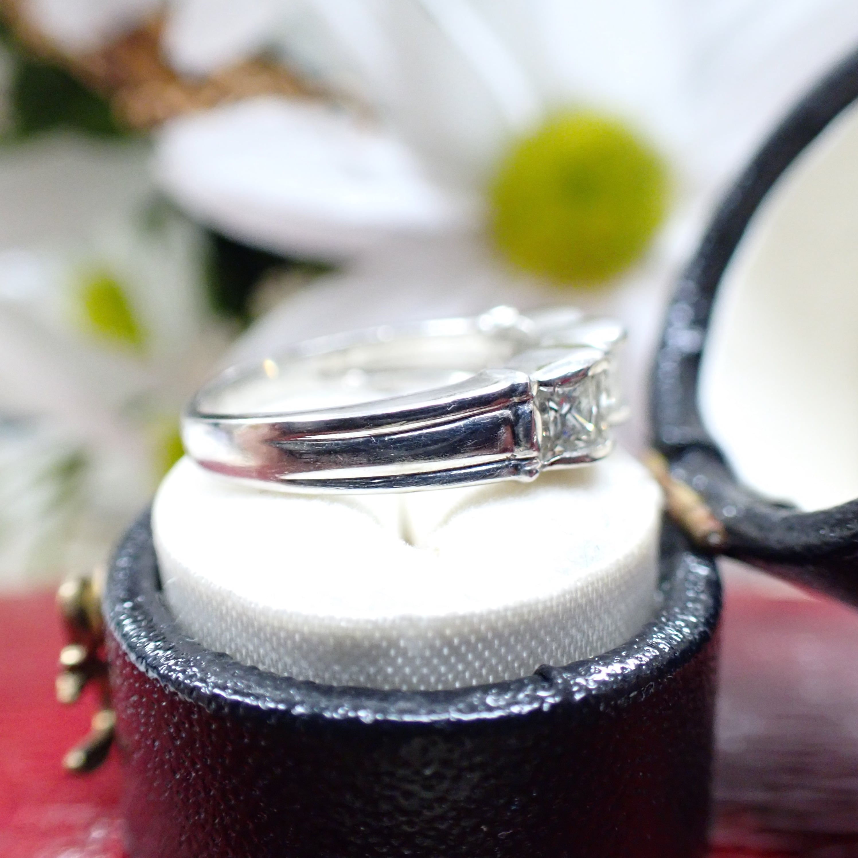 プリンセスカットのダイヤが、整いすぎない“変形配置”になっています。