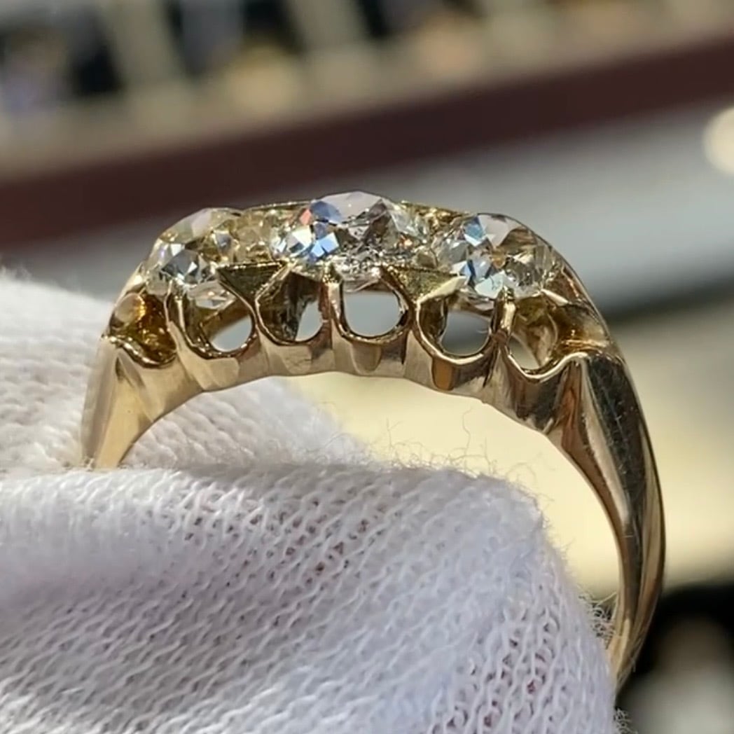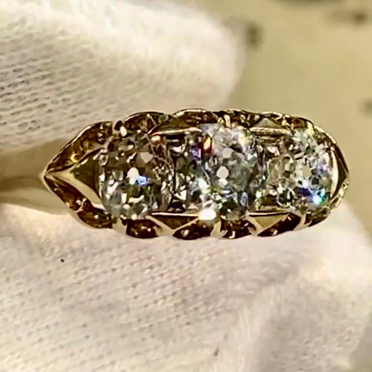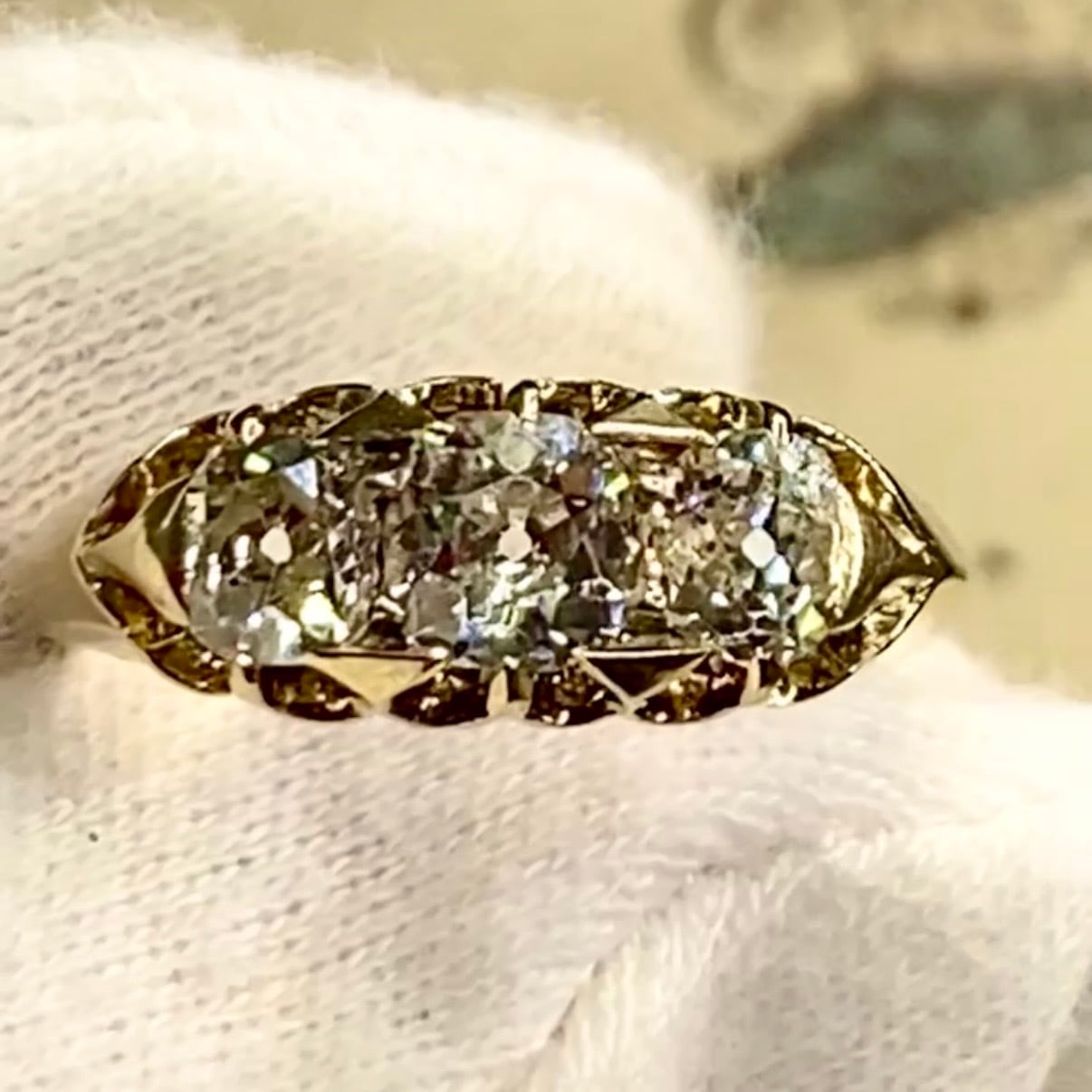 大きなオールドマインカットを3石セットしたアンティークリングをご紹介します✨