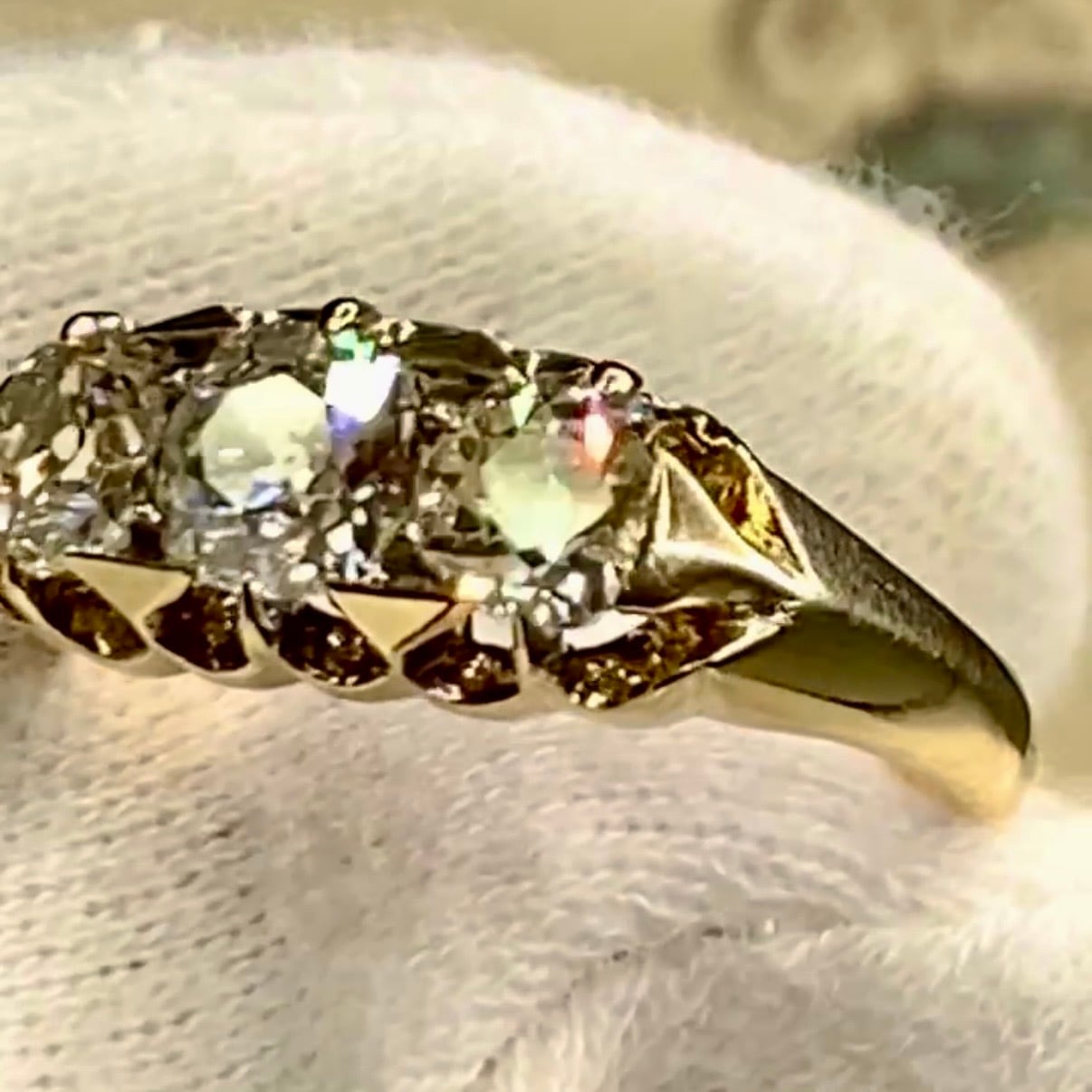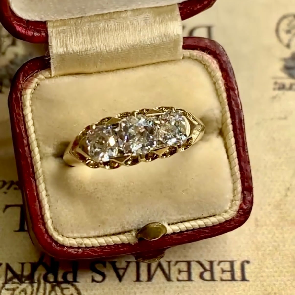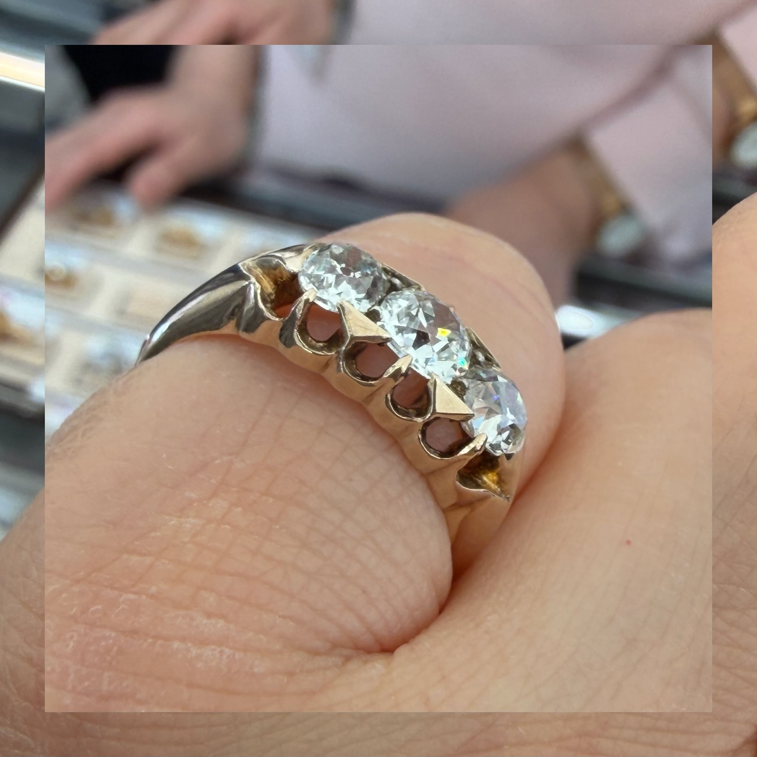 大きなオールドマインカットを3石セットしたアンティークリングをご紹介します✨