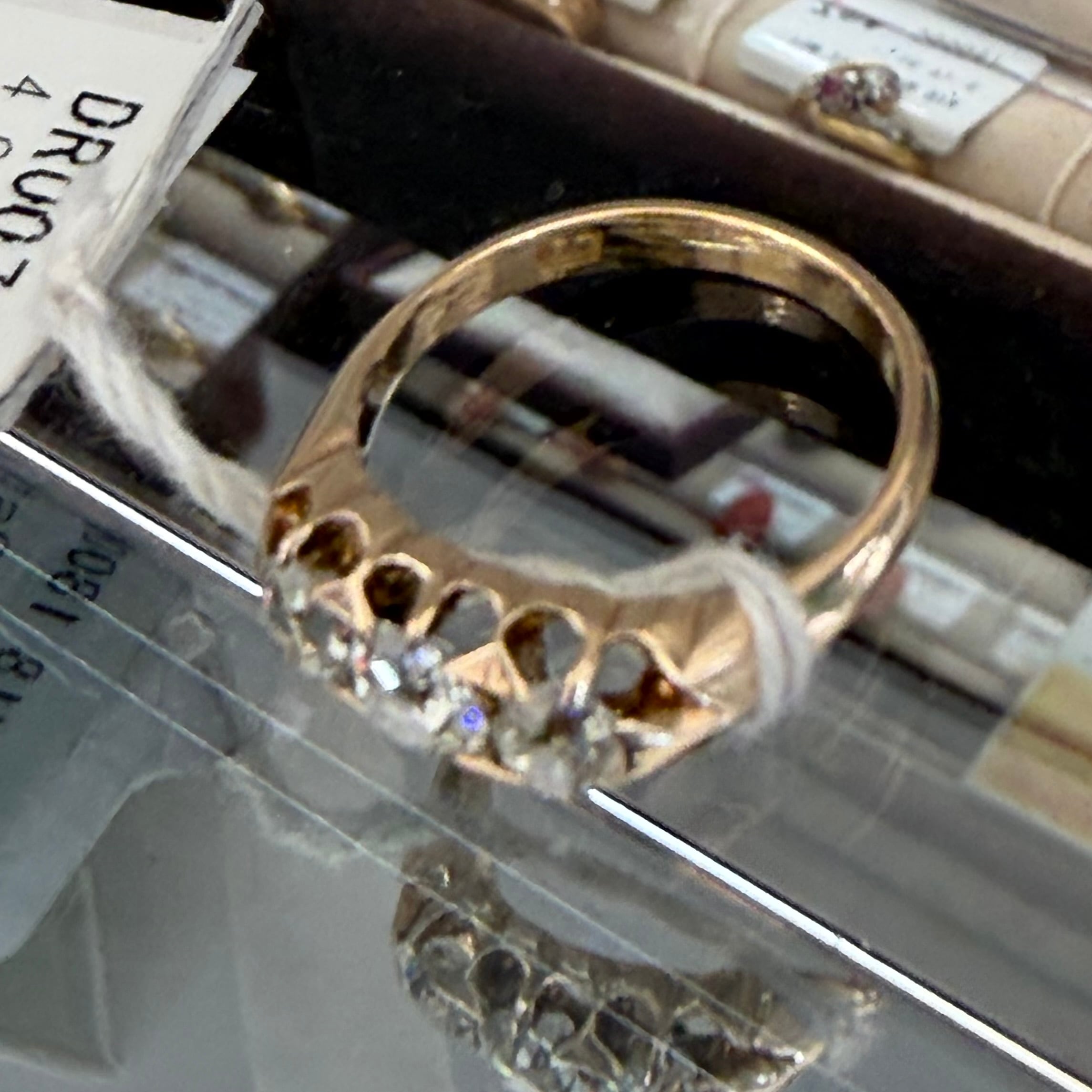 18金の豊かな地金にベルチャーセッティングされて、ちょこんと並ぶ3粒のオールドマインカットダイヤモンドたち。