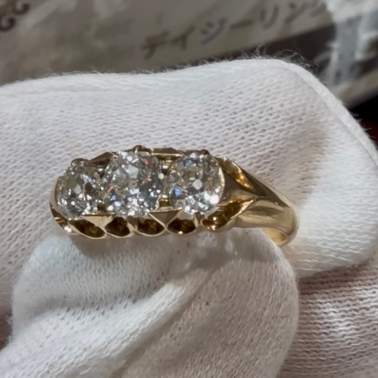 アンティーク ジュエリー イギリス K18 アンティークリング オールドマインカットダイヤモンド 約1ct 3石 トリロジー ベルチャーセッティング 1800年代後半 DR00740 Daisy Ring