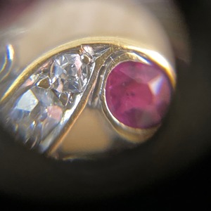 天然の可愛らしいラズベリーピンクのルビー2pcとオールドマインカットという古いカットのダイヤモンドが3pc留められています。