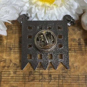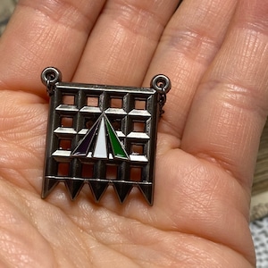 庶民院(刑務所)のシンボルである、鎖につながれた門の落とし格子に、 太い矢印(有罪判決の意味)が、緑・白・紫のエナメルで描かれています。