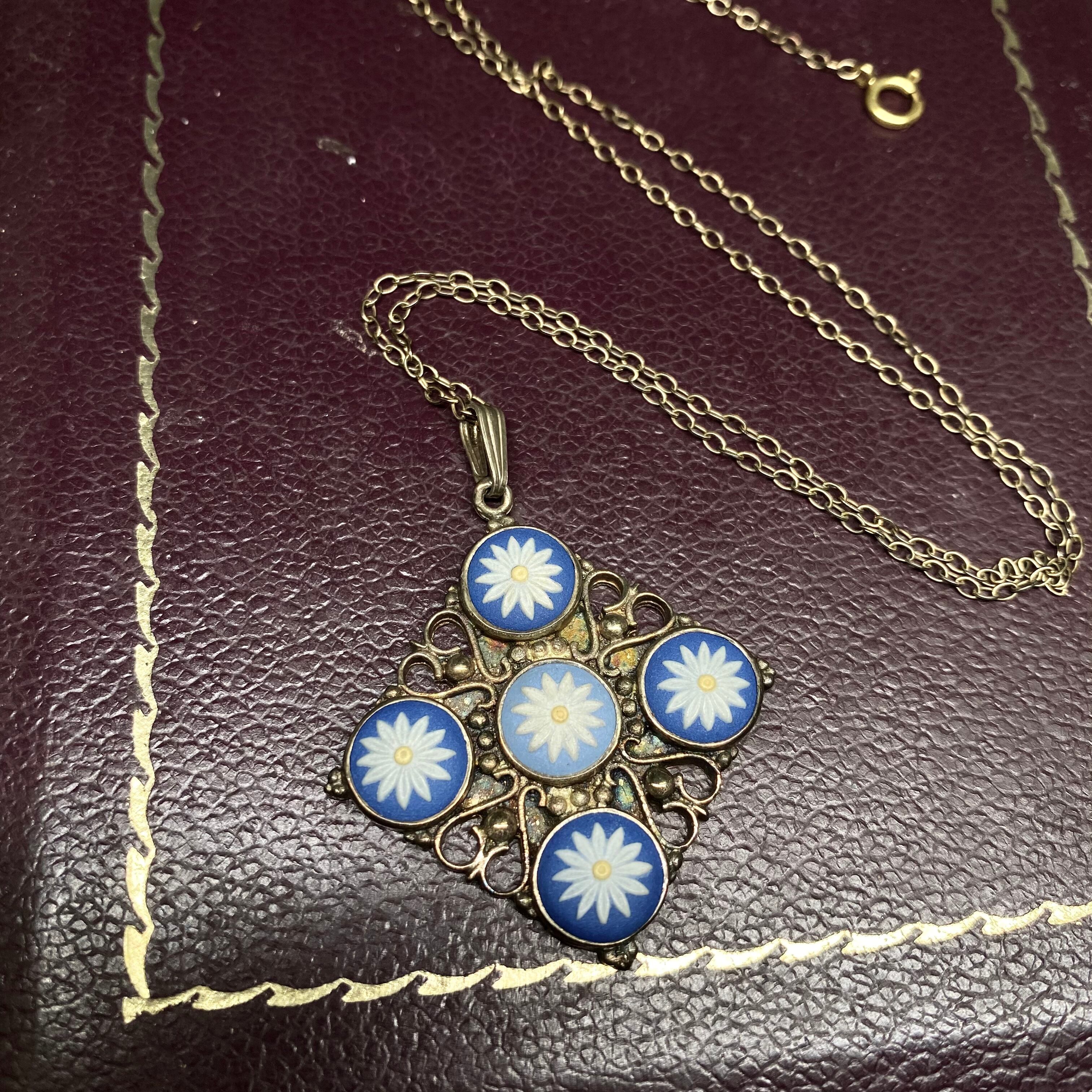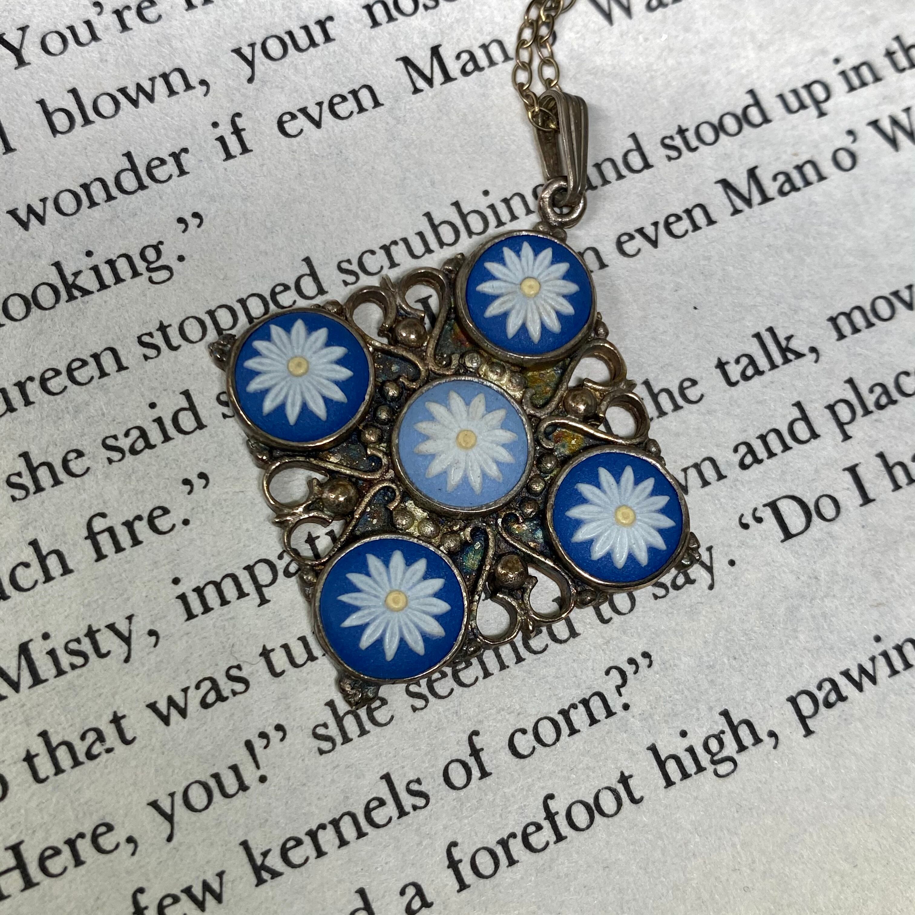 イギリスヴィンテージシルバーペンダントトップ ブルーの下地にデイジーのお花(*´-`)