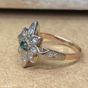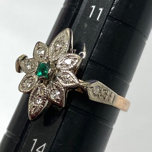 【エメラルドSALE5/31まで】ヨーロピアン アンティークリング アールデコ 縦長お洒落デイジーリング? 指輪 ダイヤモンド エメラルド