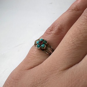 石はターコイズと赤石でその色の組み合わせがとても可愛らしく、落ち着いた金の色味をパット華やかにしてくれています。