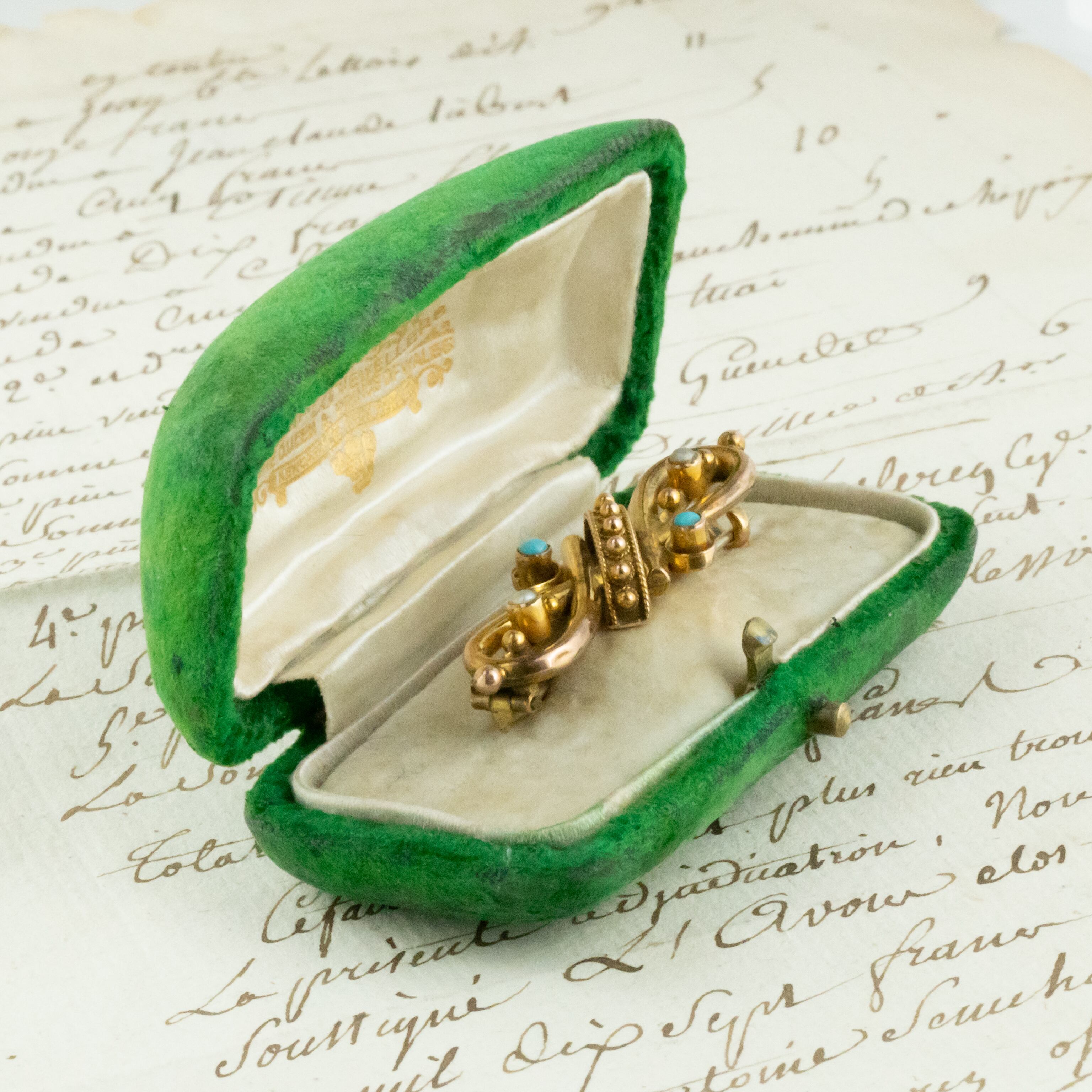 イギリス アンティークブローチ 1800年後半頃 パール ターコイズ グラニュレーションが上品な作品 DBR00089
