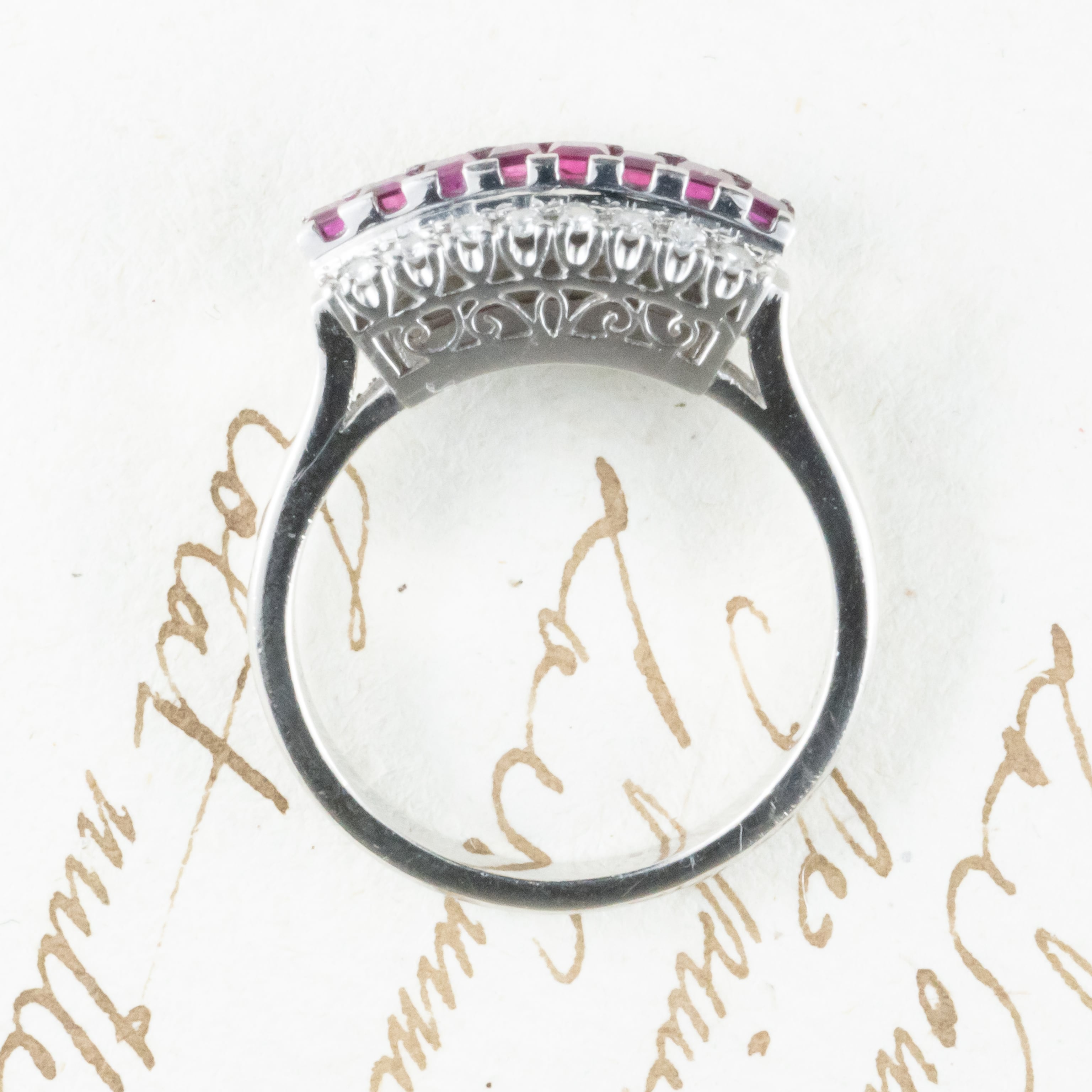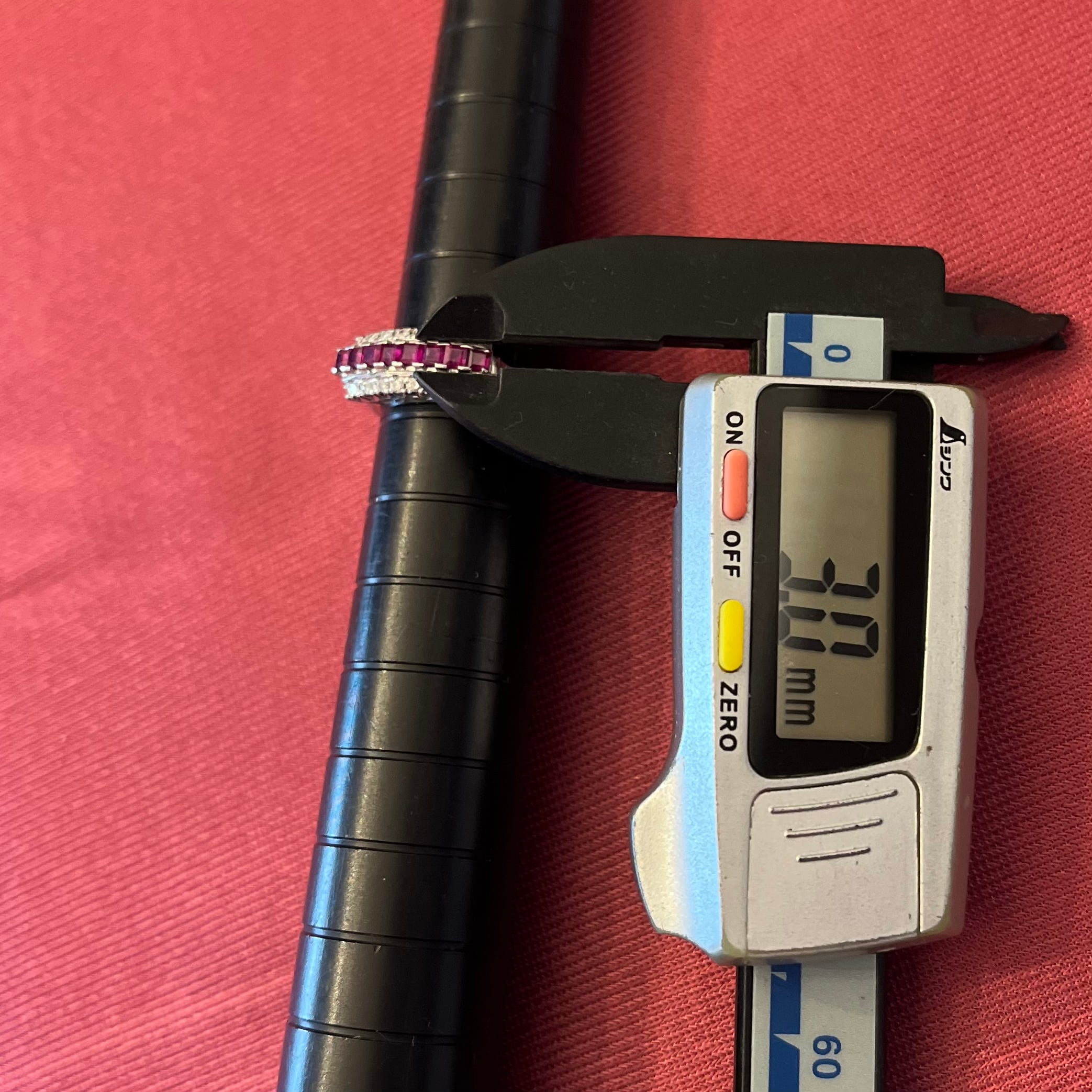 ステップカットのルビーがセンターにセットされていて、一文字の直線的な魅力を存分に発揮していますね。