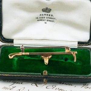 フォックスハンティング(狐狩り)モチーフのブローチは、ヴィクトリアン時代から人気の高いアイテムの一つでした。キツネ狩りは2004年に禁止法が出来て禁止になりましたが、16世紀頃から、品格ある上流階級の格式高いスポーツとして、王族や貴族に嗜まれていました。狐は、狩の成功を祈るラッキーモチーフとして人気を集め、男性だけではなく女性のジュエリーデザインとしても人気が拡がっていきました。大切な人が無事に帰ってくるように、という祈りを込めて、大切な恋人に渡すロマンスアイテムとしても人気を集めました。