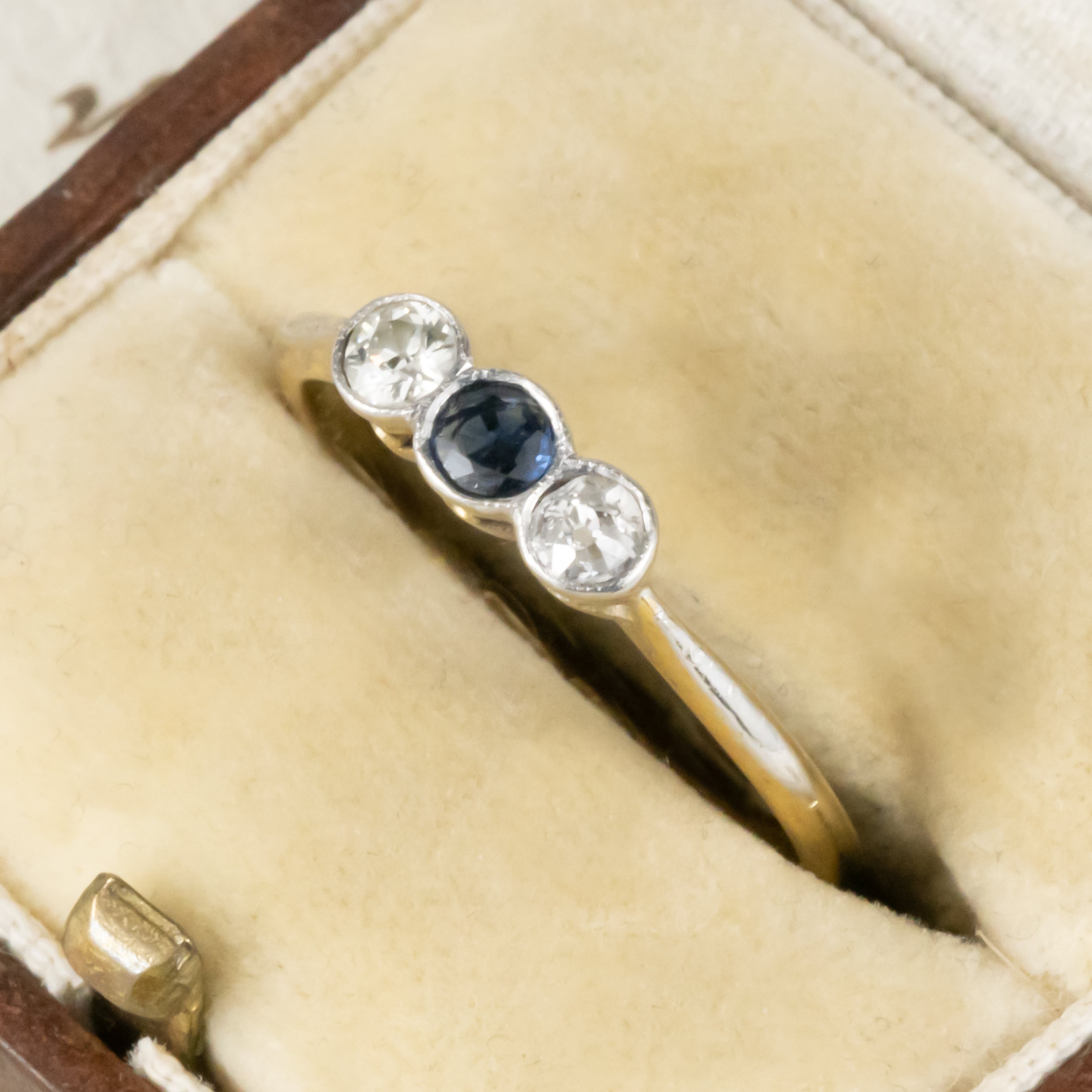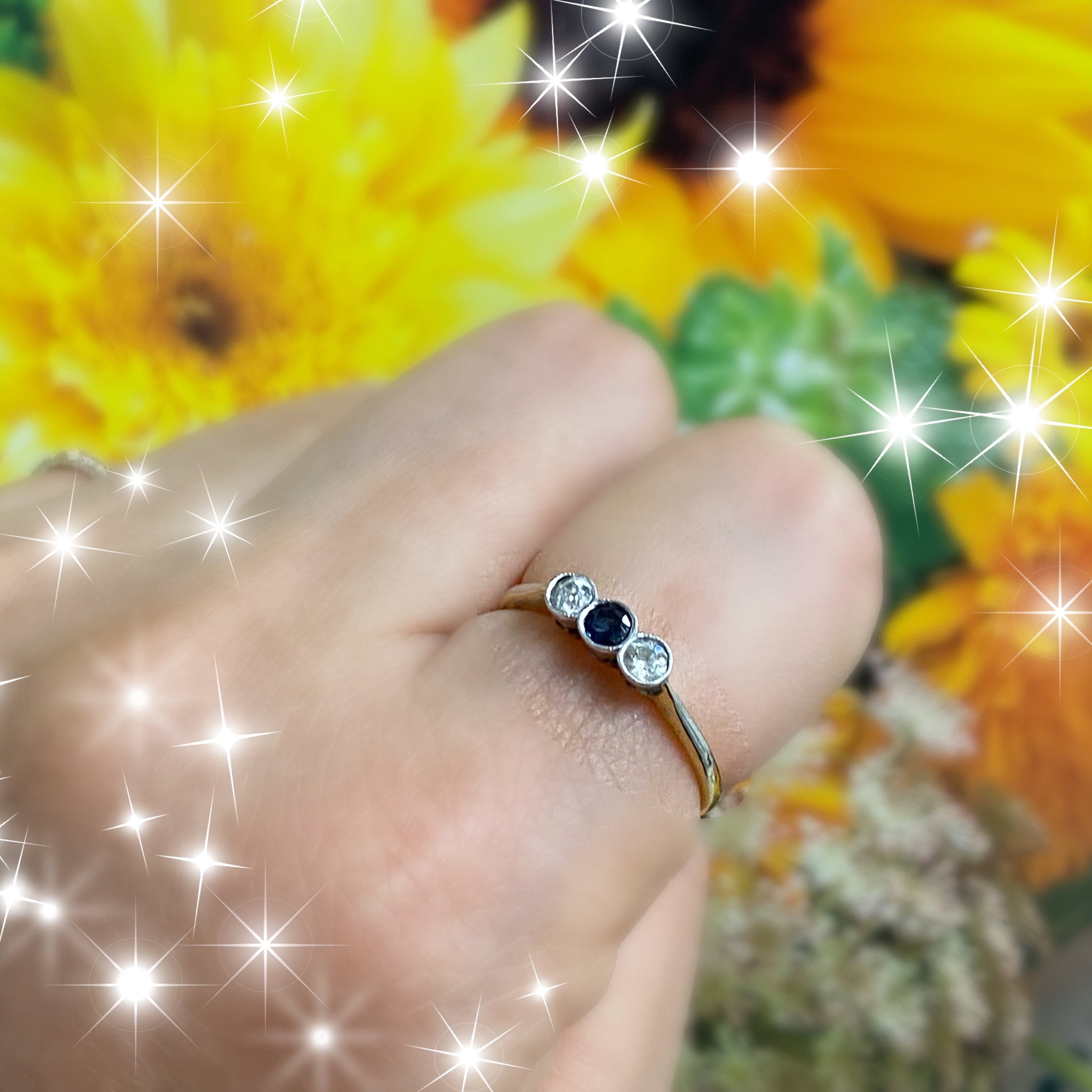 センターに落ち着いたお色味のサファイア、両サイドに美しいオールドヨーロピアンカットダイヤモンドがセットされています。