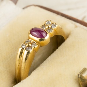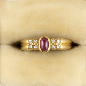 センターにはカボションカットのルビー、その東西に花に見立てたように4石づつのダイヤがセットされていて、大人な可愛さを演出するかのような作品です。