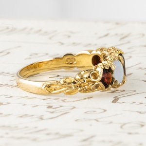 ガーネットとオパールがセットされた横一文字デザイン。デザイン的には1800年後半頃よく見られたものですが、定番のデザインとして長く愛されてきており、ヴィンテージといってもアンティーク感やクラッシックさ、伝統を感じることのできる作品です。