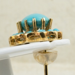 シャトンデザインなどの特徴からヴィンテージ品かと思われますが、真ん中が高く、周りの取り巻きの石が一段下にセットされているデザインはどこか懐かしさの様なレトロさを感じ、ターコイズの青一色がとても爽やかで目を引く作品ですね。
