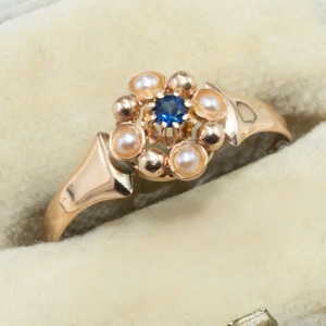 フランス K18アンティークリング〜まるでロイヤルブルーカラーの美しい小さなブルーサファイアと取巻きの可愛いパールたち〜DR00578