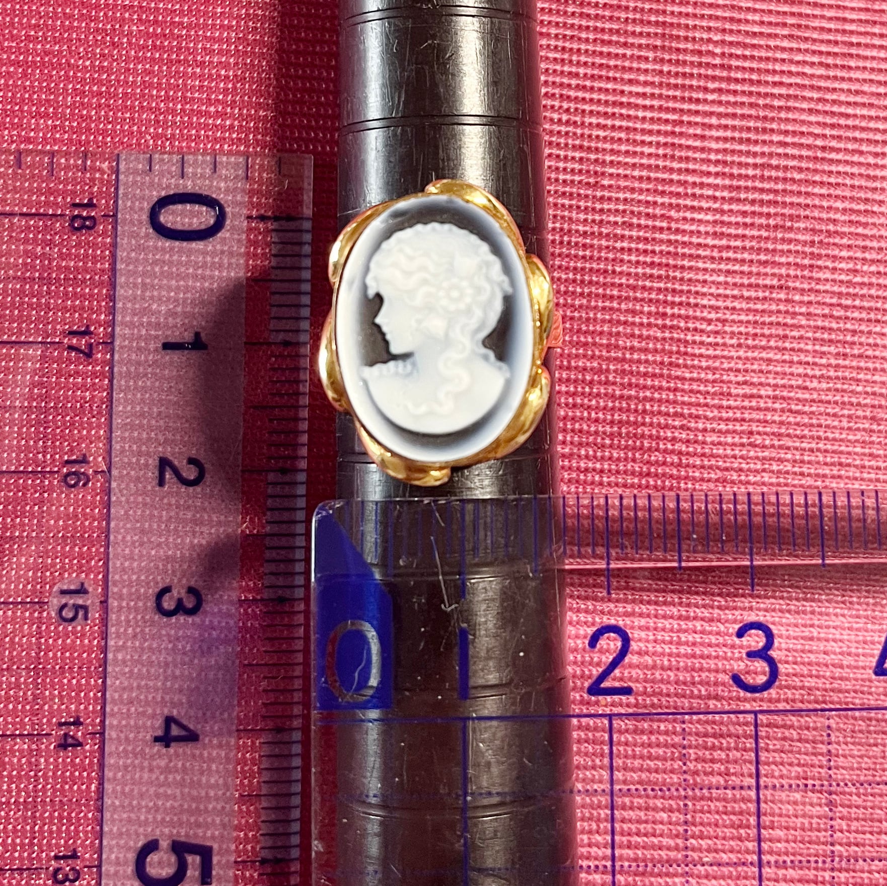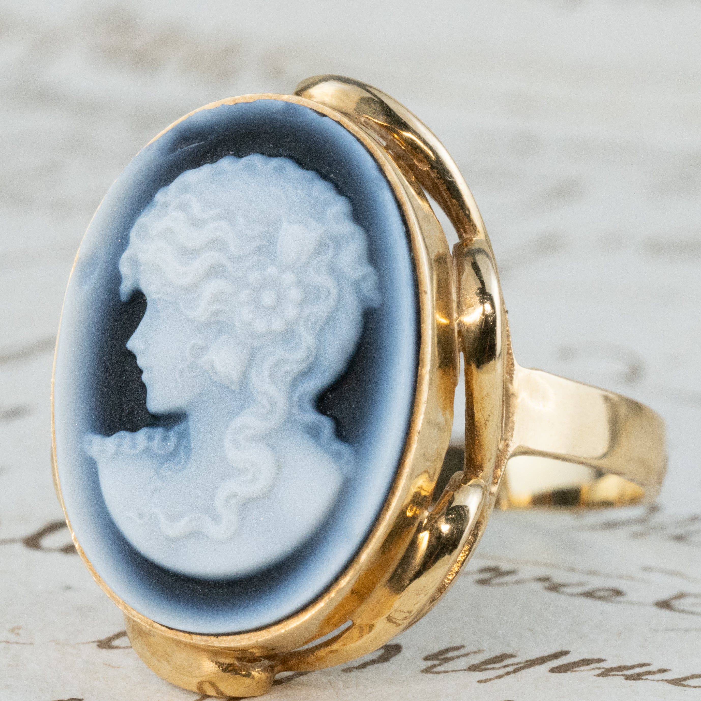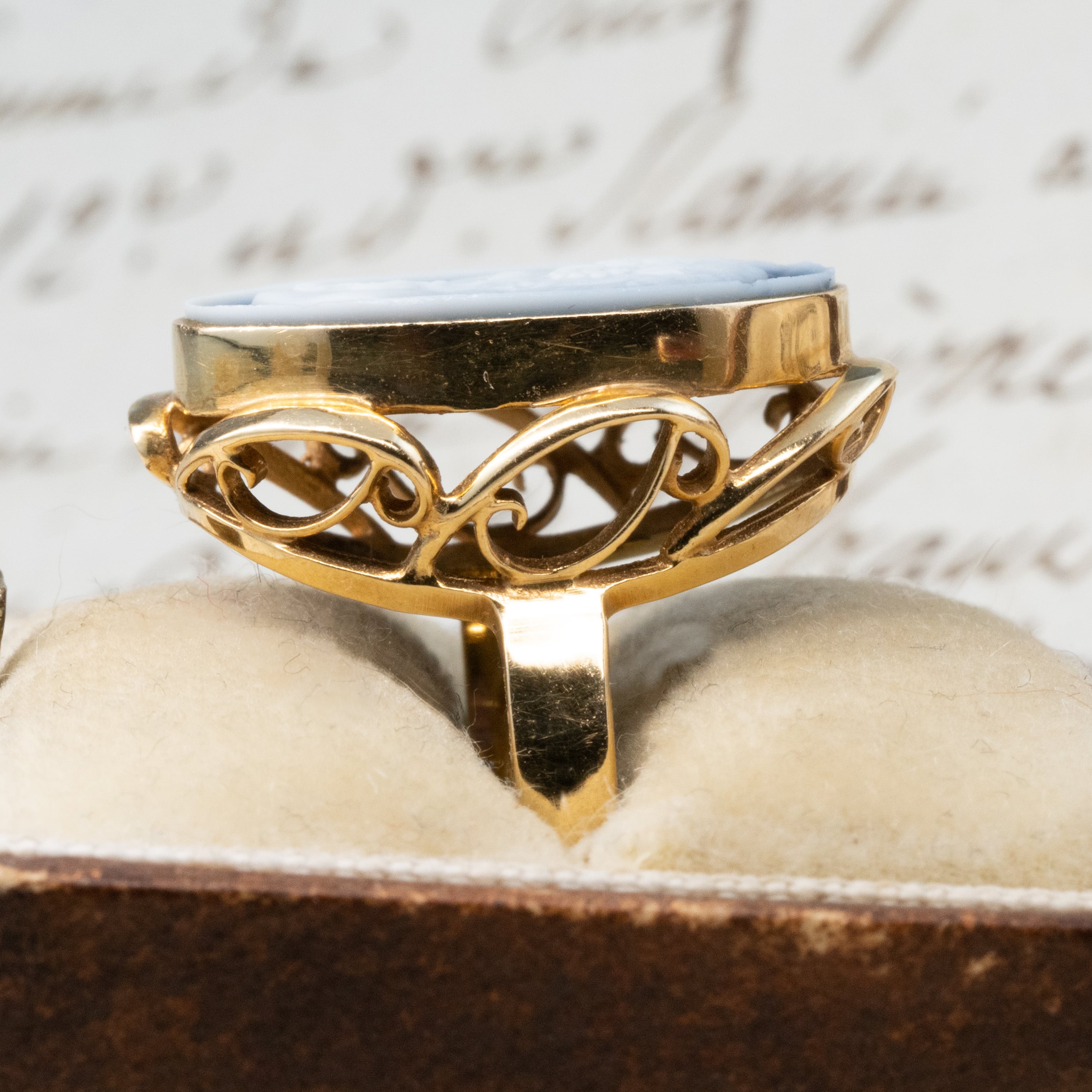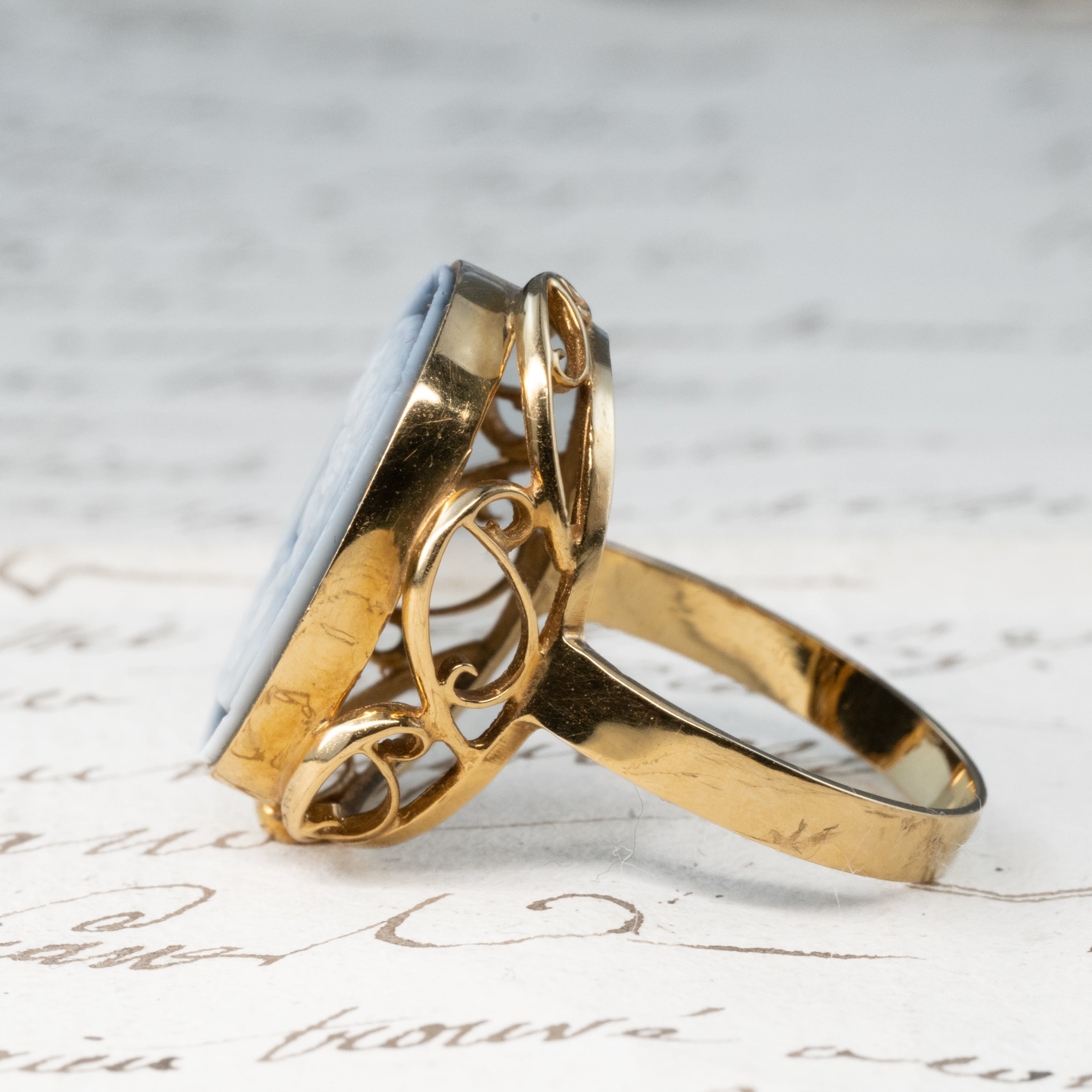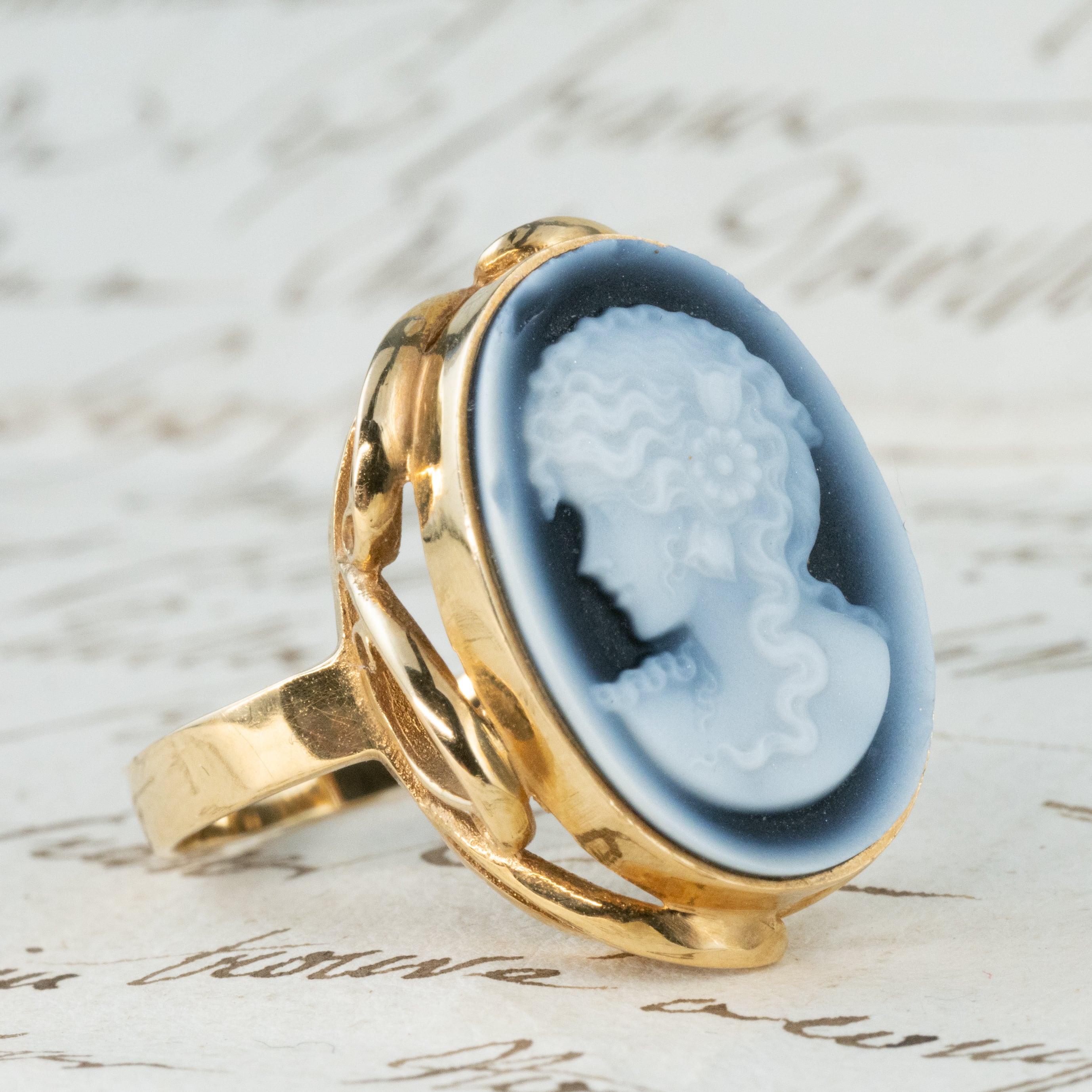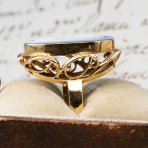 カメオを取り囲む透かしは、指の角度によって光が反射して、彫刻と金細工の美が響き合います。