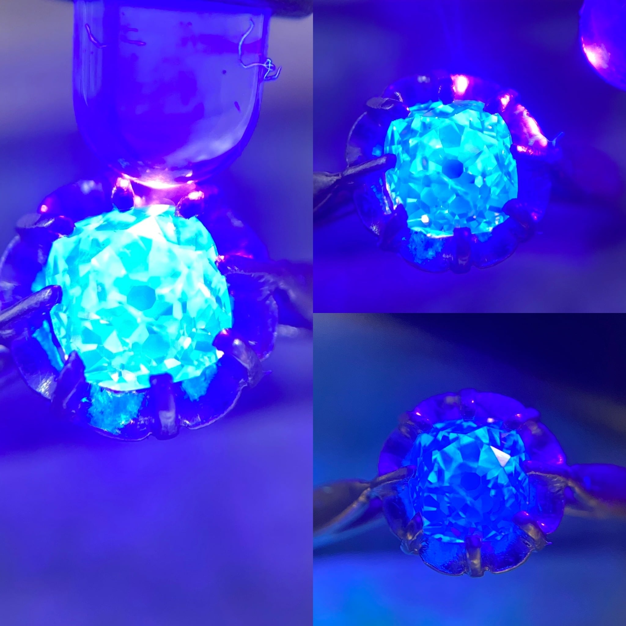 さて。個性と言えば、このダイヤ、UVライト(紫外線ライト)を当てるとピカピカっと蛍光する別の顔を持っています☆数枚載せた画像をご覧くださいませ。