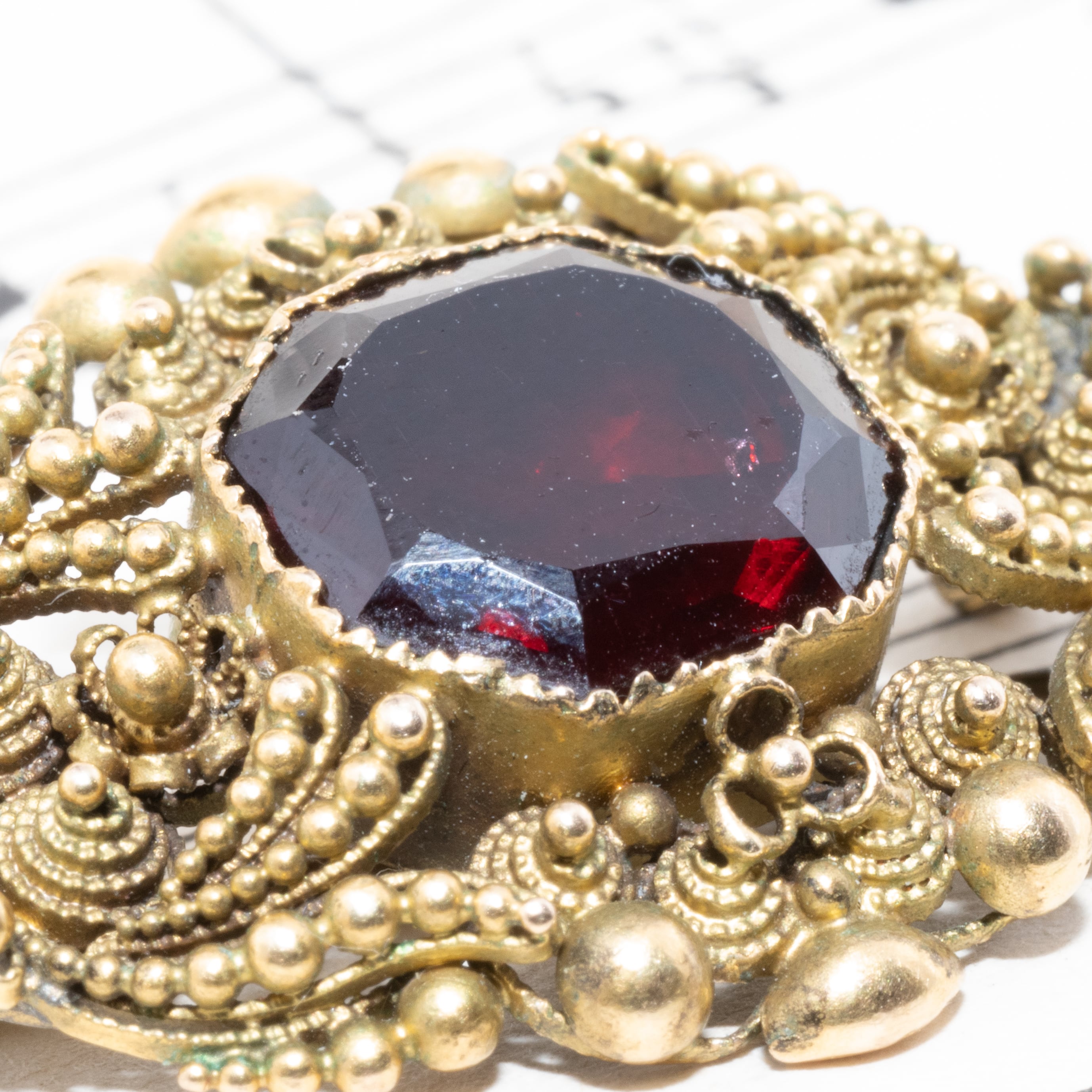 中央には、フラットにテーブルカット(アンティークカット)されたガーネットが留められており、周囲のカンティーユ技法の彫刻によってその魅力は増し、深みのある赤色が一層引き立てられています。