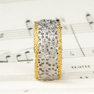 こちらの指輪はとても細かな透かしが施されていますが、フィレンツェ彫りと言われるイタリアのルネサンス期からの伝統的な技法による作品です。
