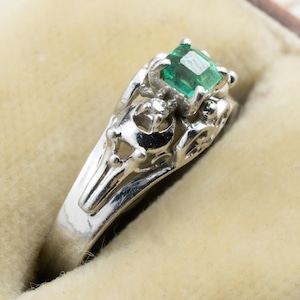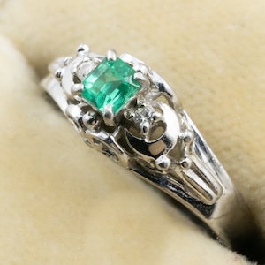 【日本の作品】昭和レトロ デザイン ヴィンテージ リング Pt900 エメラルド ダイヤモンド 三日月のような透かしが魅力的 MOR00593